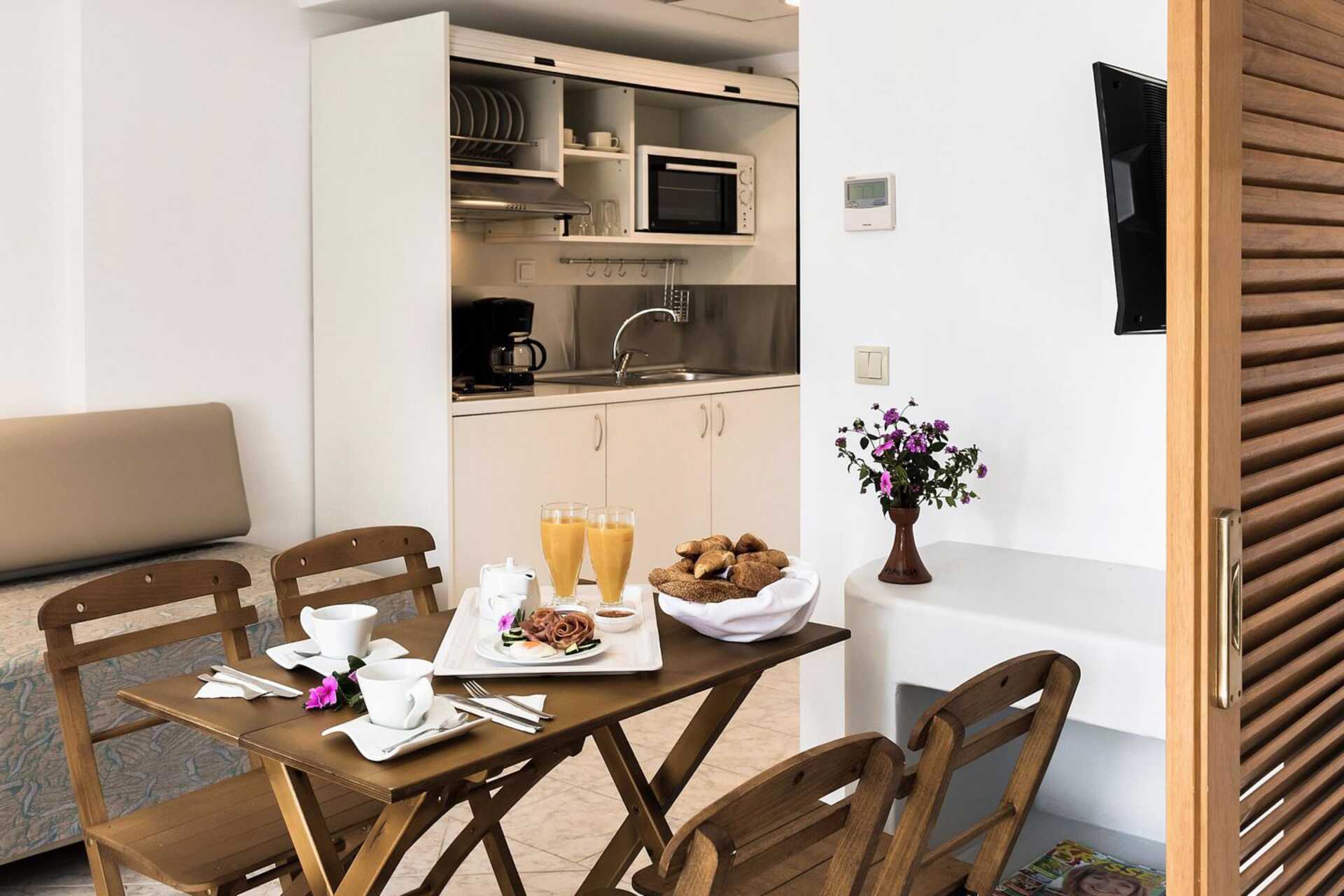 Tvårumslägenhet med balkong. Lägenheterna är inredda i olika stilar och färger. Sovrum och kombinerat vardagsrum med minikök. Rummen skiljs åt med skjutdörrar med spjälor. En dubbelsäng. Möjlighet med extrabäddar i en dubbelsäng. Minikök med kokplattor, kylskåp och enkel köksutrustning. Wifi och deponering ingår. Luftkonditionering ingår i perioden juni till september. Tv med internationella kanaler. Hårtork. Badrum med dusch och wc. Städning 7 ggr/vecka.