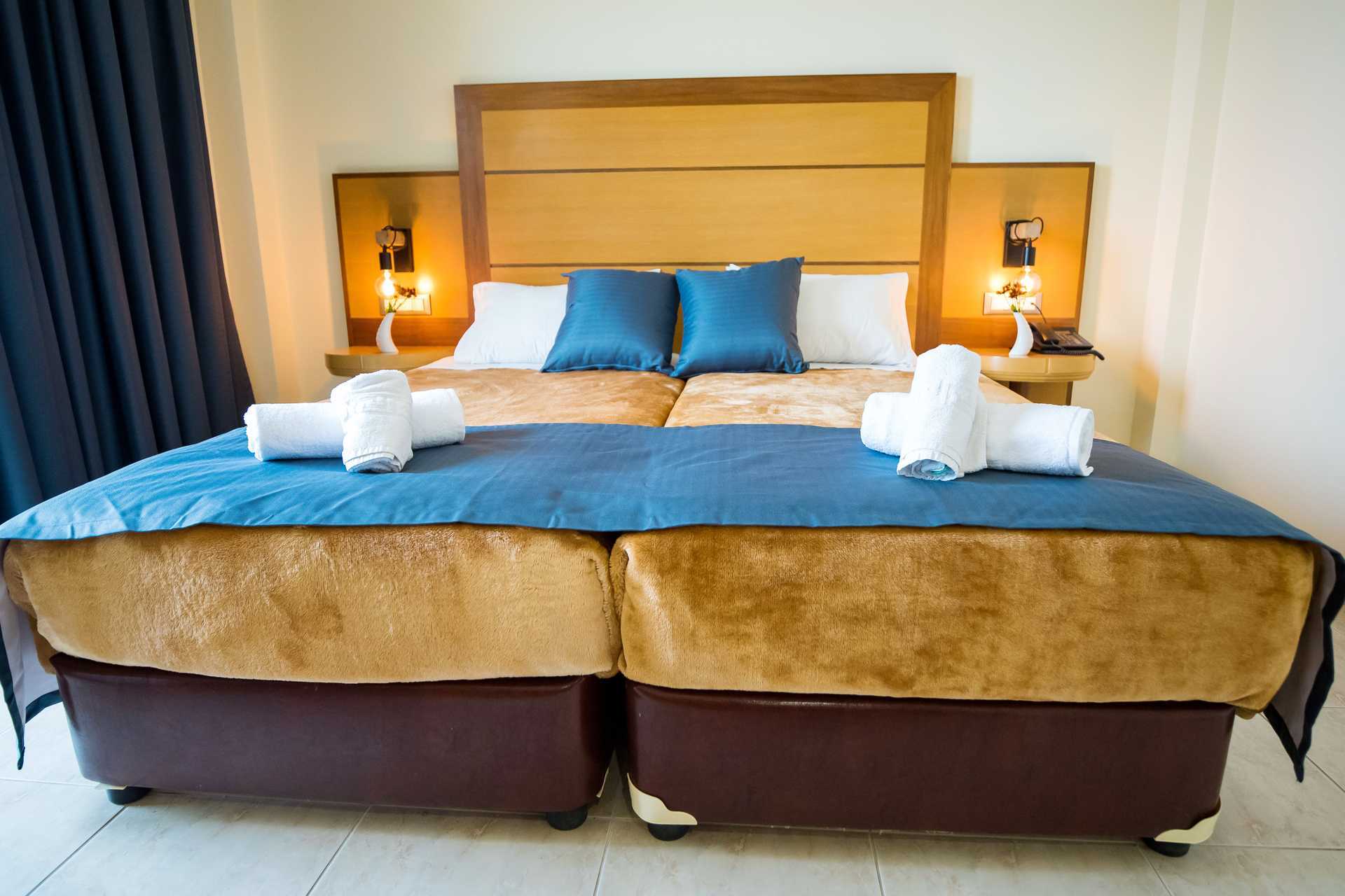 Dubbelrum med balkong. Två enkelsängar - kan inte separeras eller flyttas. Möjlighet till extrabädd i hopfällbar säng. Wifi ingår liksom centralstyrd luftkonditionering i perioden 15/5-15/10. Deponering mot avgift. Kylskåp. Tv med internationella kanaler. Hårtork. Badrum med badkar eller dusch samt wc. Städning 7 ggr/vecka.