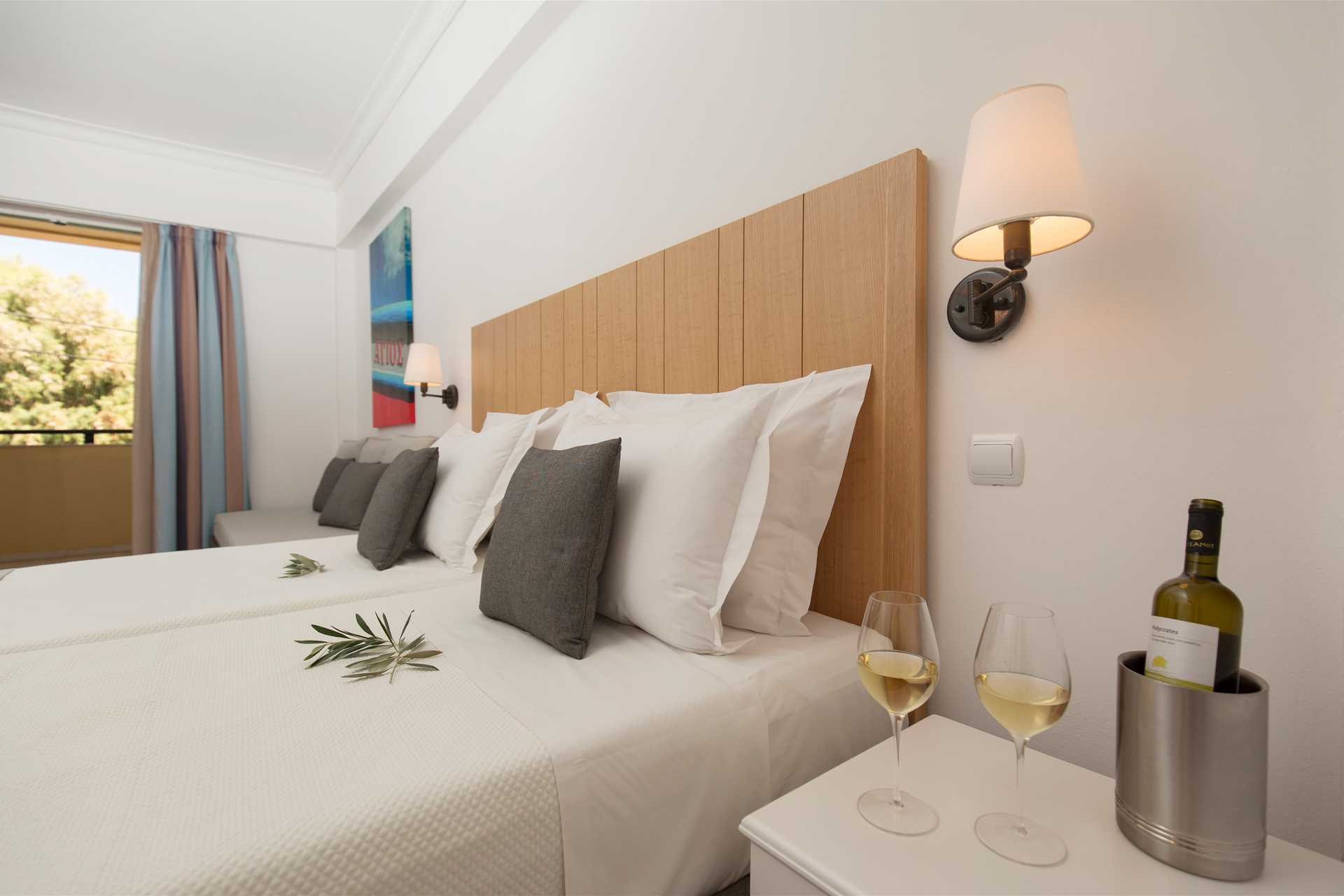 Dubbelrum med balkong, vissa med begränsad havsutsikt. En dubbelsäng eller två enkelsängar. Möjlighet till extrabäddar i bäddsoffor. Wifi, luftkonditionering och deponering ingår. Kylskåp. Tv med internationella kanaler. Hårtork. Badrum med badkar eller dusch samt wc. Städning 6 ggr/vecka.