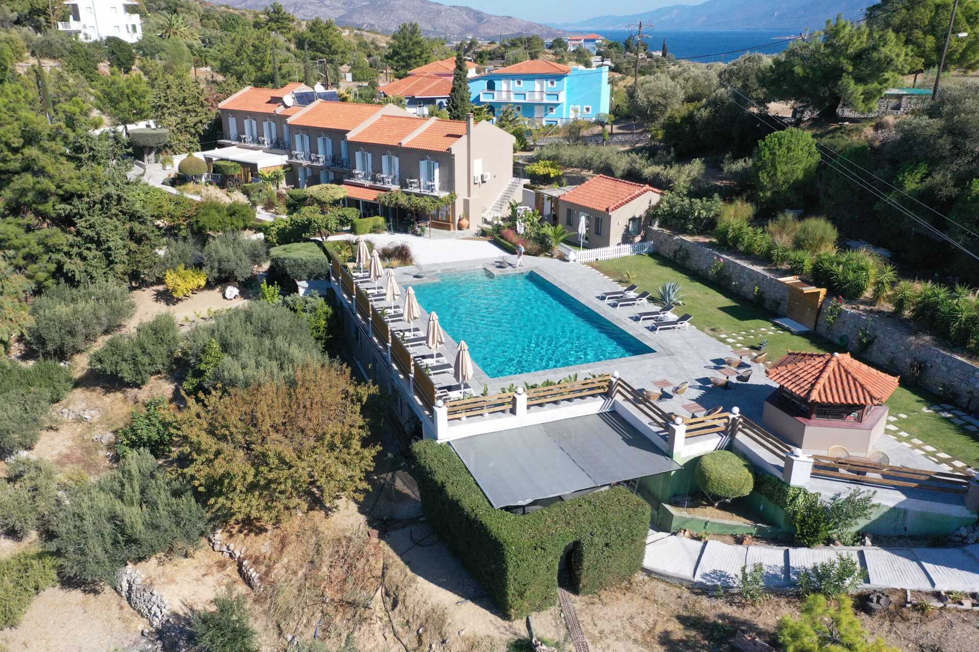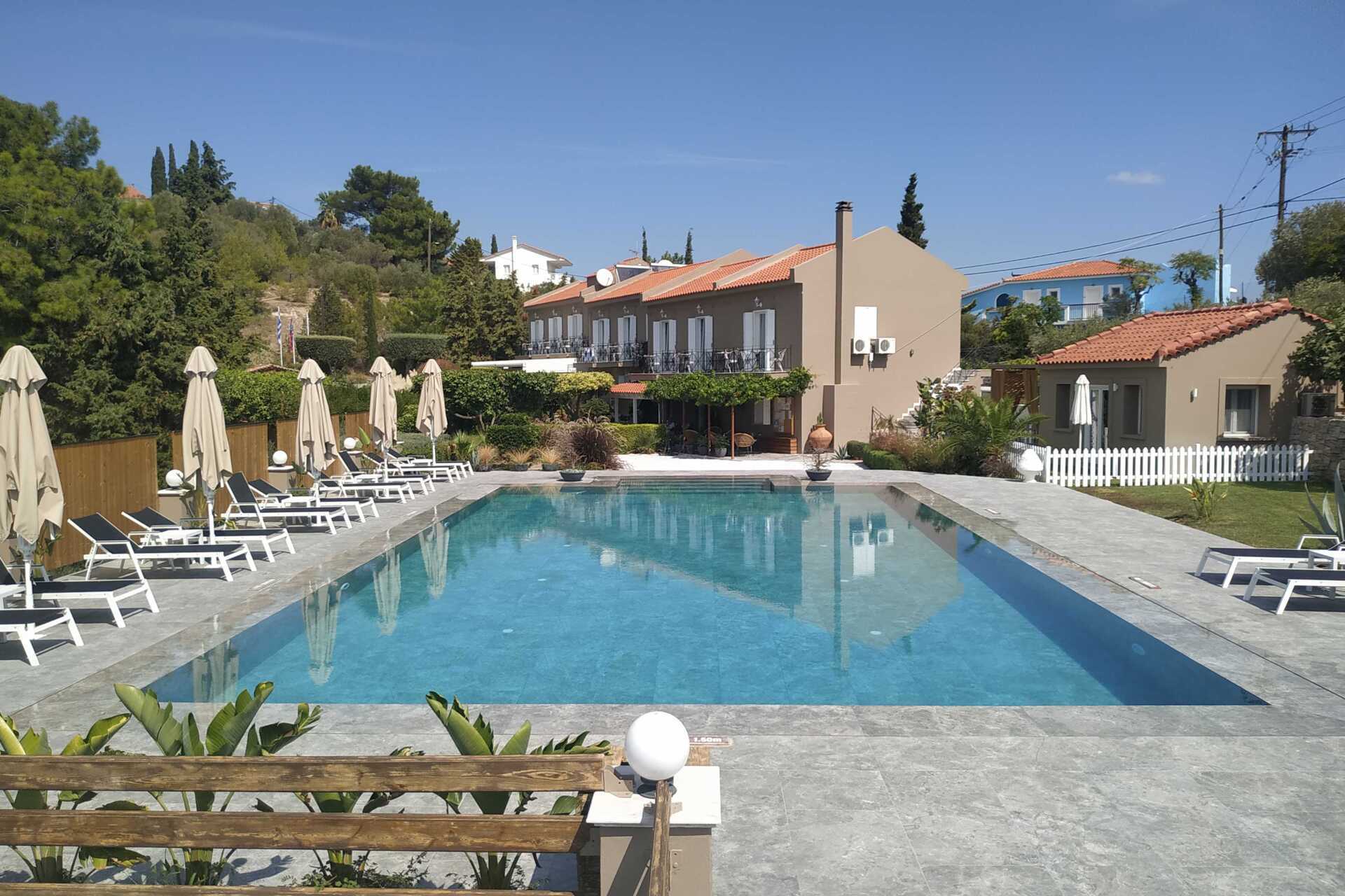 Helheten. Läget. Lugnt. Trädgården och poolområdet. Balkongen och utsikten. Alltid hjälp om vi behövde av ägaren Kostas och fantastiska Louisa.