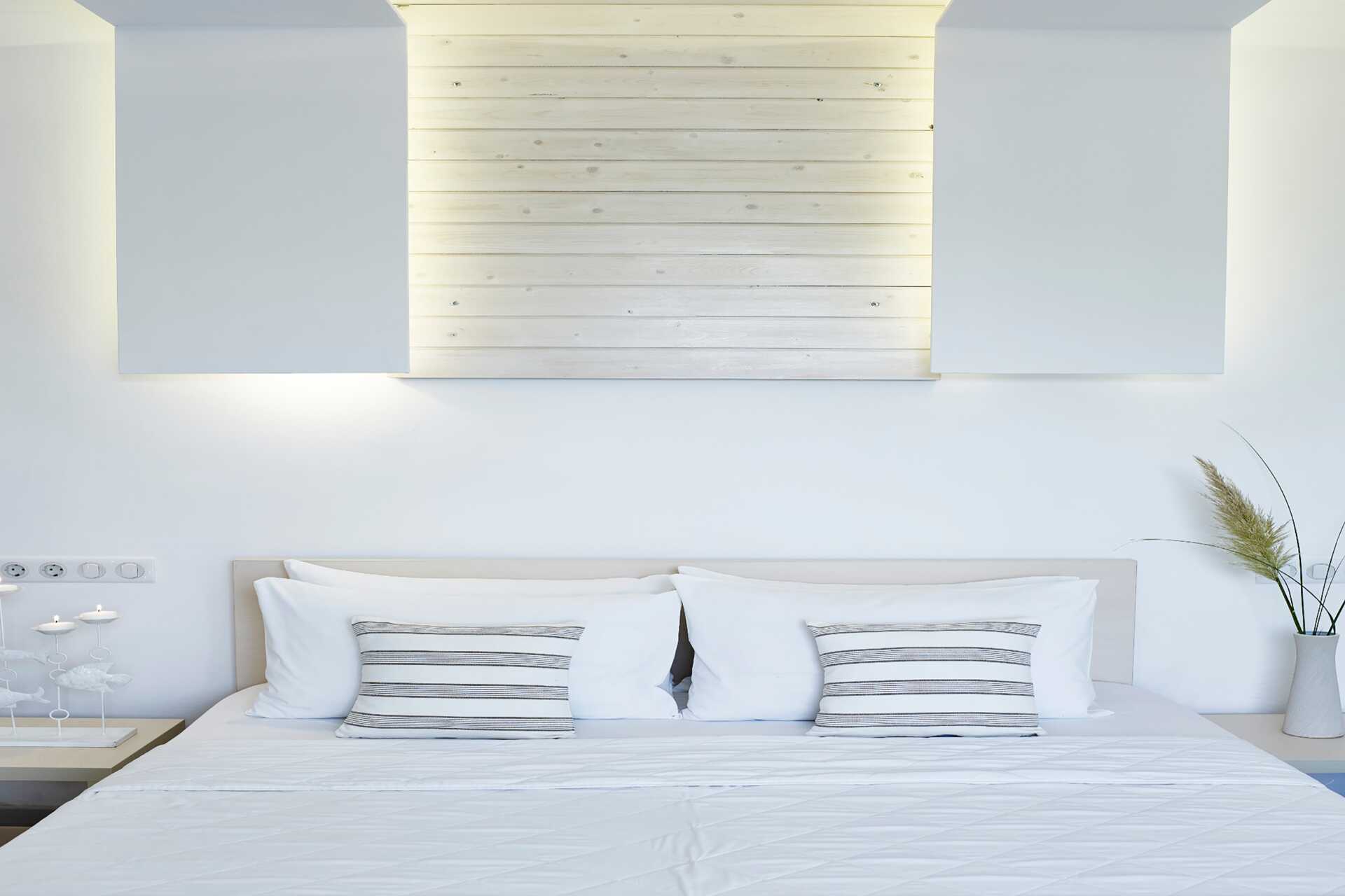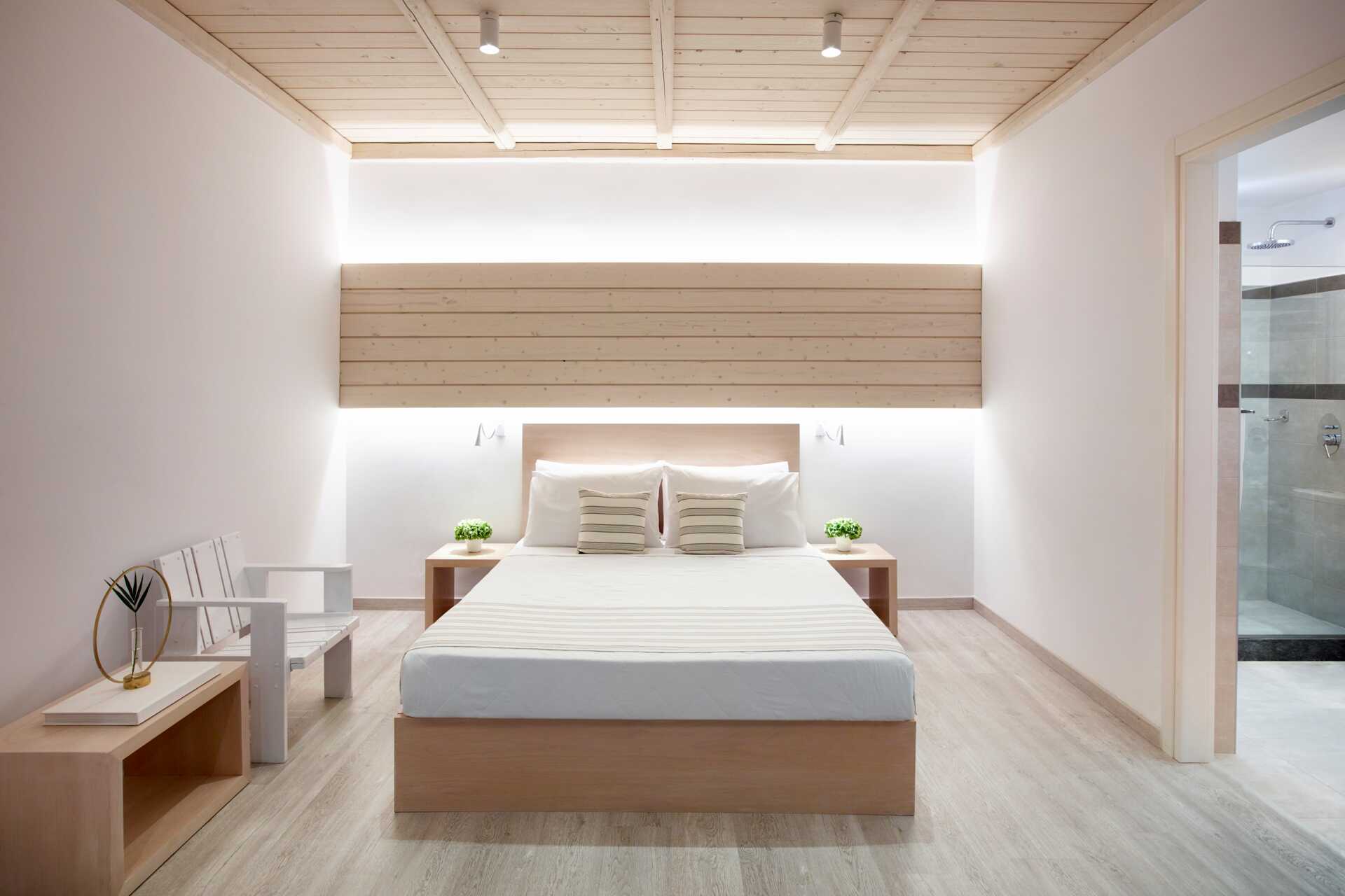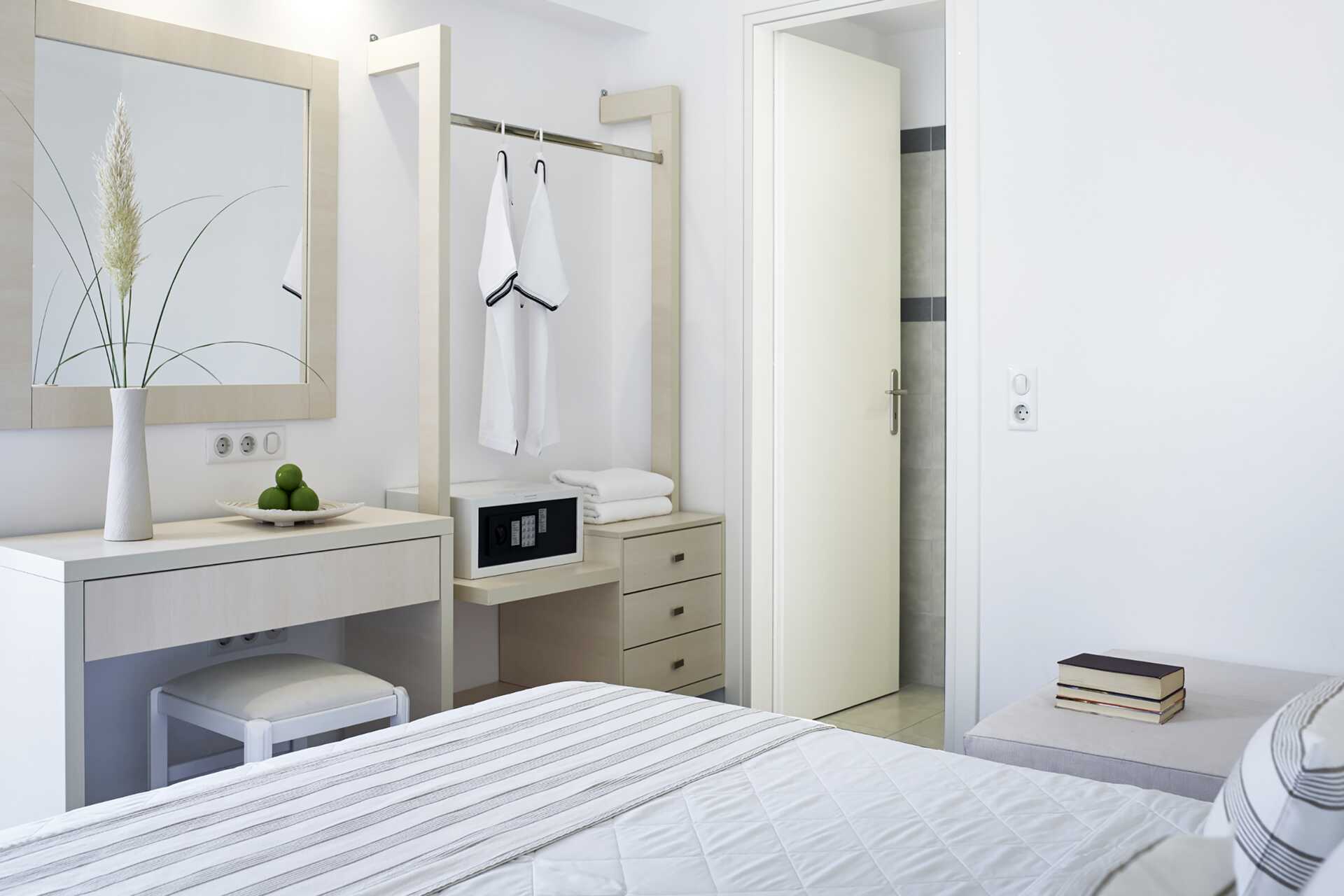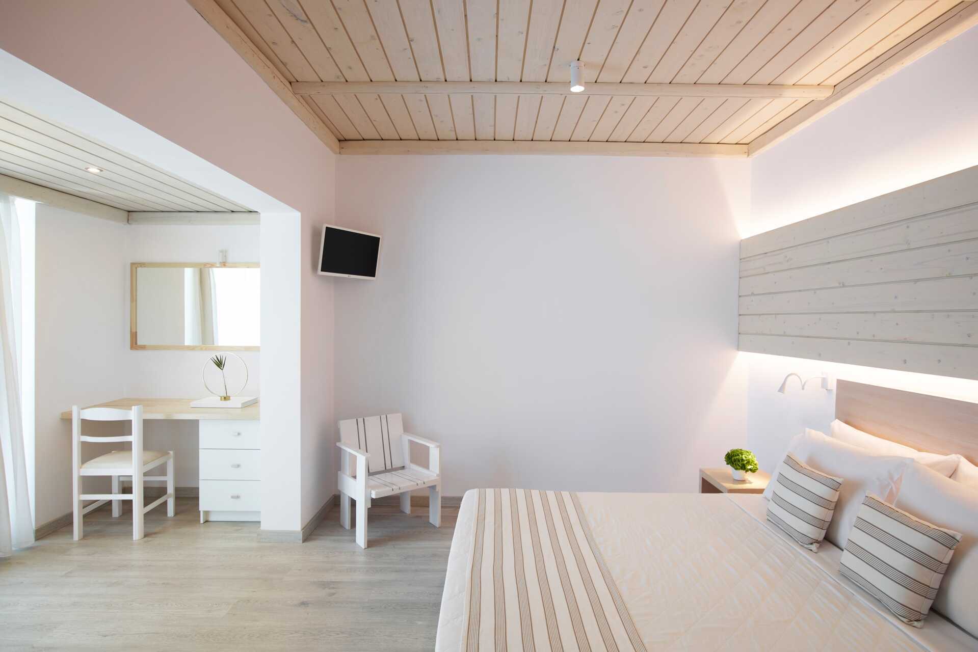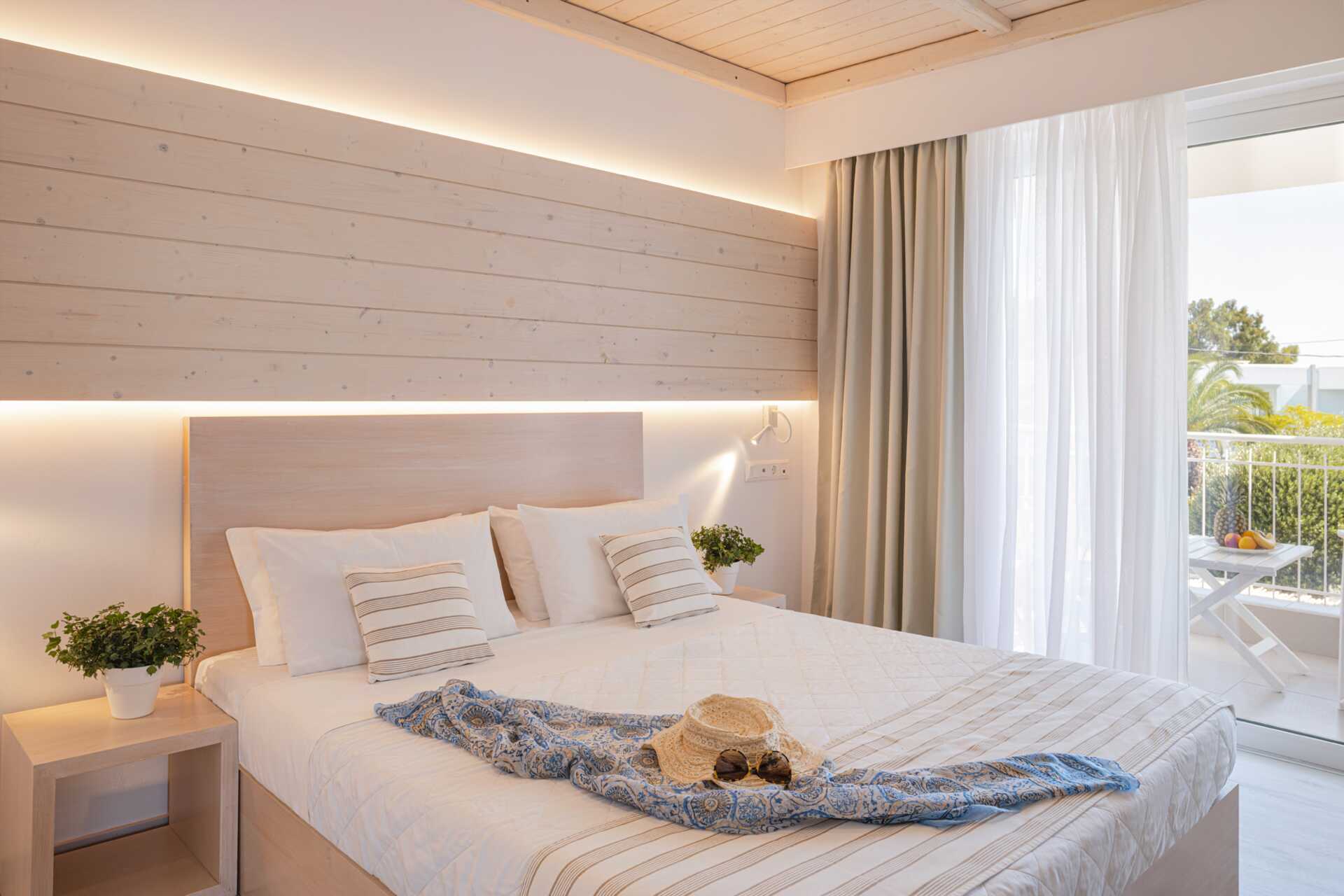 Dubbelrum med balkong och begränsad havsutsikt. Rummen ligger i huvudbyggnaden eller i de bungalowliknande byggnaderna i trädgården. En dubbelsäng eller två enkelsängar. Wifi, luftkonditionering och deponering ingår. Kylskåp. Tv med internationella kanaler. Hårtork. Badrum med dusch och wc. Städning 7 ggr/vecka.