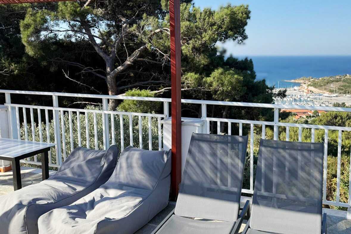Saknade vattenkokare på rummet att kunna fixa eget kaffe. Bara ett lågt räcke mellan balkonger. ”Fri insyn”.