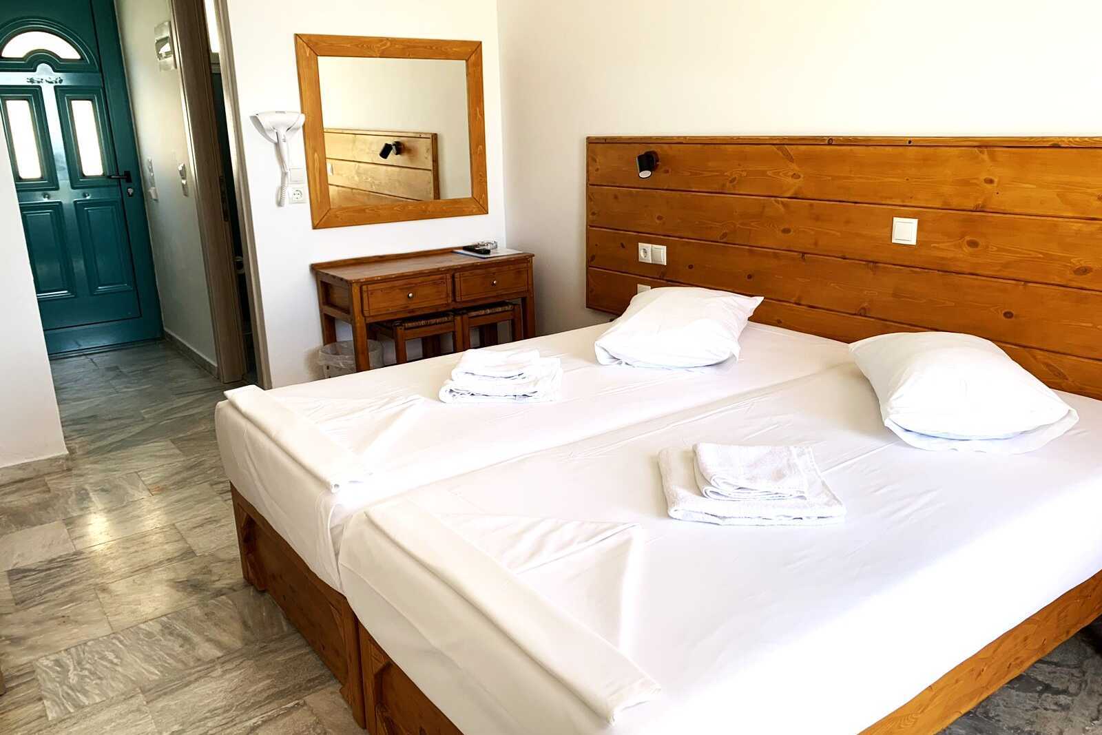 Renoverade dubbelrum med markterrass och begränsad havsutsikt. Rummen har fått en uppfräschning inför sommaren 2025 med bland annat nya sängar. Två enkelsängar. I vissa rum finns möjlighet till en extrabädd. Wifi och luftkonditionering ingår. Deponering mot avgift. Kylskåp. Tv med lokala kanaler. Badrum med dusch och wc. Städning 6 ggr/vecka. Barn under två år räknas in i max antal personer i rummet.