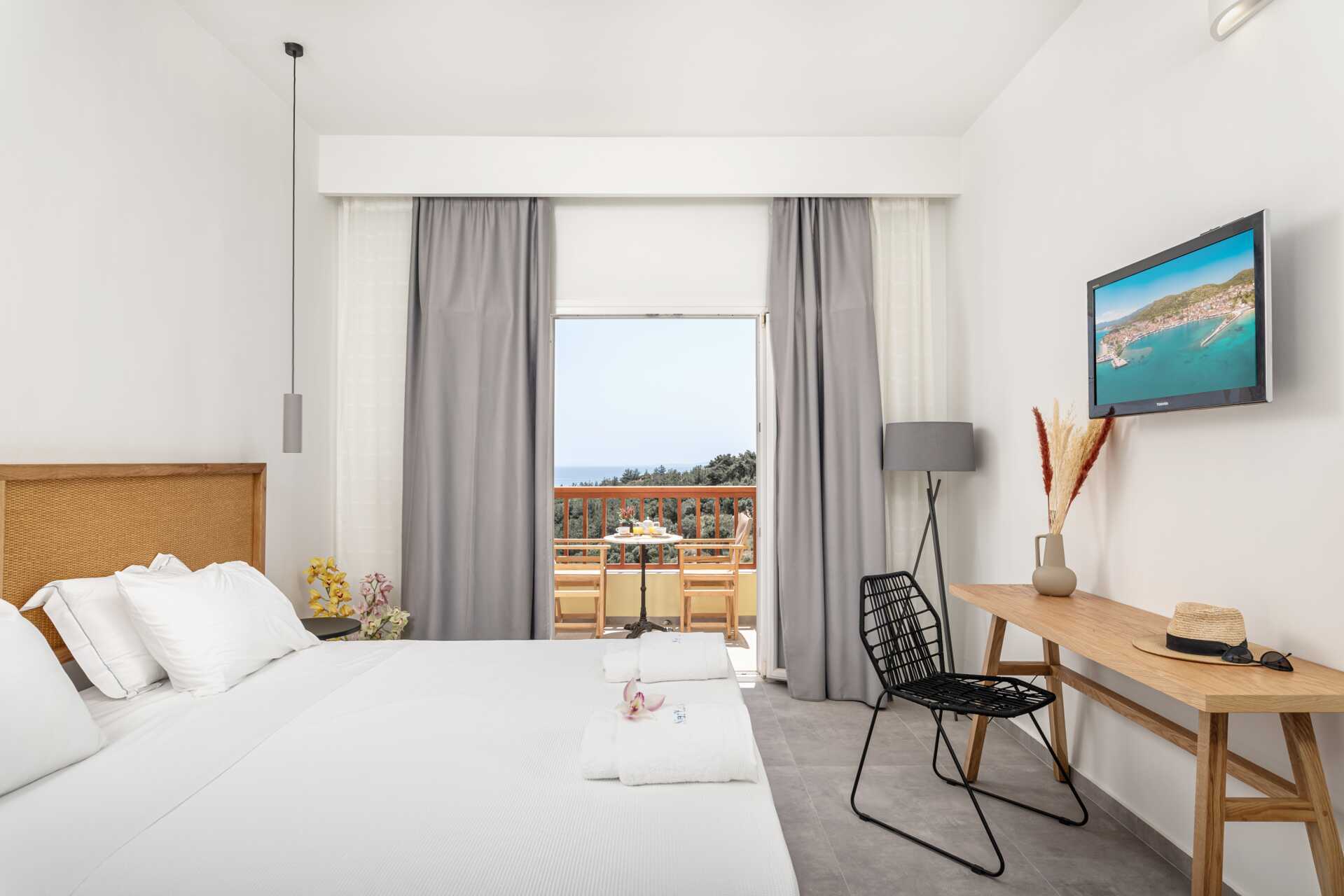 Deluxerum med balkong och havsutsikt. En dubbelsäng. Wifi, luftkonditionering och deponering ingår. Kylskåp. Tv med internationella kanaler. Hårtork. Badrum med dusch och wc. Städning 7 ggr/vecka.