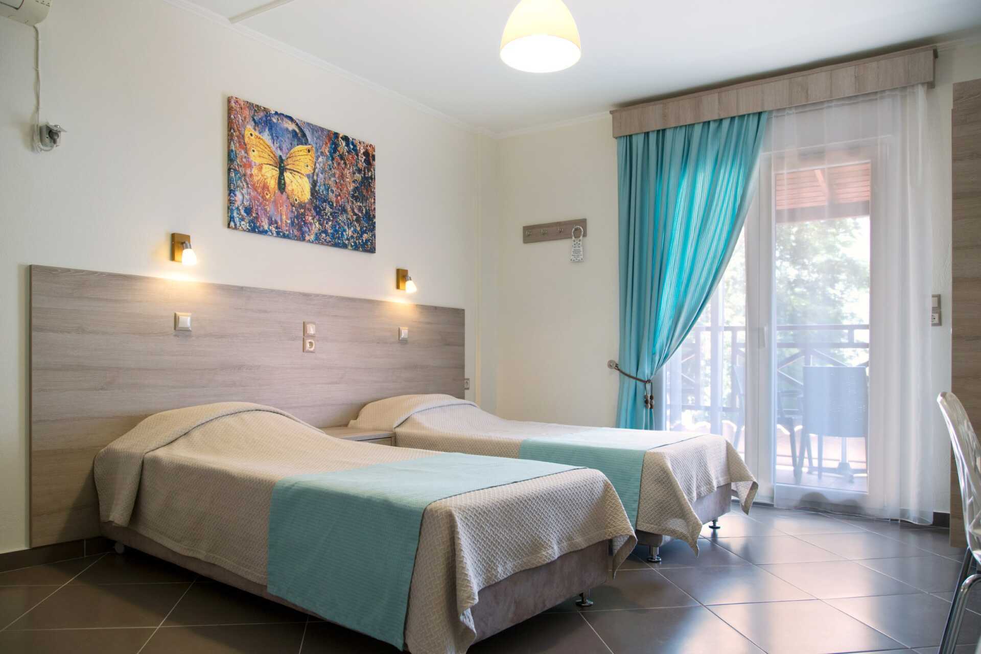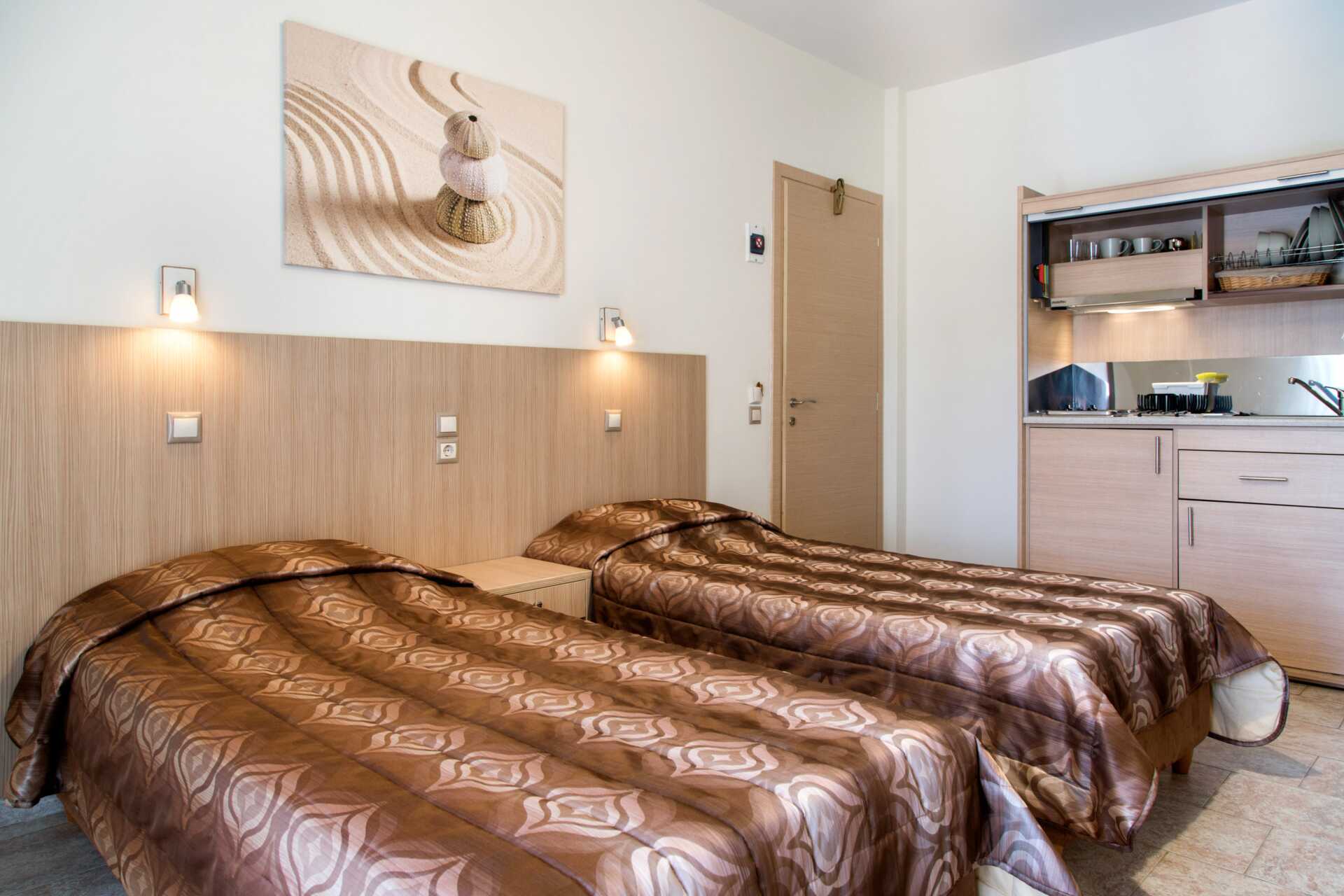 Enrumlägenhet med balkong eller markterrass. Kombinerat sovrum och minikök. En dubbelsäng eller två enkelsängar. Minikök med kokplattor, kylskåp med frysfack, vattenkokare samt kaffe och te samt enkel köksutrustning. Wifi, luftkonditionering och deponering ingår. Hårtork. Badrum med dusch och wc. Städning 6 ggr/vecka.