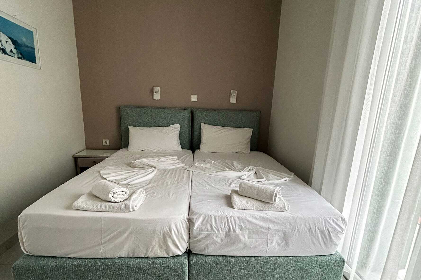Tvårumslägenheter med två balkonger. En liten balkong för två personer vid köket med havsutsikt och en liten balkong för två personer i sovrummet utan havsutsikt. Ett sovrum och ett kombinerat vardagsrum med minikök. Matplats på balkongen. Två enkelsängar. Möjlighet till extrabäddar i enkelsängar, finns i alla tvårumslägenheter och det går inte att boka en lägenhet utan dessa två sängar. Minikök med kokplattor, kylskåp, brödrost och enkel köksutrustning. Wifi och deponering ingår. Luftkonditionering mot avgift. Hårtork. Badrum med dusch och wc. Städning 6 ggr/vecka. Barn under två år räknas in i maxantalet personer i lägenheten.