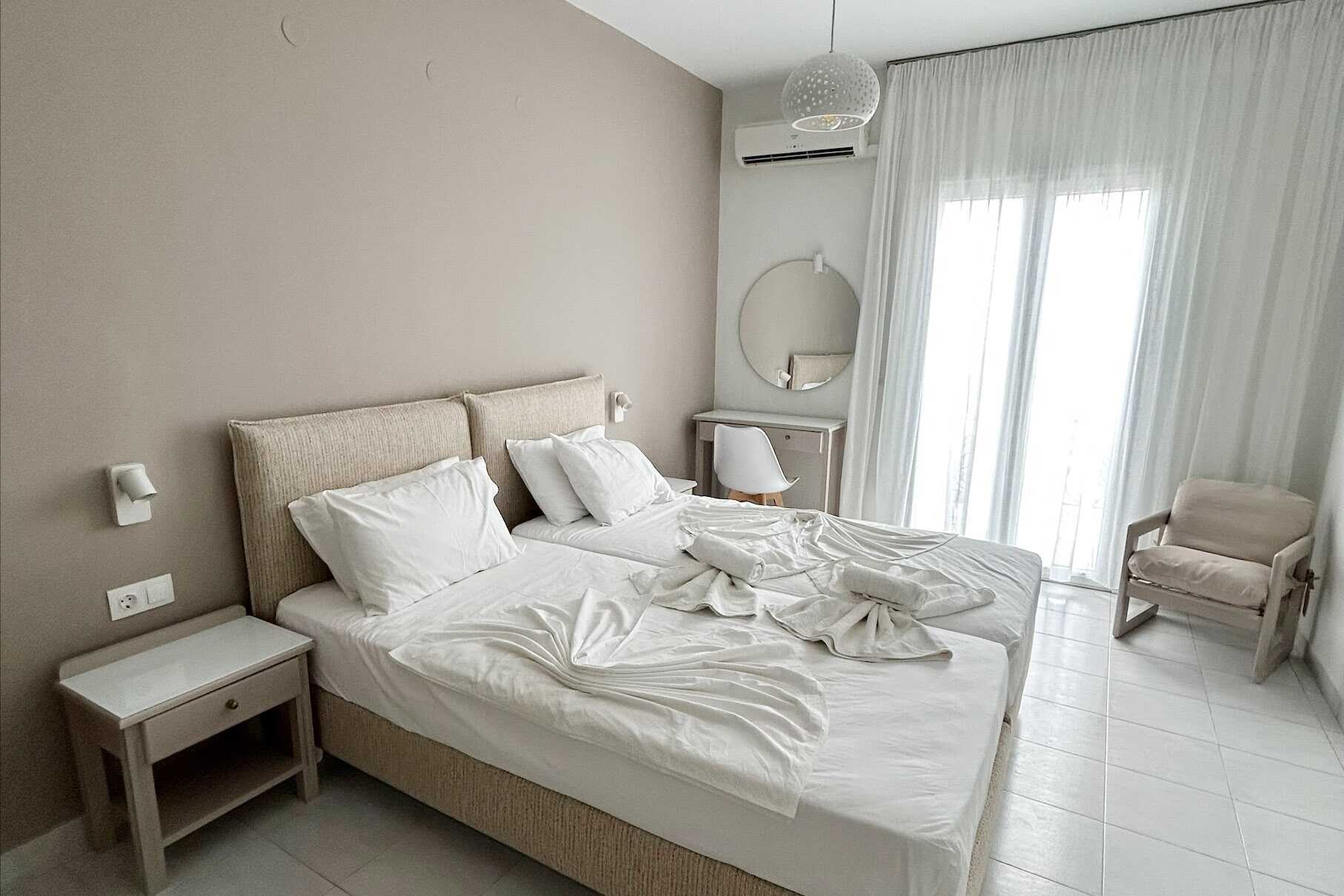 Enrumslägenheter med balkong för två personer eller delad uteplats. Alla lägenheter har en fin utsikt över havet och Pythagorions hamn. Sovrum kombinerat med minikök. Två enkelsängar. I vissa lägenheter finns möjlighet till extrabädd för en tredje person. Minikök med kokplattor, kylskåp, brödrost och enkel köksutrustning. Wifi och deponering ingår. Luftkonditionering mot avgift. Hårtork. Badrum med dusch och wc. Städning 6 ggr/vecka. Barn under två år räknas in i maxantalet personer i lägenheten.