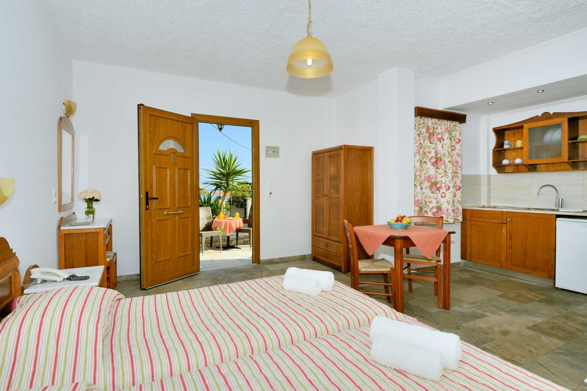 Enrumslägenhet med balkong eller markterrass av varierande storlek. Kombinerat sovrum med minikök. Två enkelsängar. Möjlighet till extrabädd i bäddbar fåtölj eller i bäddsoffa. Minikök med kokplattor, kaffebryggare, kylskåp och enkel köksutrustning. Wifi och luftkonditionering ingår. Tv med internationella kanaler. Hårtork. Badrum med dusch och wc. Städning 3 ggr/vecka.