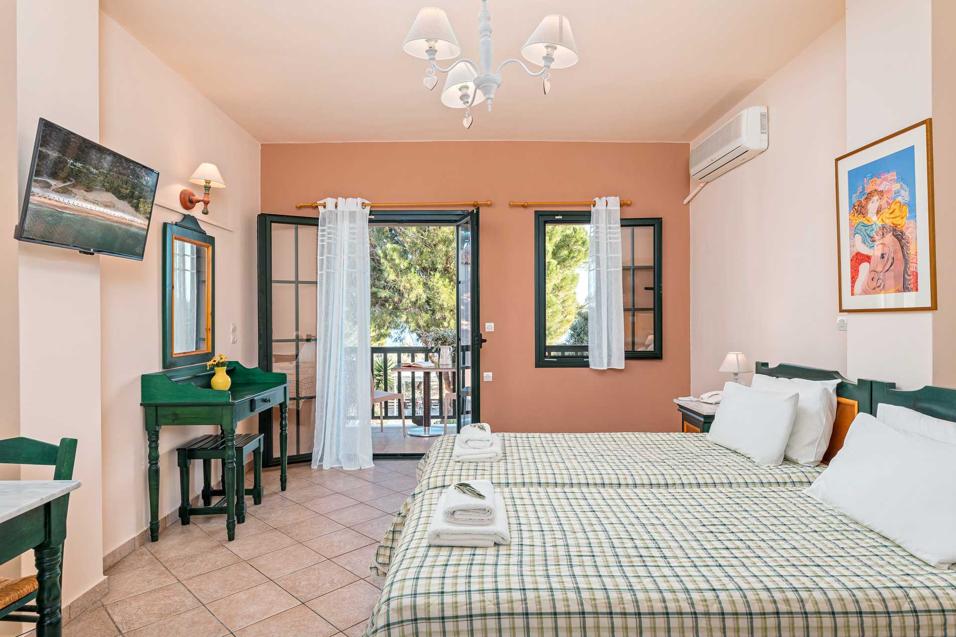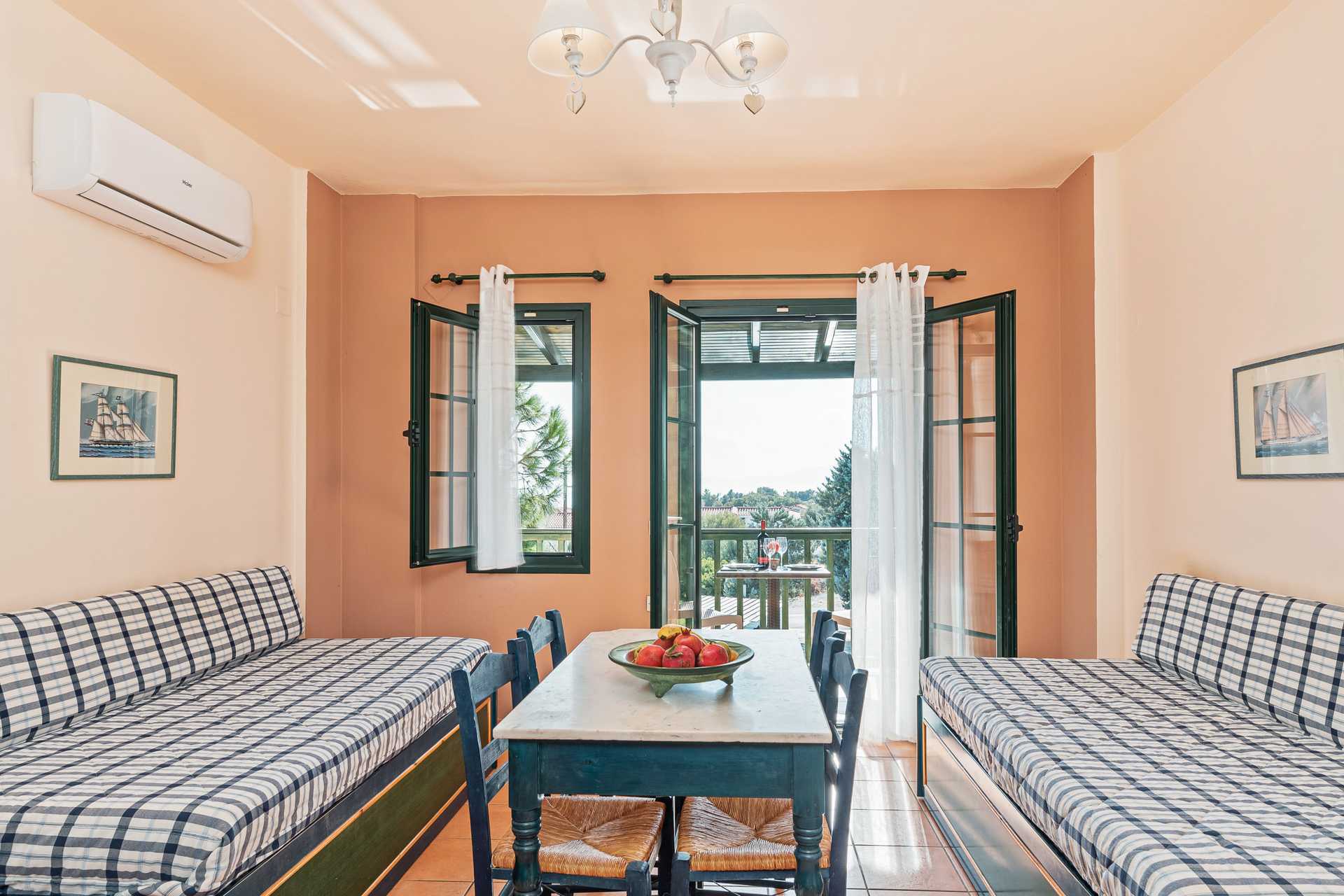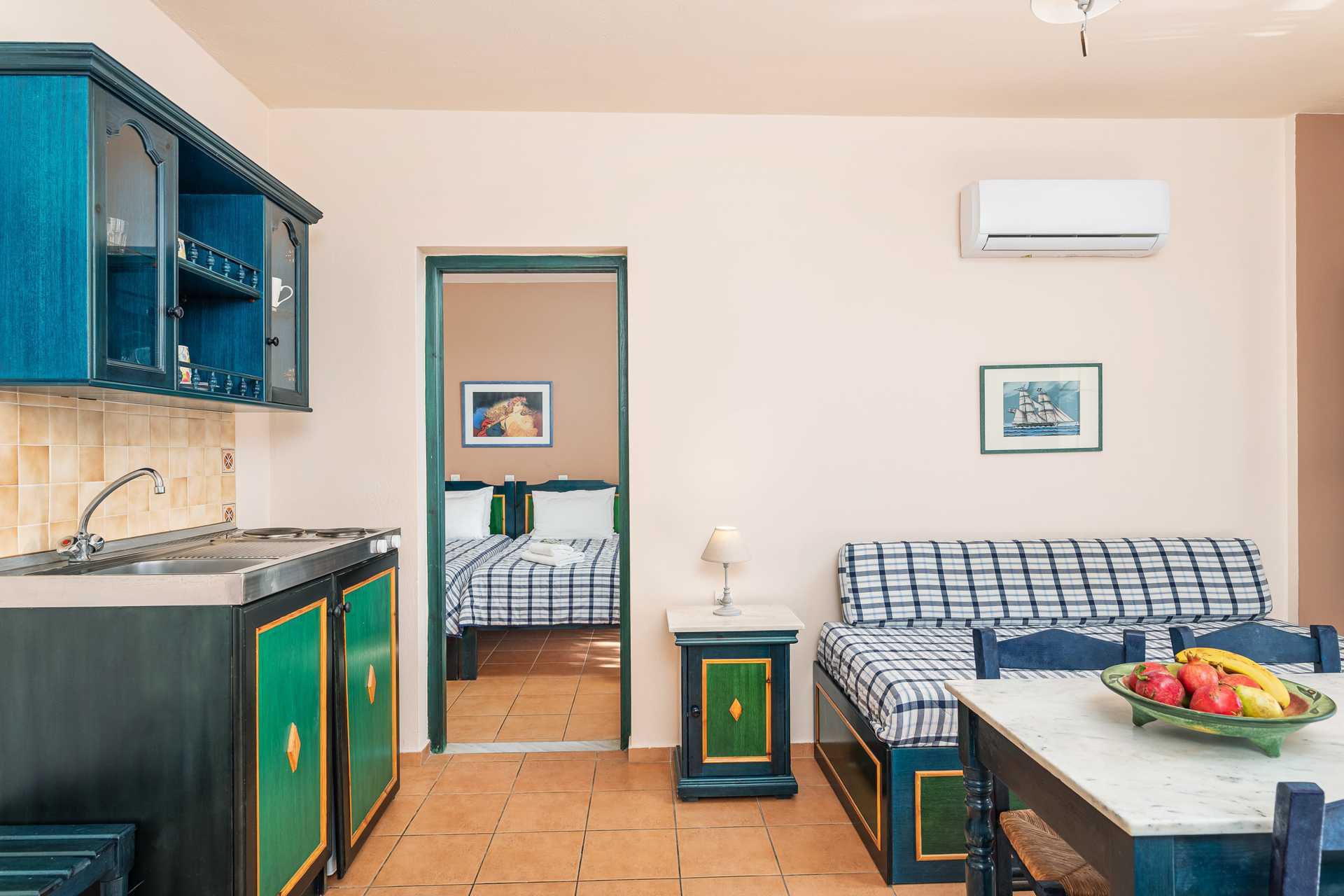 Tvårumslägenhet med balkong. Ett sovrum och ett kombinerat vardagsrum med minikök. Två enkelsängar. Möjlighet till extrabäddar i bäddsoffa eller i två enkelsängar. Minikök med kokplattor, vattenkokare, kylskåp och enkel köksutrustning. Kostnadsfritt wifi och luftkonditionering. Deponering mot avgift. Tv med internationella kanaler. Hårtork. Badrum med dusch och wc. Städning 6 ggr/vecka.