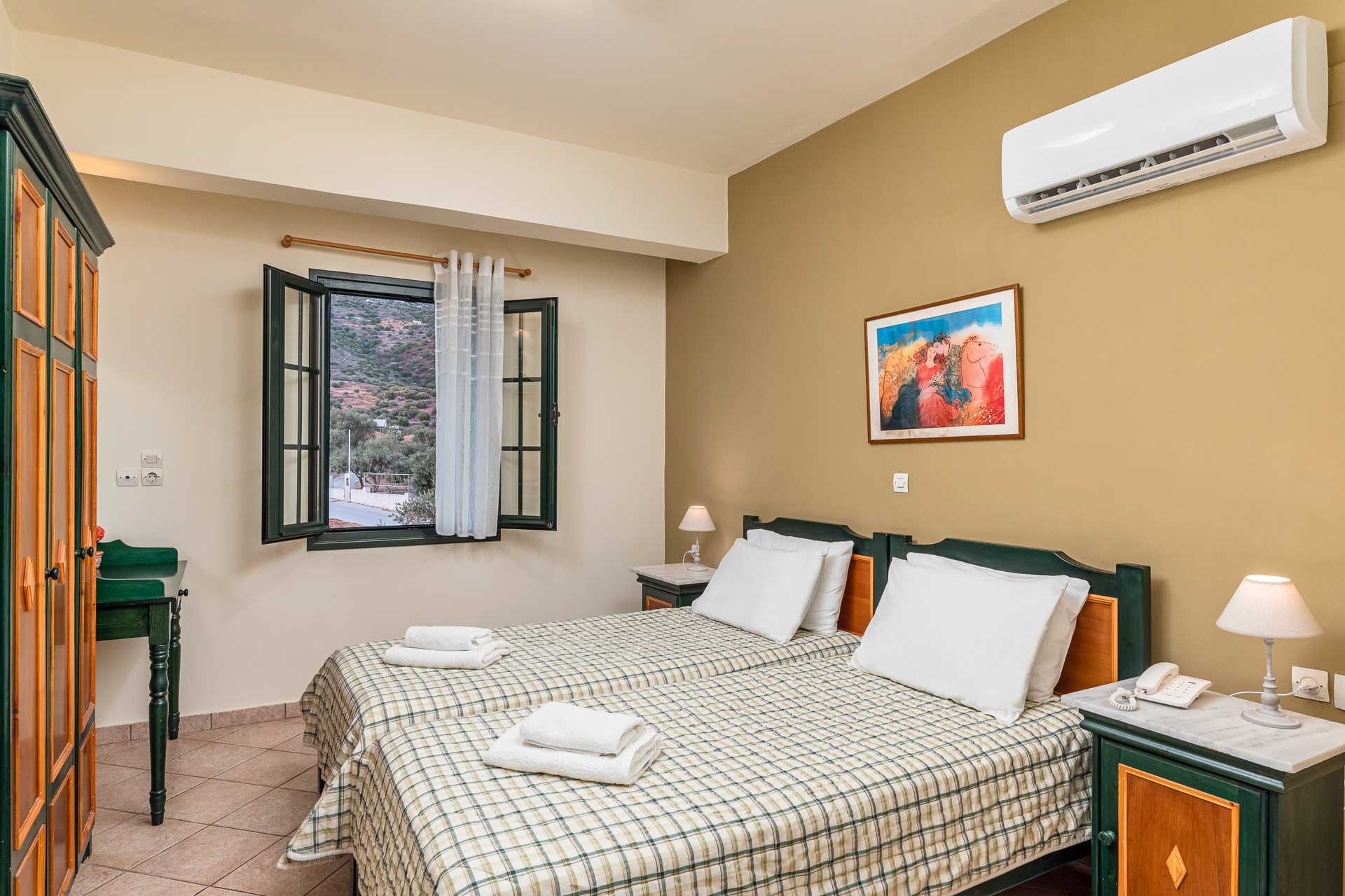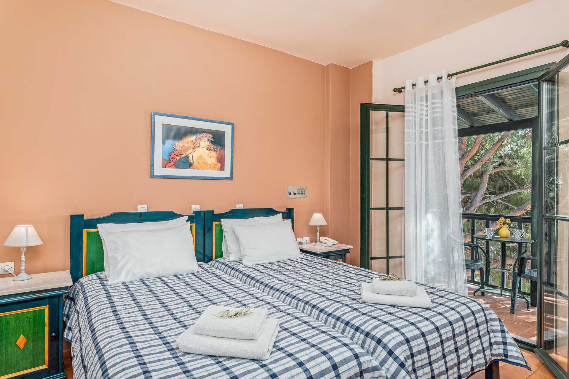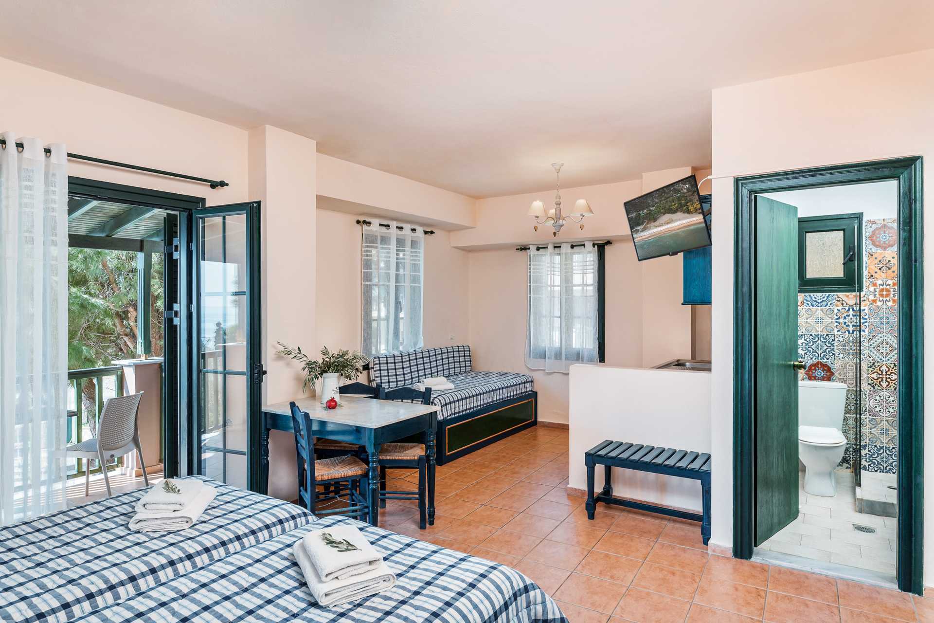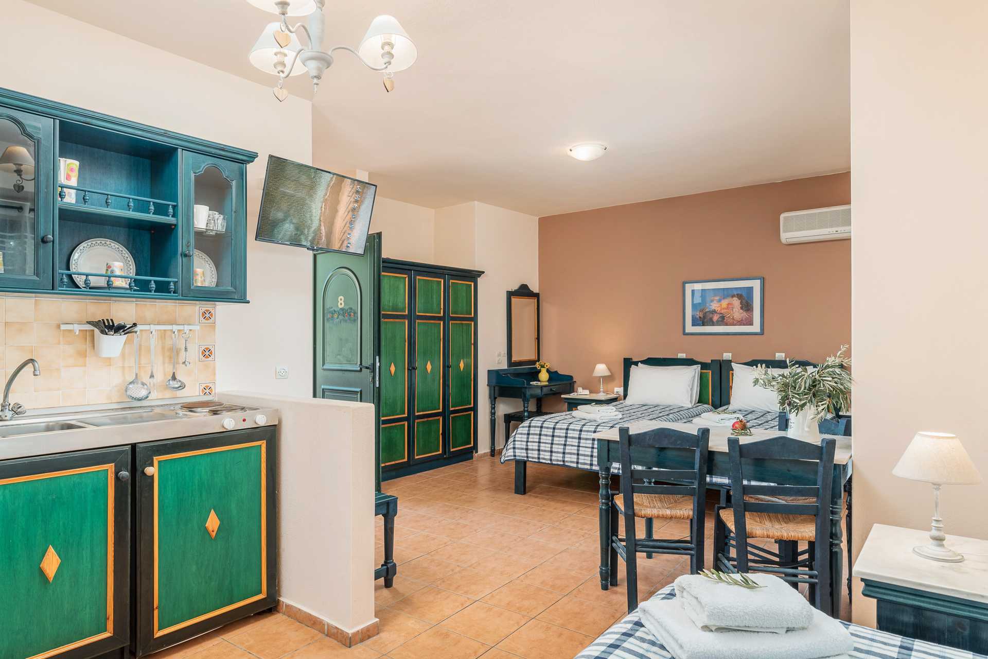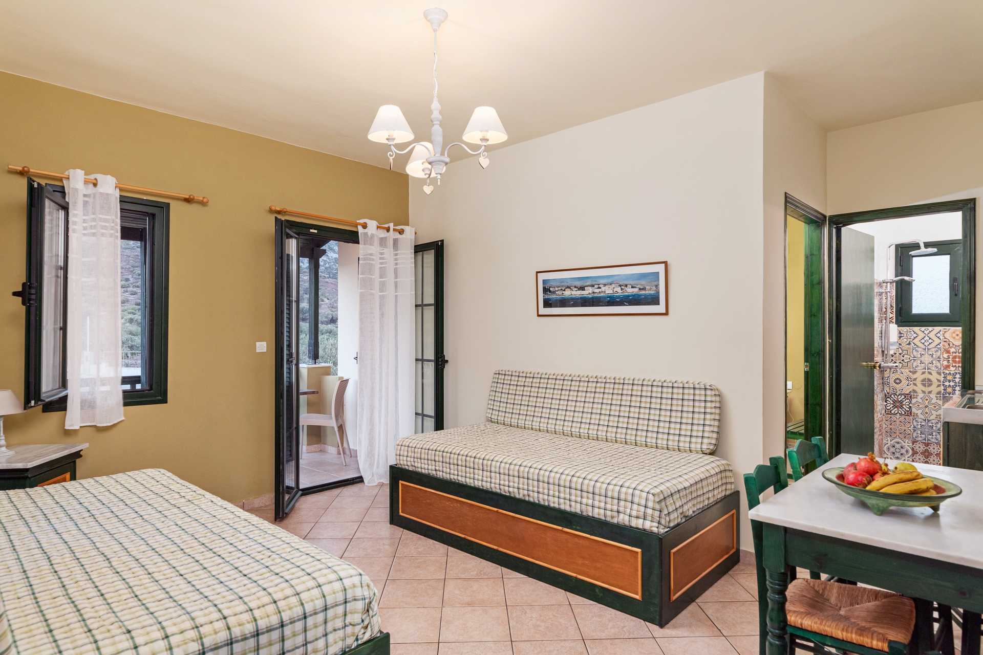 Enrumslägenhet med balkong. Sovrum kombinerat med minikök. Två enkelsängar. Möjlighet till extrabädd i bäddsoffa. Minikök med kokplattor, kylskåp, vattenkokare samt enkel köksutrustning. Kostnadsfritt wifi och luftkonditionering. Deponering mot avgift. Tv med internationella kanaler. Hårtork. Badrum med dusch och wc. Städning 6 ggr/vecka.