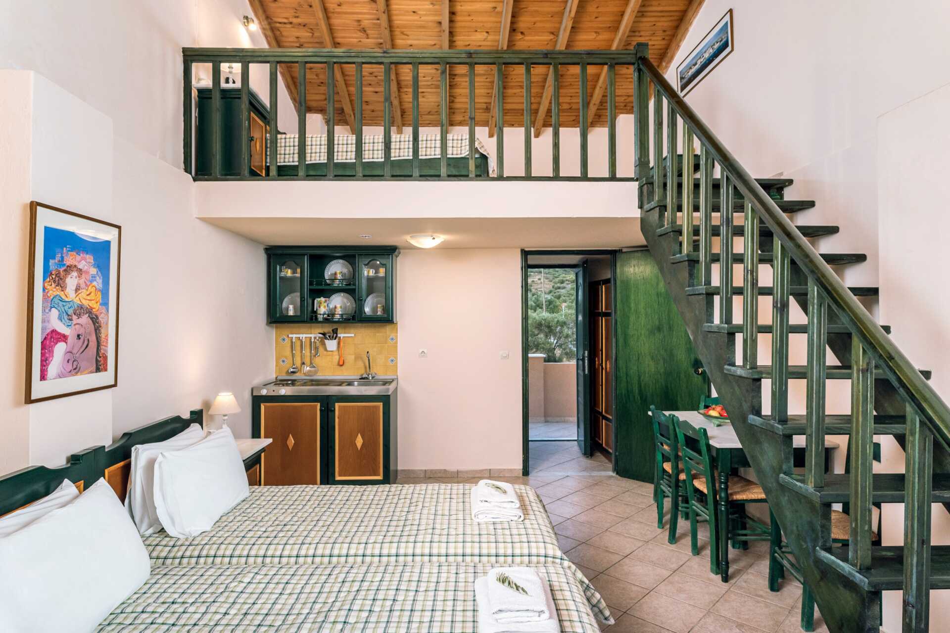 Enrumslägenhet i etage med balkong. På entréplan finns sovrum med två enkelsängar kombinerat med ett minikök En trappa upp finns ett sovloft med två enkelsängar. Öppen planlösning mellan våningarna. Minikök med kokplattor, vattenkokare, kylskåp och enkel köksutrustning. Kostnadsfritt wifi och luftkonditionering. Deponering mot avgift. Tv med internationella kanaler. Hårtork. Badrum med dusch och wc. Städning 6 ggr/vecka.