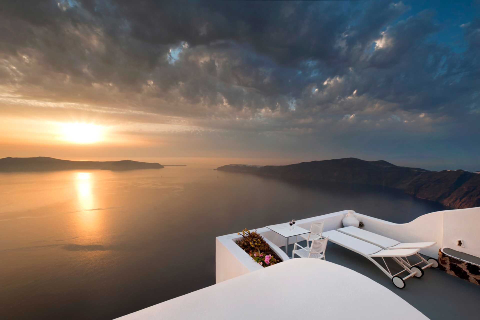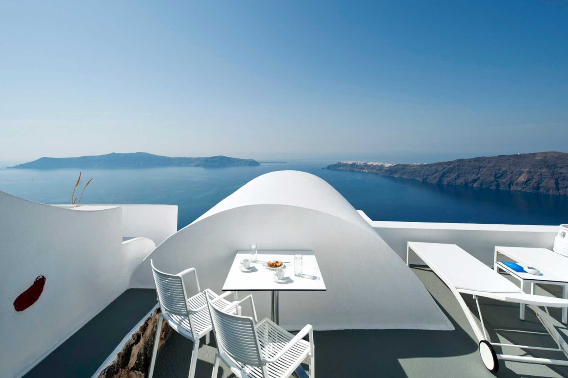 Deluxerum med balkong eller terrass med havsutsikt. På uteplatsen finns stolar och bord samt två solstolar. I rummet finns en uppvärmd pool. Trappsteg till poolen. En dubbelsäng. Wifi, luftkonditionering och deponering ingår. Kylskåp. Vattenkokare samt kaffe och te. Tv med internationella kanaler. Badrockar och tofflor. Hårtork. Badrum med dusch och wc. Städning 7 ggr/vecka. Barn under två är räknas in i maxantalet personer i rummet.