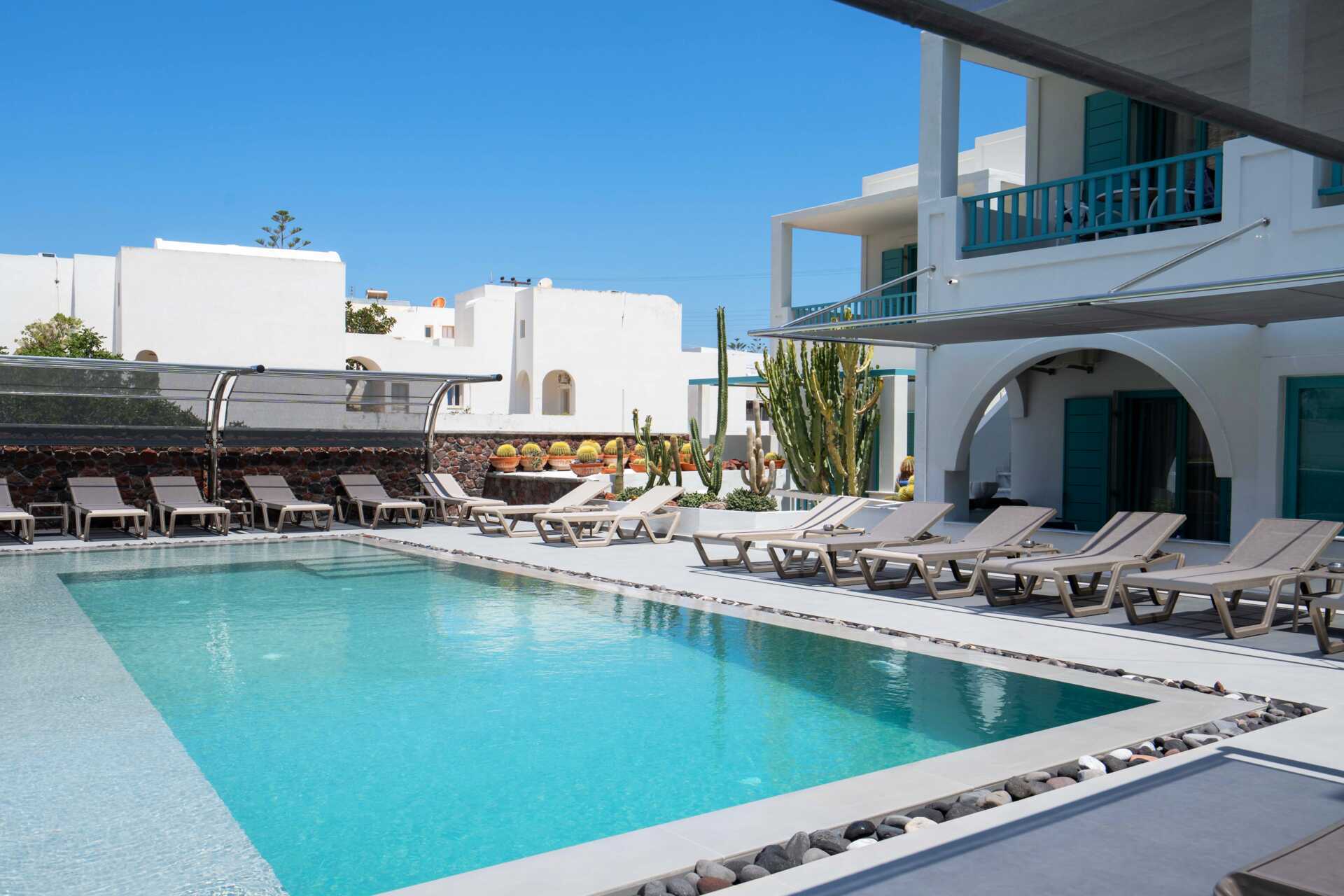 Andreas ligger bra till, med gångavstånd både till den svarta lavastranden och till centrum av Kamari. Litet poolområde med solstolar och parasoller. Frukosten äter du under de blommande Bougainvillean som bildar både väggar och tak runt om på hotellet.