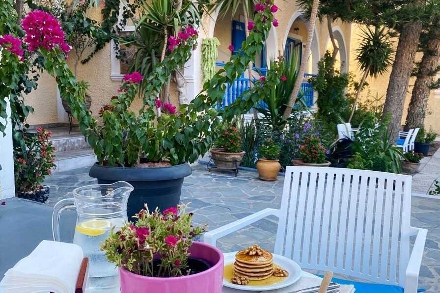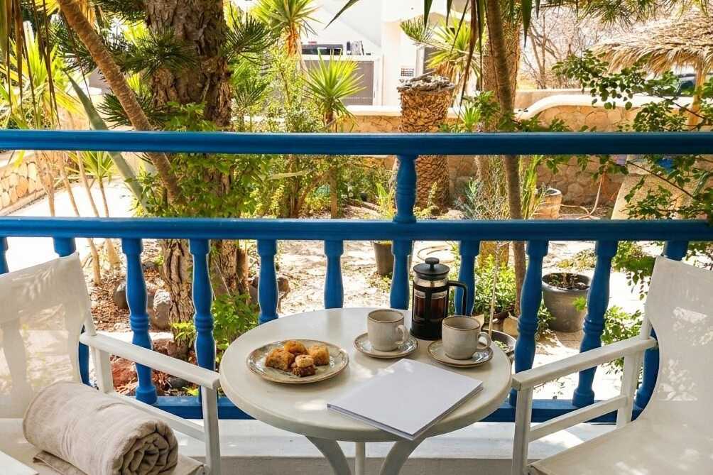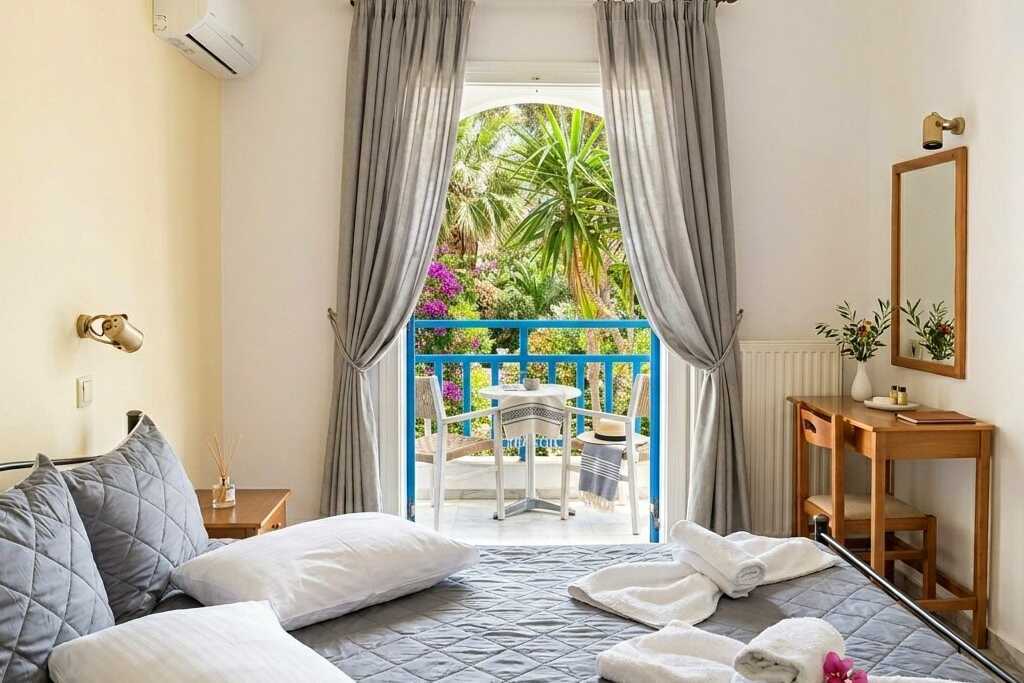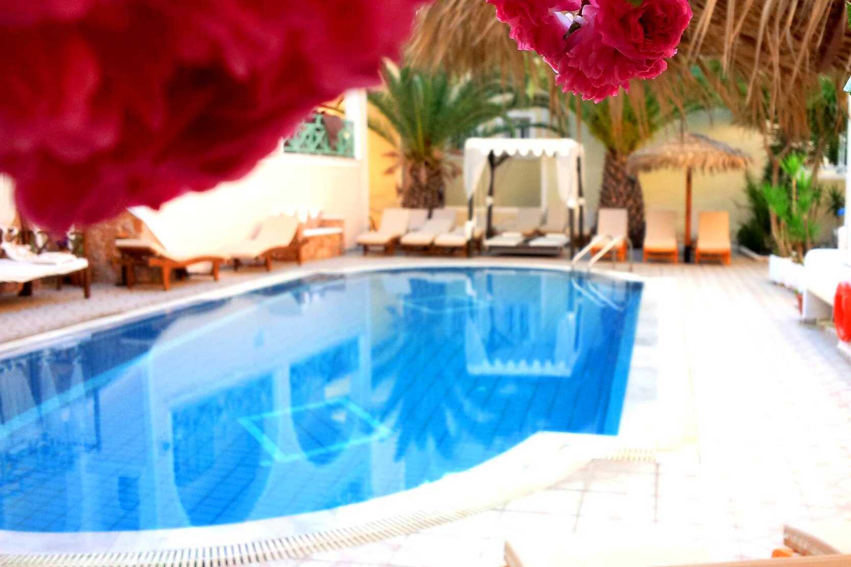 Hotel Zeus har en fin trädgård med palmer, bougainvillea och ett poolområde med en pool, solstolar och parasoller, poolbar samt poolhanddukar. Frukosten serveras i hotellets frukostmatsal.