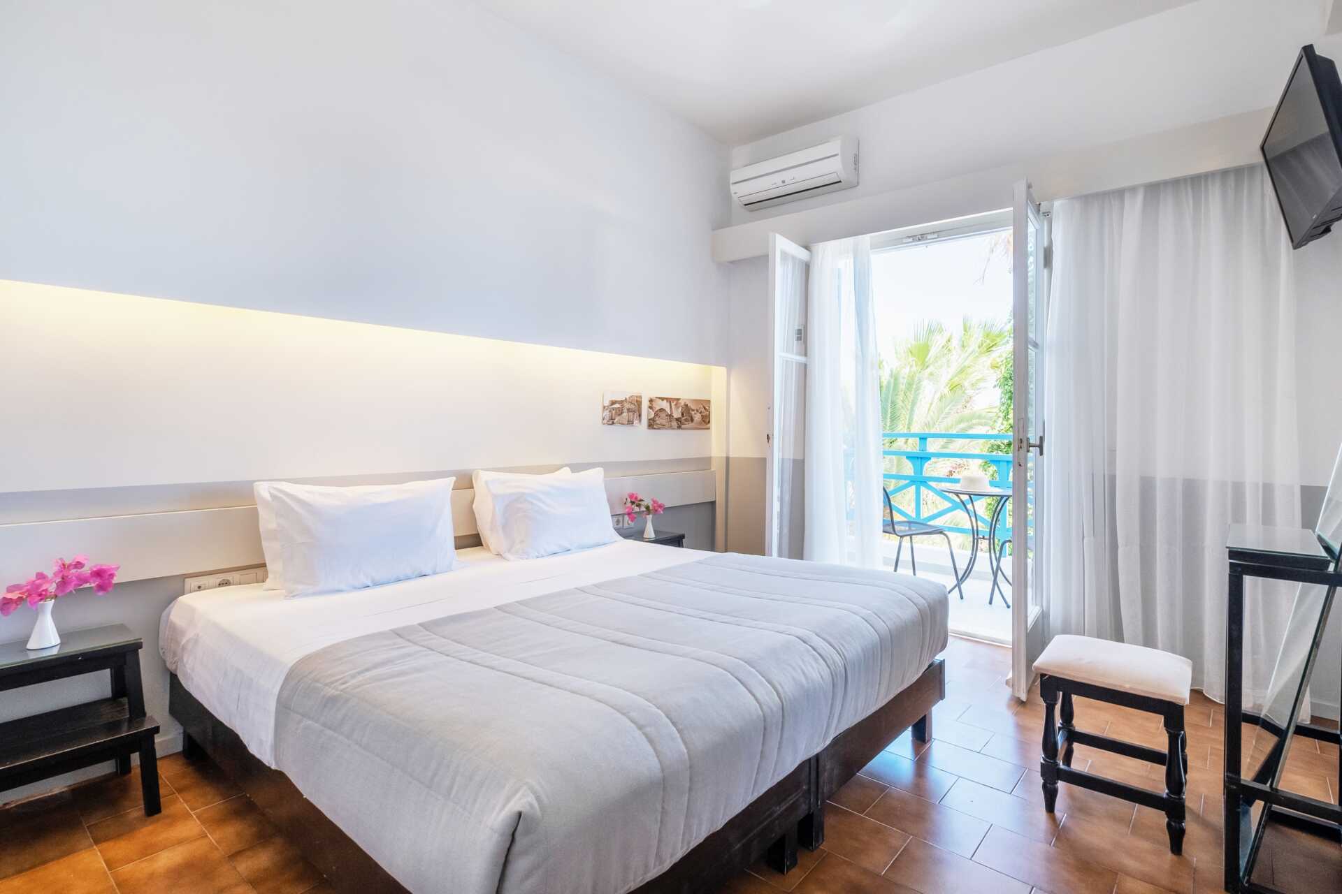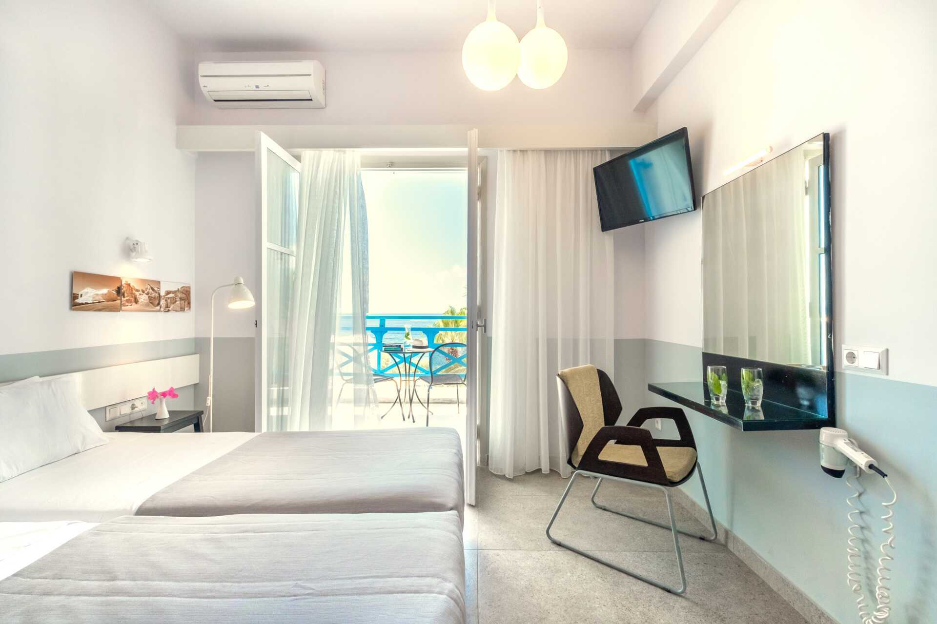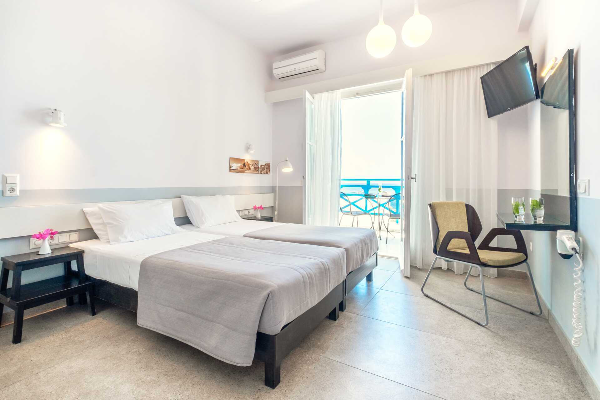 Dubbelrum med balkong, vissa med havsutsikt. En dubbelsäng eller två enkelsängar. Wifi, luftkonditionering och deponering ingår. Kylskåp. Tv med internationella kanaler. Hårtork. Badrum med dusch och wc. Städning 7 ggr/vecka. Barn under två år räknas in i maxantalet personer i rummet.