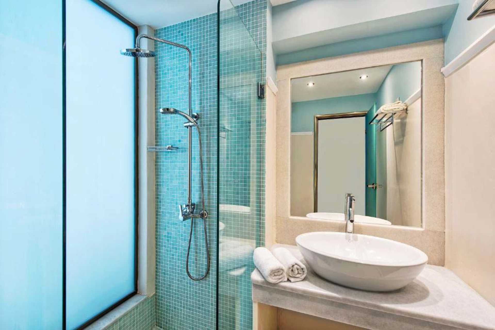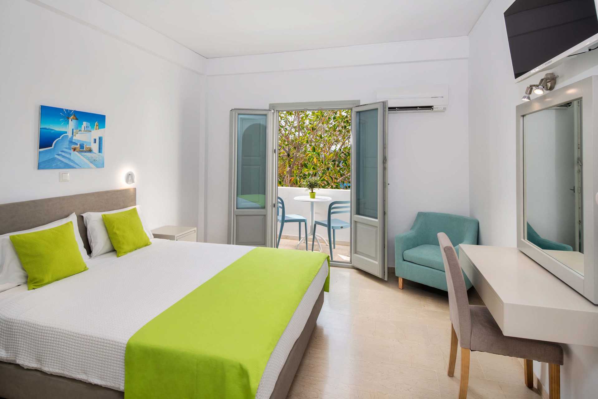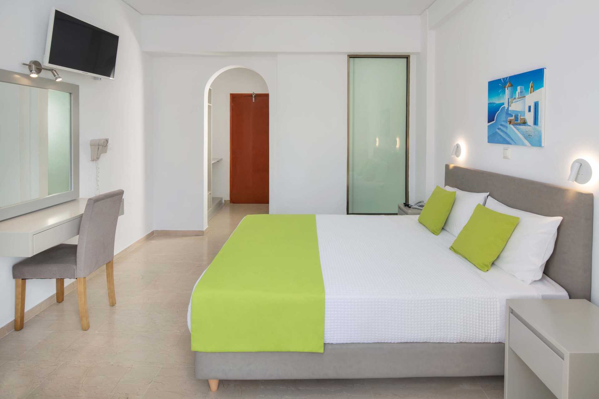 Dubbelrum med balkong eller terrass. En dubbelsäng eller två enkelsängar. Wifi, luftkonditionering och deponering ingår. Kylskåp. Tv med internationella kanaler. Hårtork. Badrum med dusch samt wc. Städning 6 ggr/vecka.