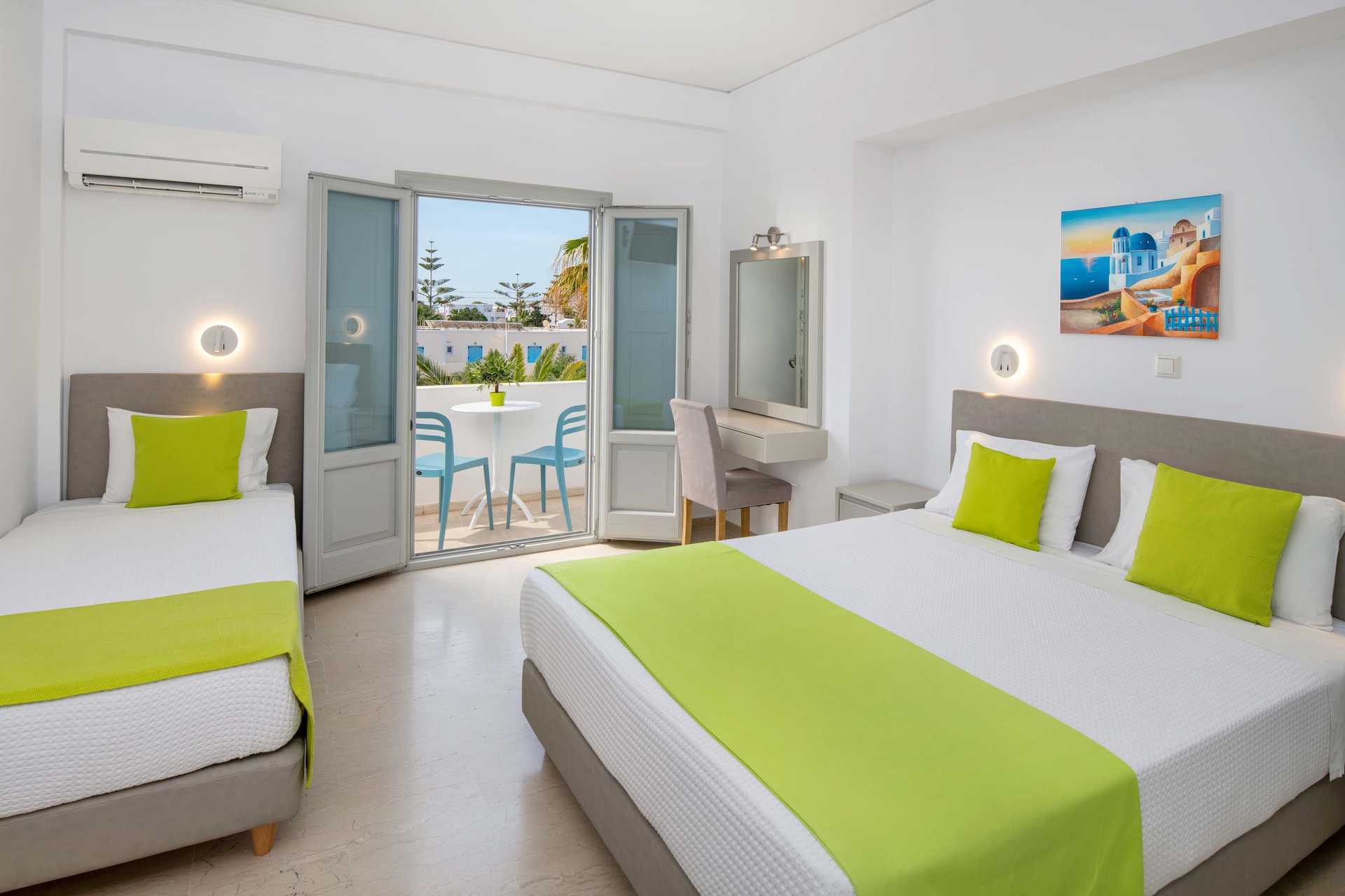 Trippelrum med balkong eller terrass. En dubbelsäng och två enkelsängar eller tre enkelsängar. Wifi, luftkonditionering och deponering ingår. Kylskåp. Tv med internationella kanaler. Hårtork. Badrum med dusch samt wc. Städning 6 ggr/vecka.