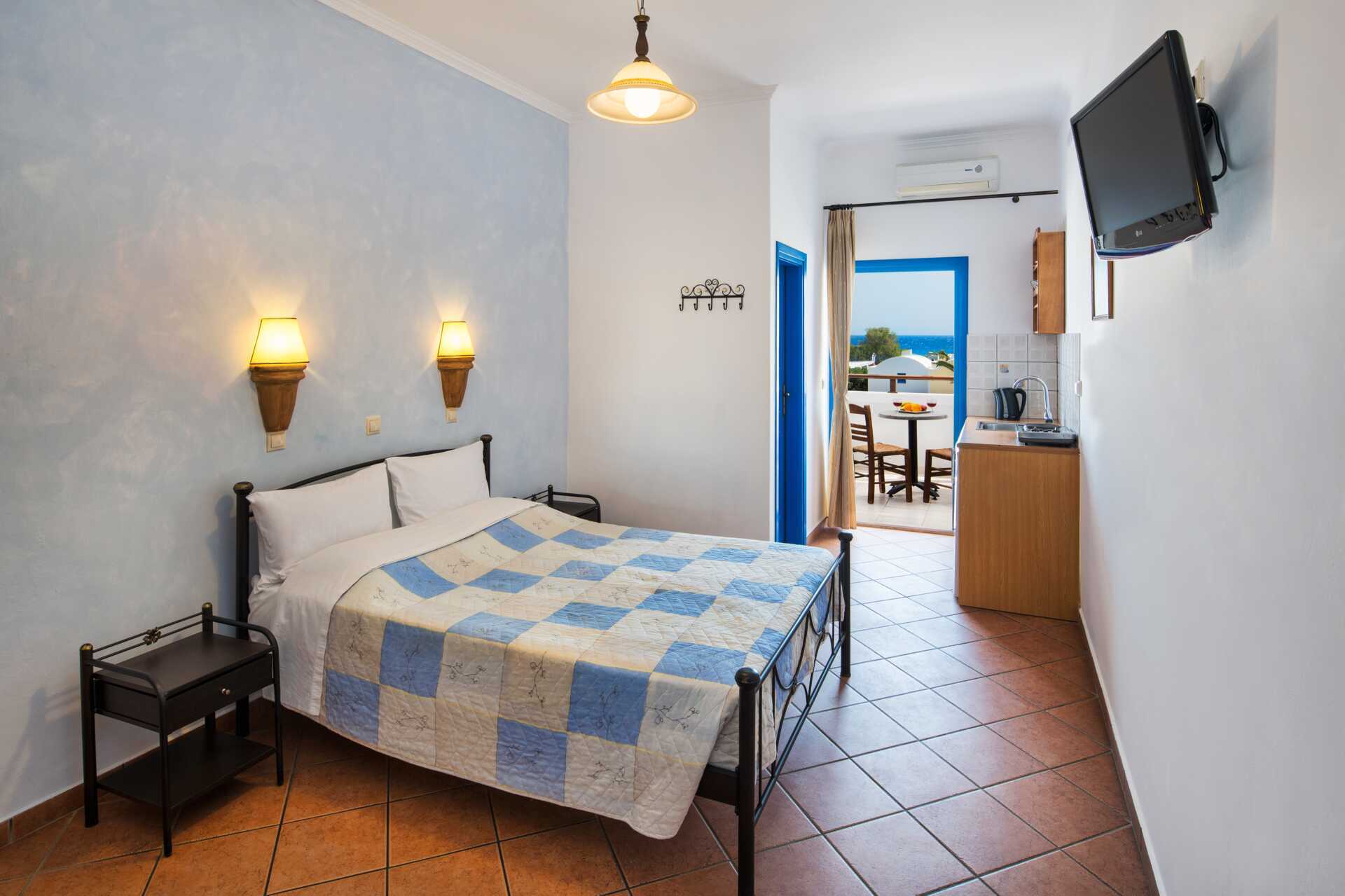 Enrumslägenheter med balkong eller terrass eller med markterrass. Kombinerat sovrum med minikök. Två enkelsängar eller en dubbelsäng alternativt en dubbelsäng och en enkelsäng. Minikök med kokplattor, kylskåp, vattenkokare och enkel köksutrustning. Wifi, luftkonditionering och deponering ingår. Tv med internationella kanaler. Hårtork. Badrum med dusch och wc. Städning 7 ggr/vecka.