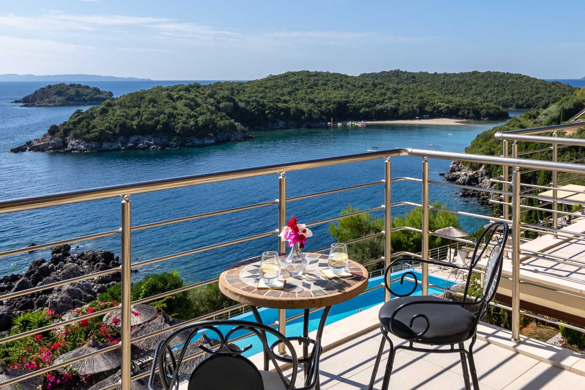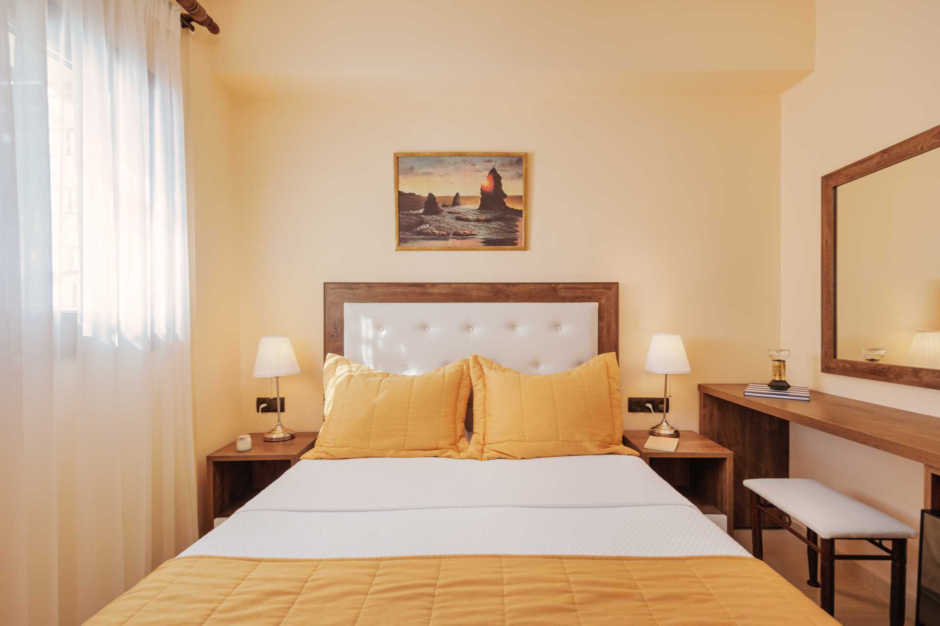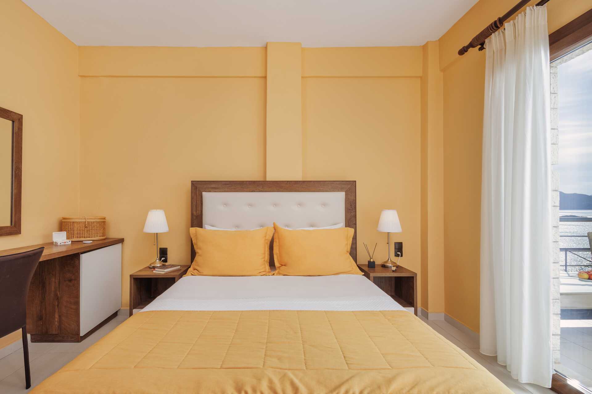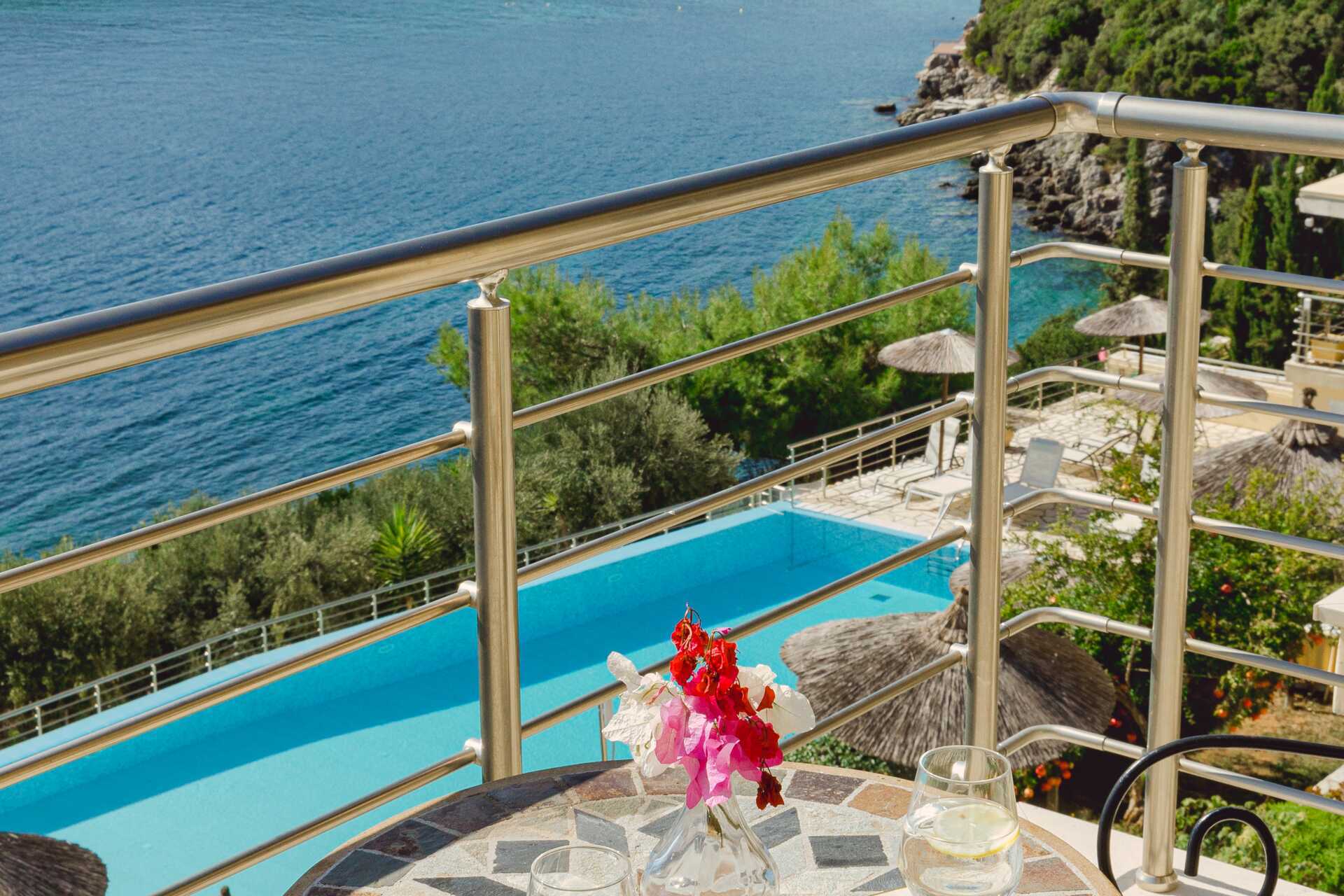 Deluxerum med balkong och havsutsikt. En dubbelsäng. Möjlighet till extrabädd i bäddsoffa. Wifi, luftkonditionering och deponering ingår. Kylskåp. Vattenkokare. Tv med lokala kanaler. Hårtork. Badrum med badkar eller dusch samt wc. Städning 7 ggr/vecka. Vissa dubbelrum delar entré med varandra men har varsin ytterdörr till rummet.