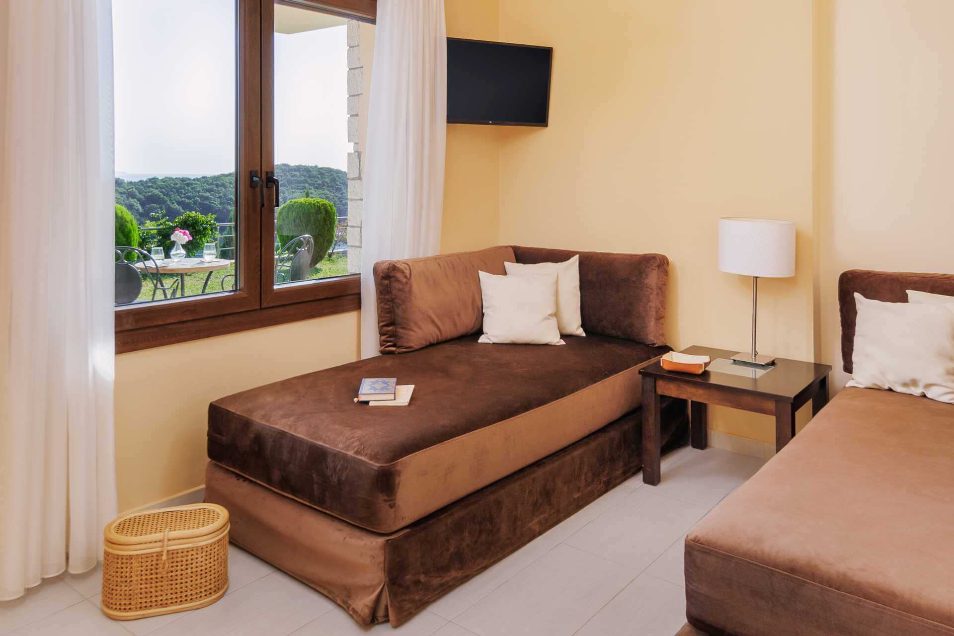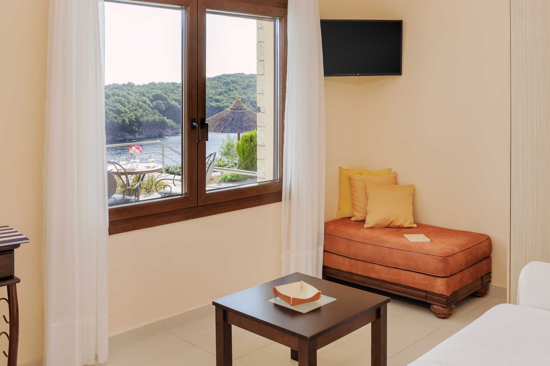 Familjerum med markterrass och havsutsikt. Familjerummet består av ett sovrum och ett vardagsrum. En dubbelsäng. Möjlighet till extrabäddar i bäddsoffa. Wifi, luftkonditionering och deponering ingår. Kylskåp. Vattenkokare. Tv med lokala kanaler. Hårtork. Badrum med badkar eller dusch samt wc. Städning 7 ggr/vecka.