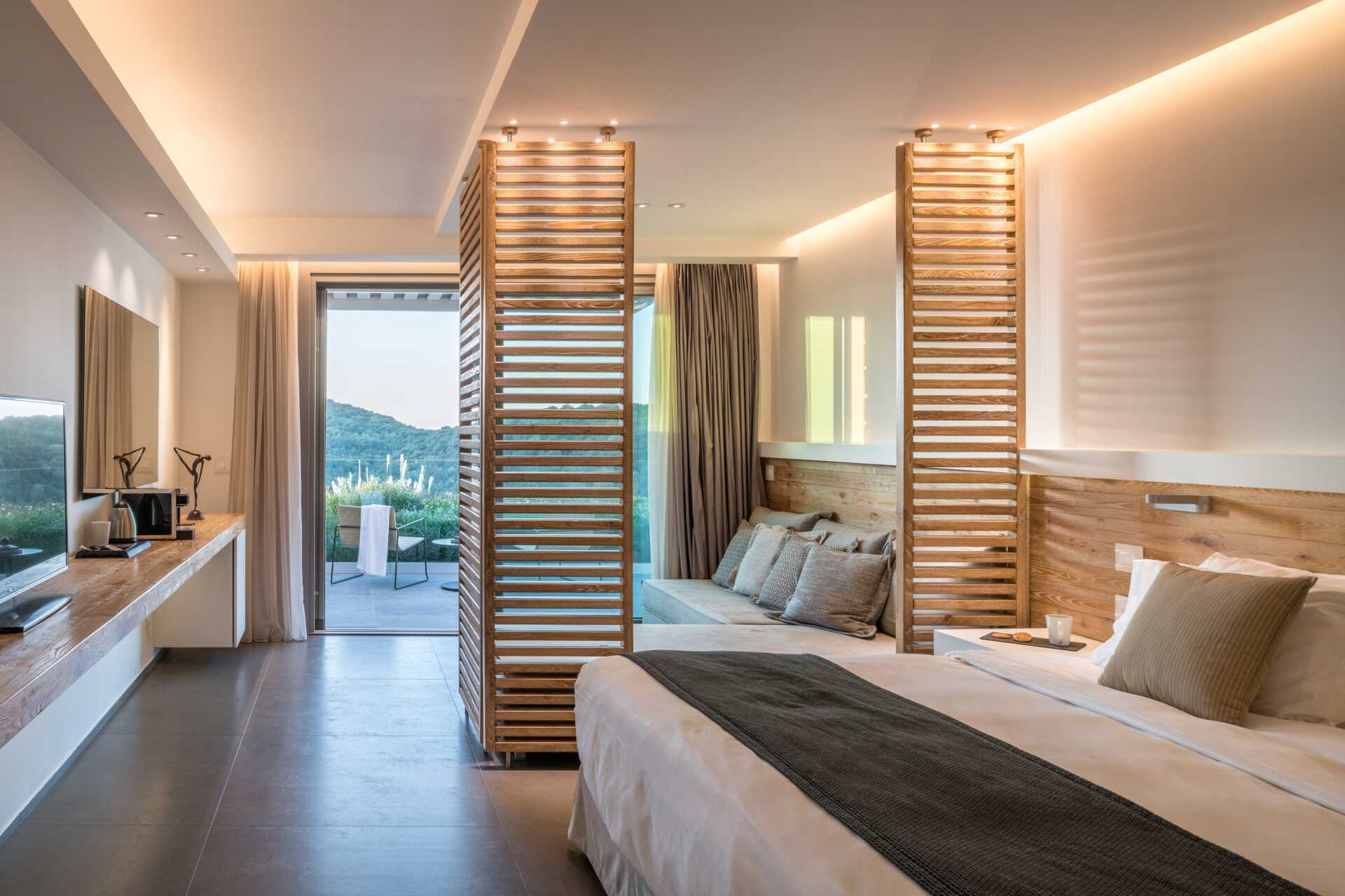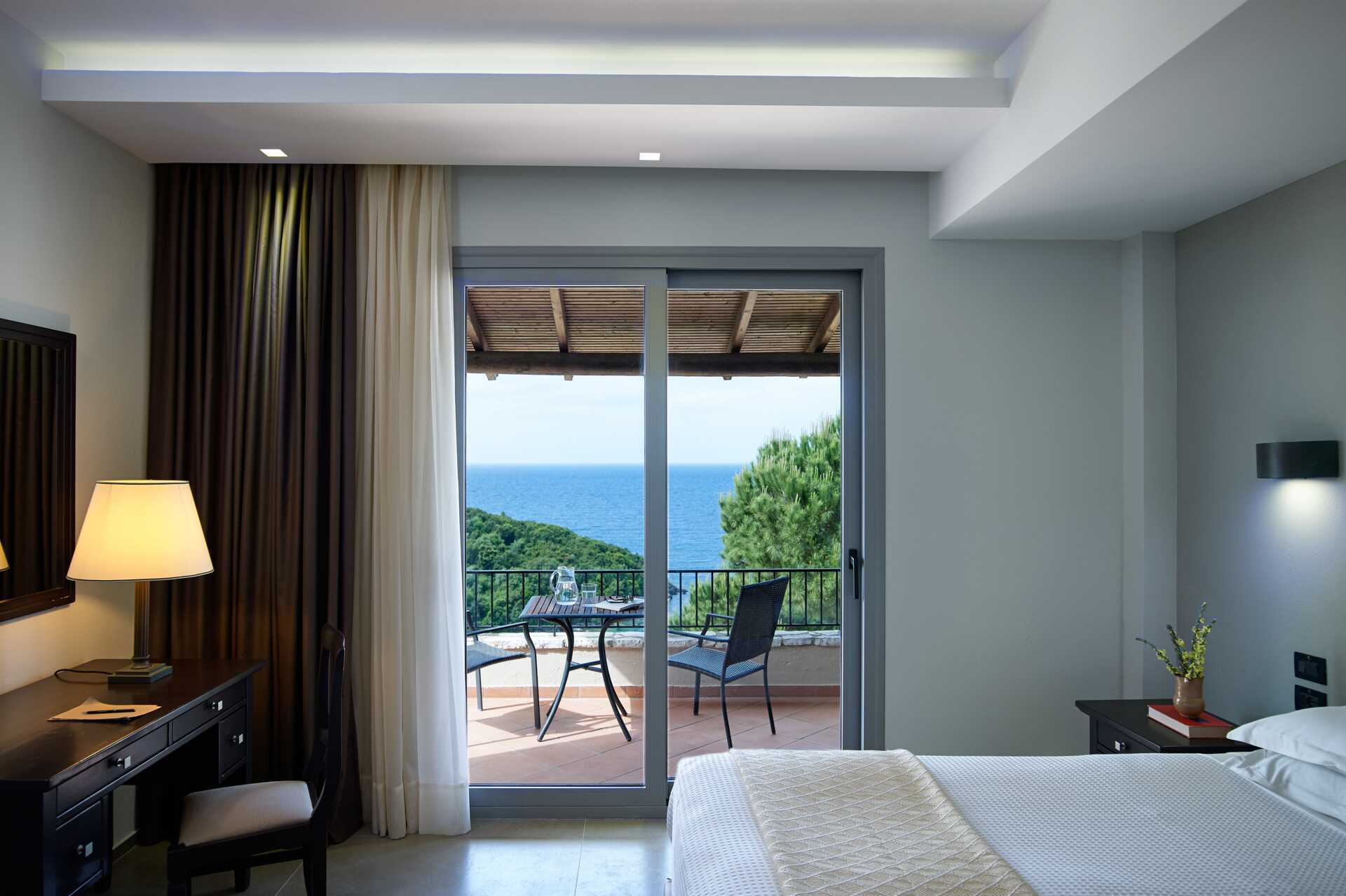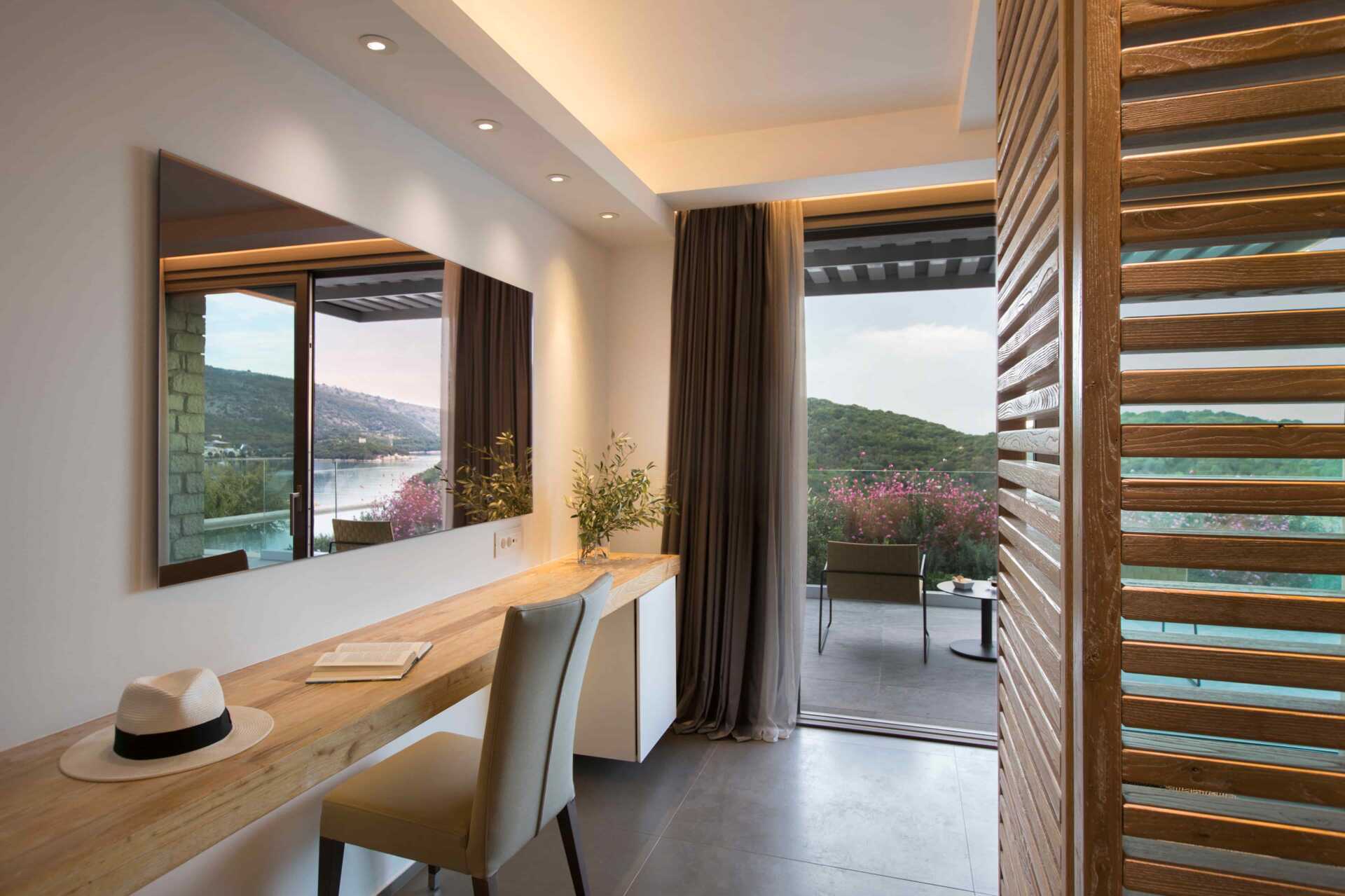 Deluxe juniorsvit med privat pool, markterrass och havsutsikt. Trappor ner i poolen som är ca 20 m2 och 150 cm djup. På terrassen finns bord och stolar samt solstolar. En dubbelsäng eller två enkelsängar. Möjlighet till extrabädd i bäddsoffa. Wifi, luftkonditionering och deponering ingår. Kylskåp. Vattenkokare samt kaffe och te. Kaffebryggare. Kaffemaskin med kapslar. Tv med internationella kanaler. Strykjärn och strykbräda. Badrockar och tofflor. Hårtork. Badrum med dusch och wc. Städning 7 ggr/vecka.