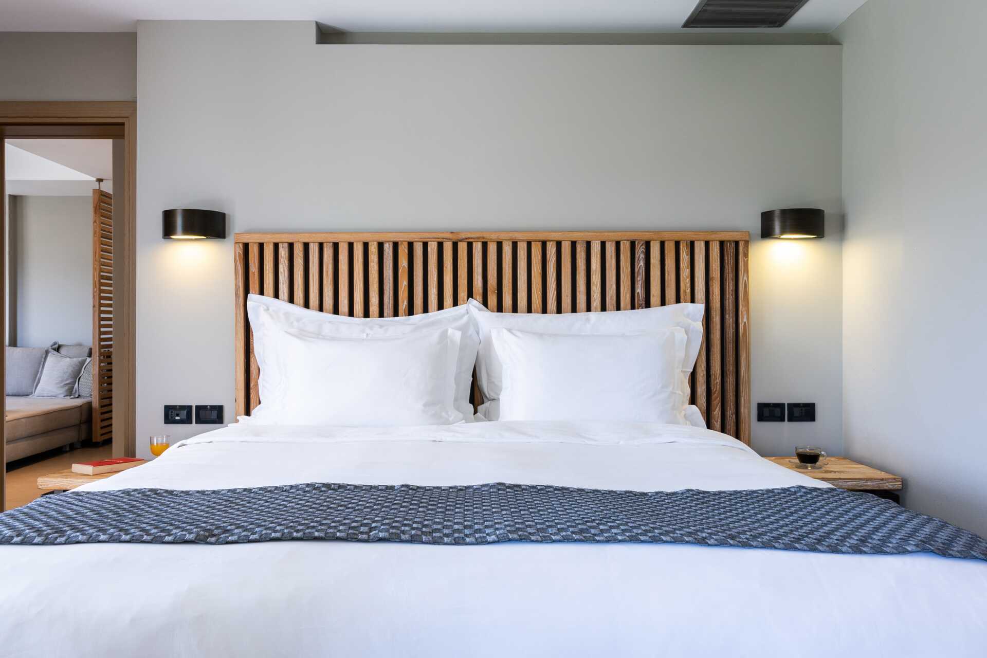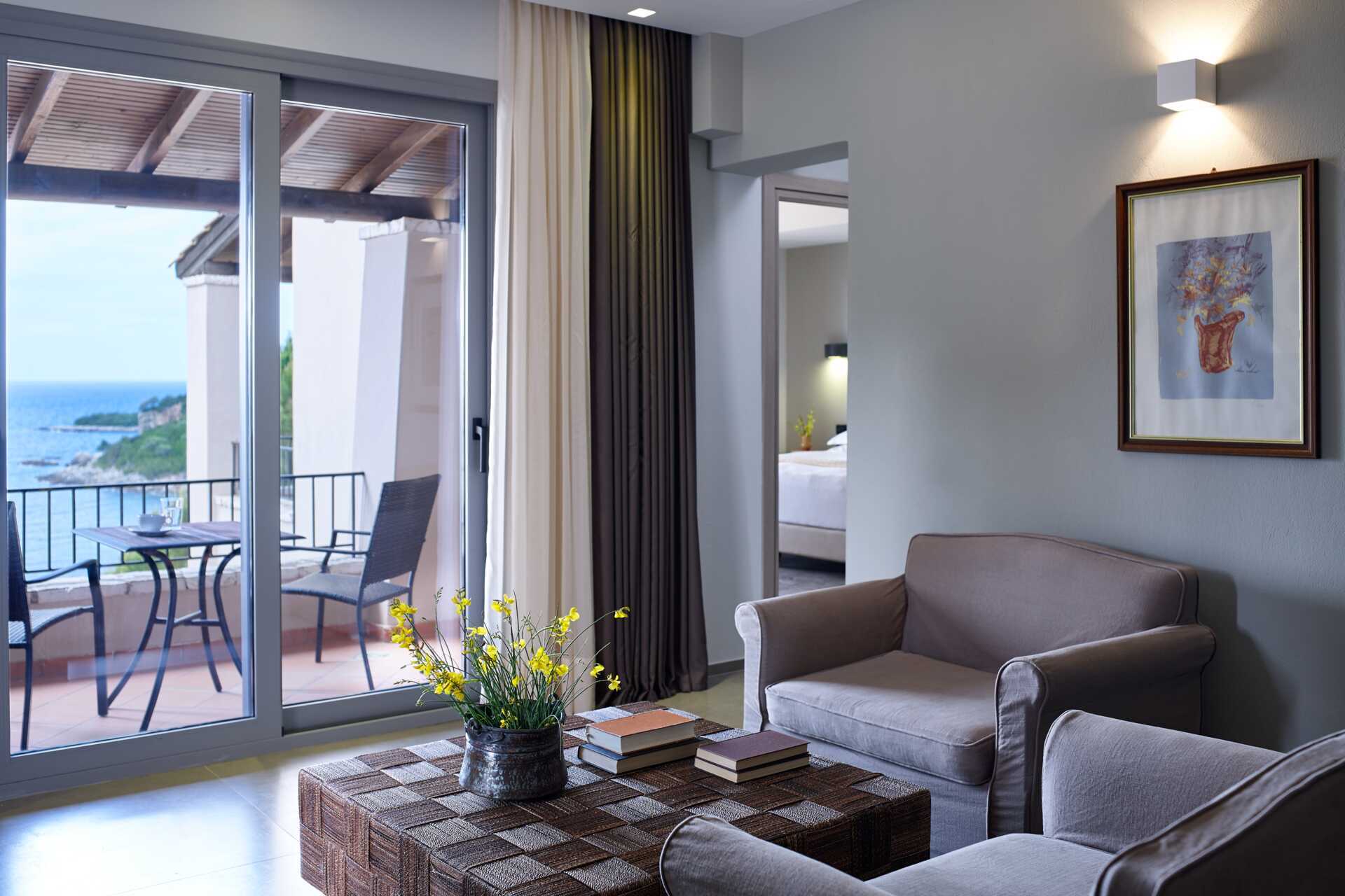 Svit med balkong eller terrass och havsutsikt. Sviten består av ett sovrum och ett vardagsrum med soffor, bord och fåtöljer. En dubbelsäng eller två enkelsängar. Möjlighet till extrabäddar i bäddfåtöljer. Wifi, luftkonditionering och deponering ingår. Kylskåp. Vattenkokare samt kaffe och te. Kaffebryggare. Kaffemaskin med kapslar. Tv med internationella kanaler. Strykjärn och strykbräda. Badrockar och tofflor. Hårtork. Badrum med dusch och wc. Städning 7 ggr/vecka.