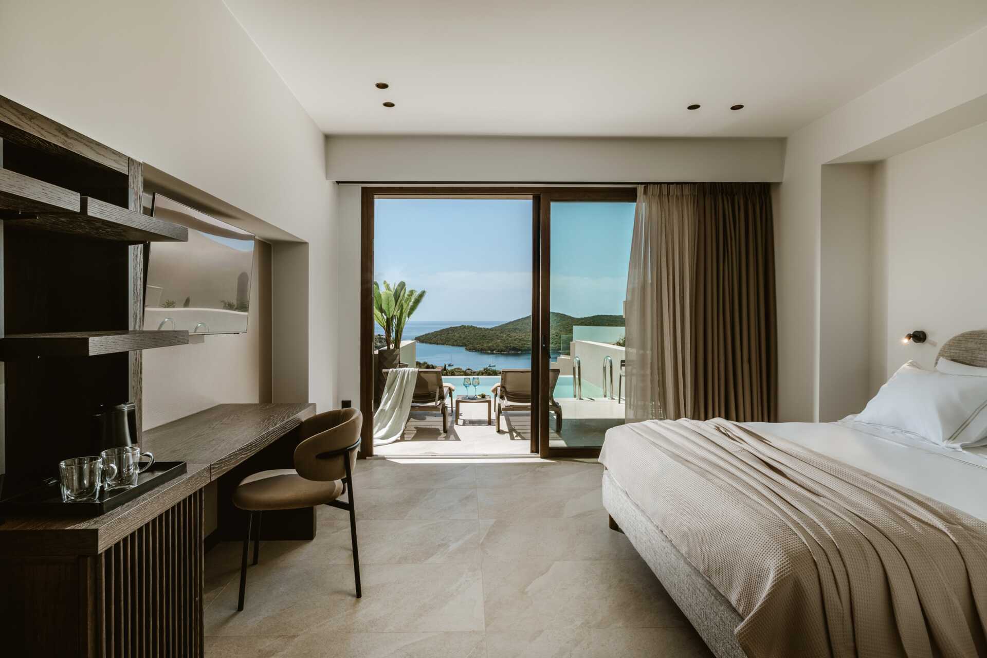 Juniorsvit med plunge pool och havsutsikt på markterrassen. En dubbelsäng. Möjlighet till en extrabädd i enkelsäng. Wifi, luftkonditionering och deponering ingår. Minibar. Vattenkokare samt te. Tv med internationella kanaler. Hårtork. Badrum med dusch samt wc. Städning 6 ggr/vecka.