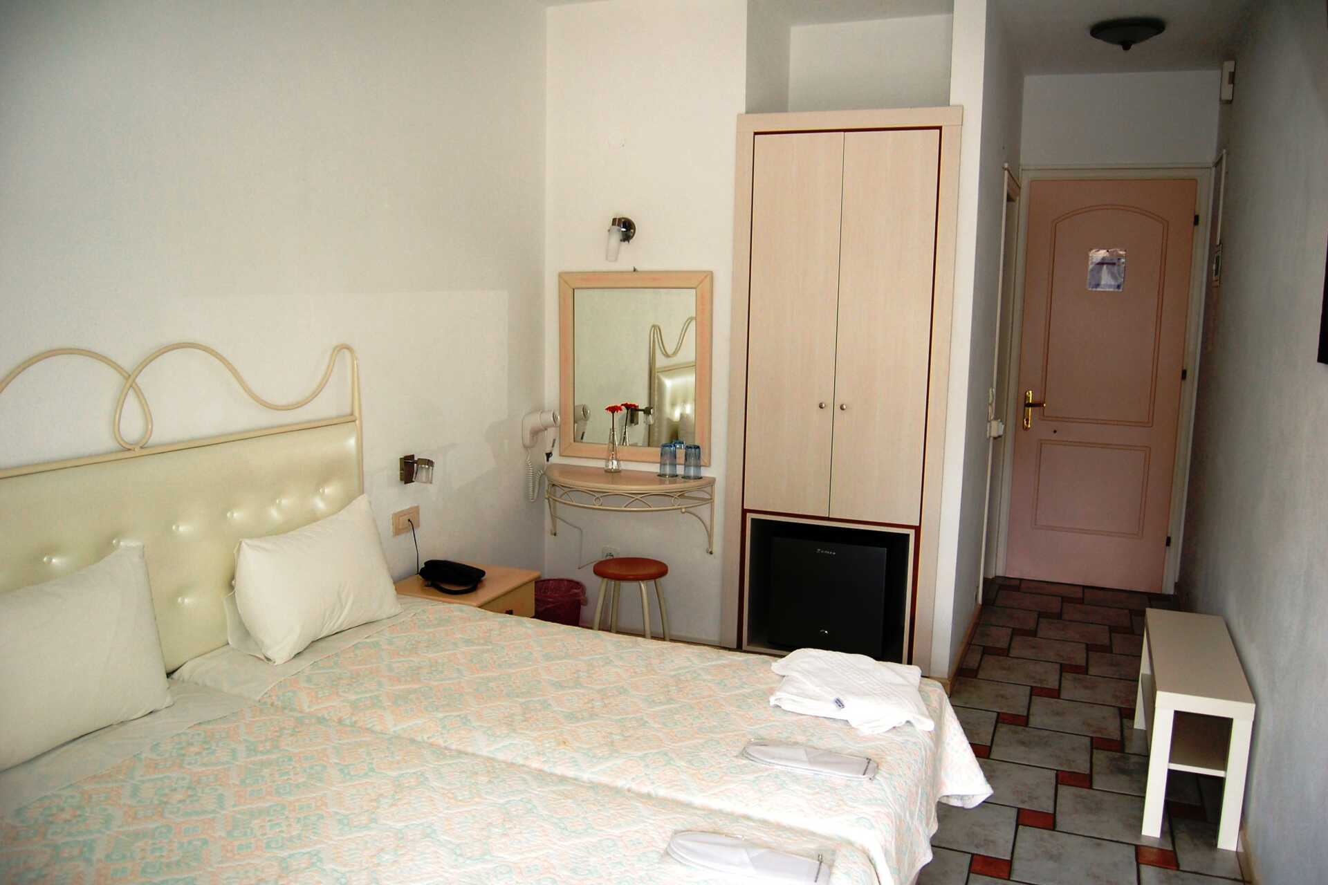 Dubbelrum med balkong eller terrass. En dubbelsäng eller två enkelsängar. Möjlighet till extrabädd. Wifi, luftkonditionering och deponering ingår. Kylskåp. Tv med lokala kanaler. Hårtork. Badrum med dusch och wc. Städning 7 ggr/veckan.