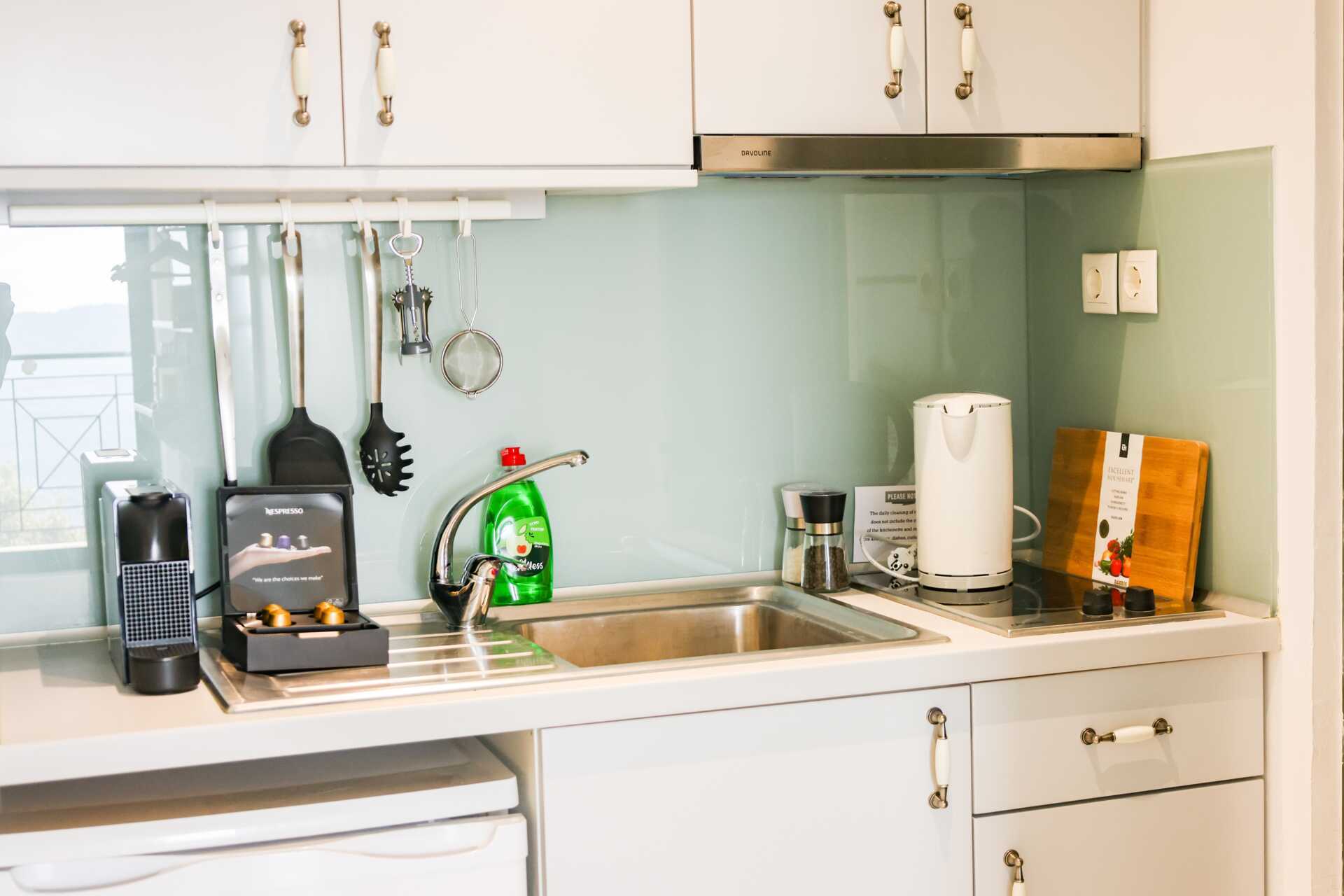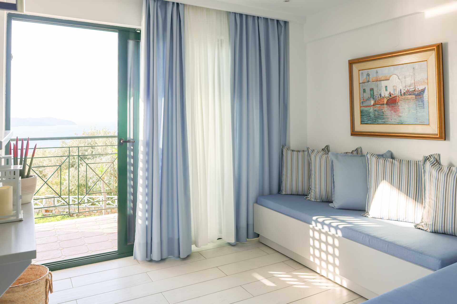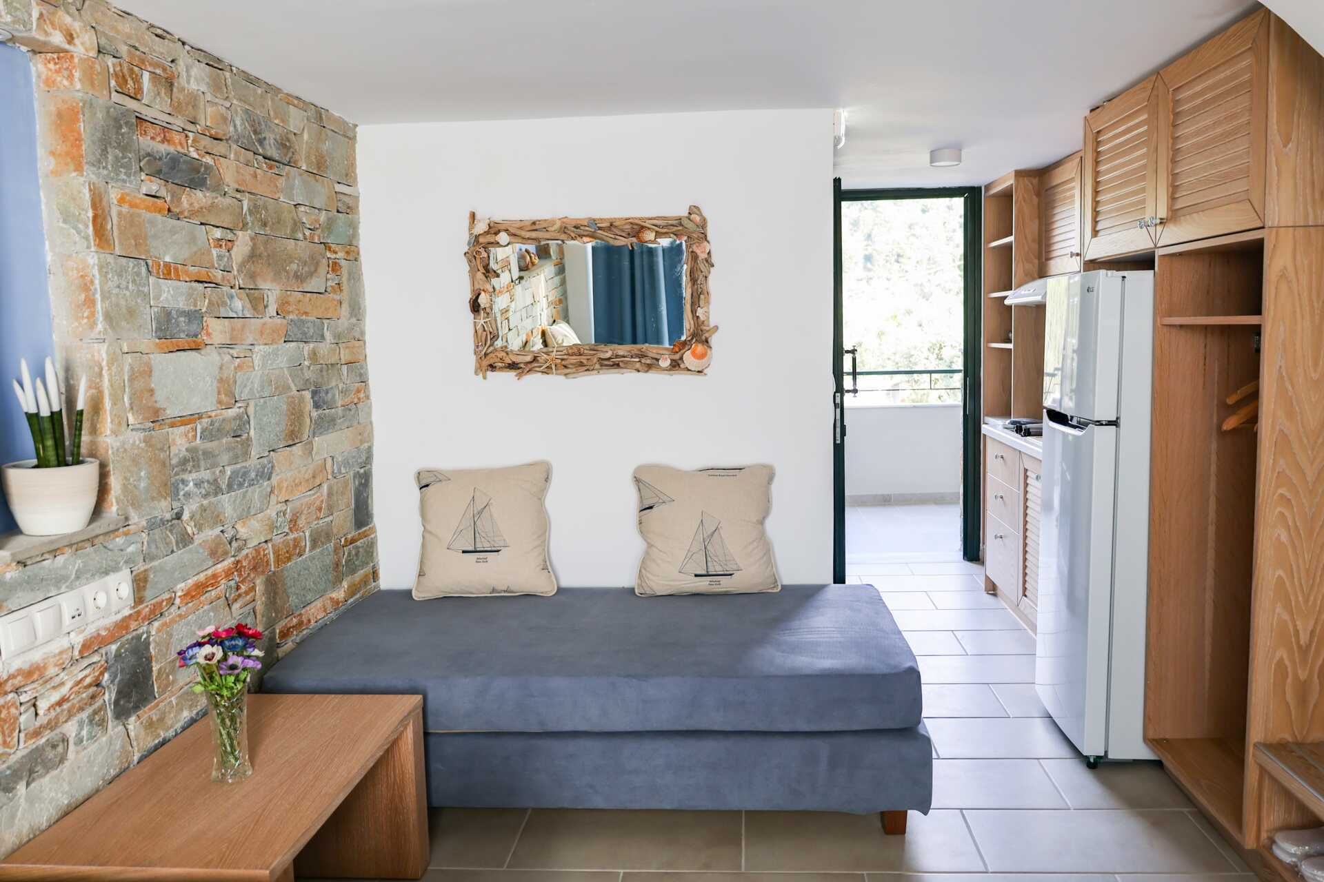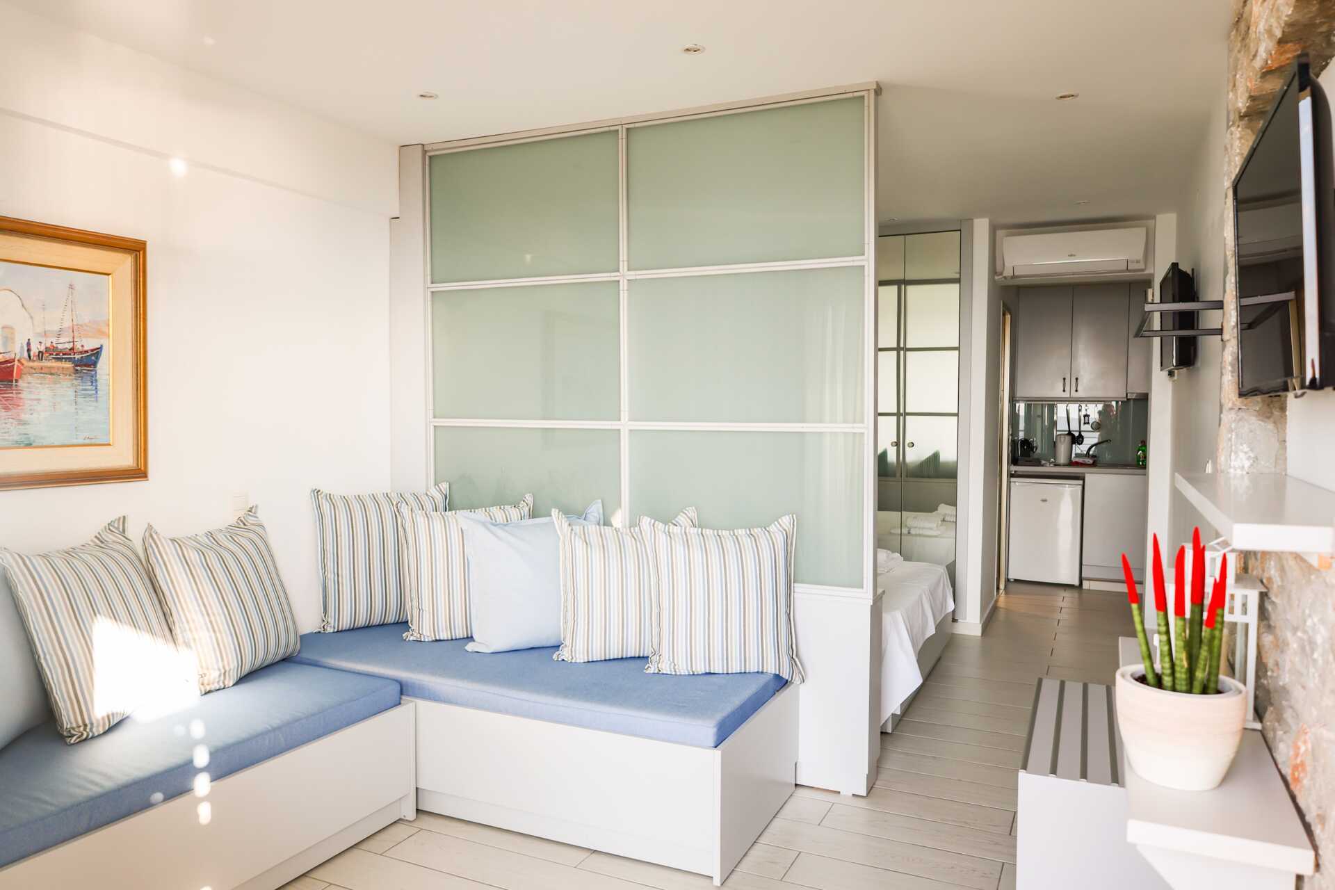 Enrumslägenhet superior med balkong och havsutsikt. Kombinerat sovrum med minikök. En dubbelsäng eller två enkelsängar. Minikök med kokplattor, kylskåp, vattenkokare och enkel köksutrustning. Wifi, luftkonditionering och deponering ingår. Tv med internationella kanaler. Hårtork. Badrum med dusch och wc. Städning 6 ggr/vecka.