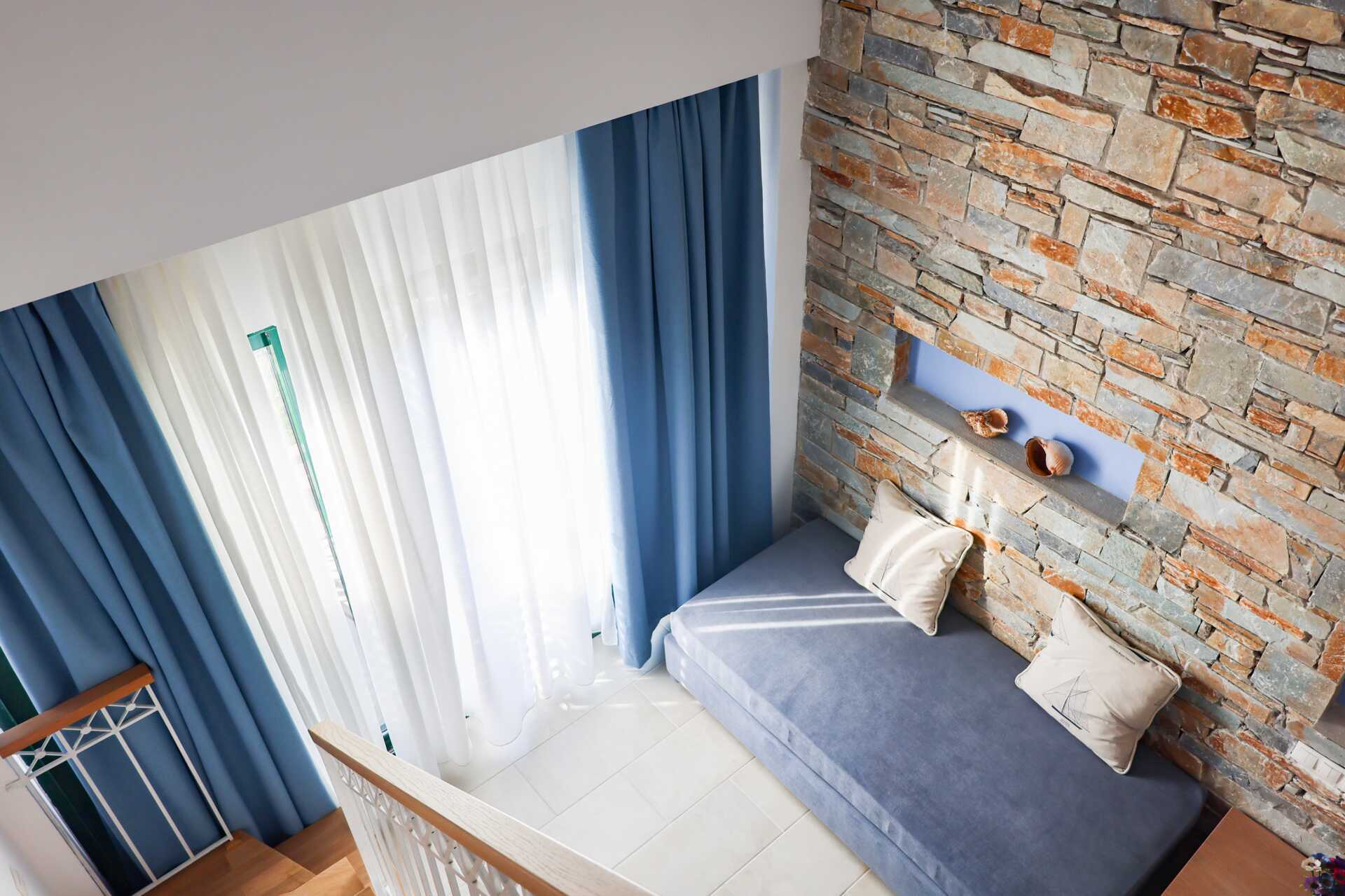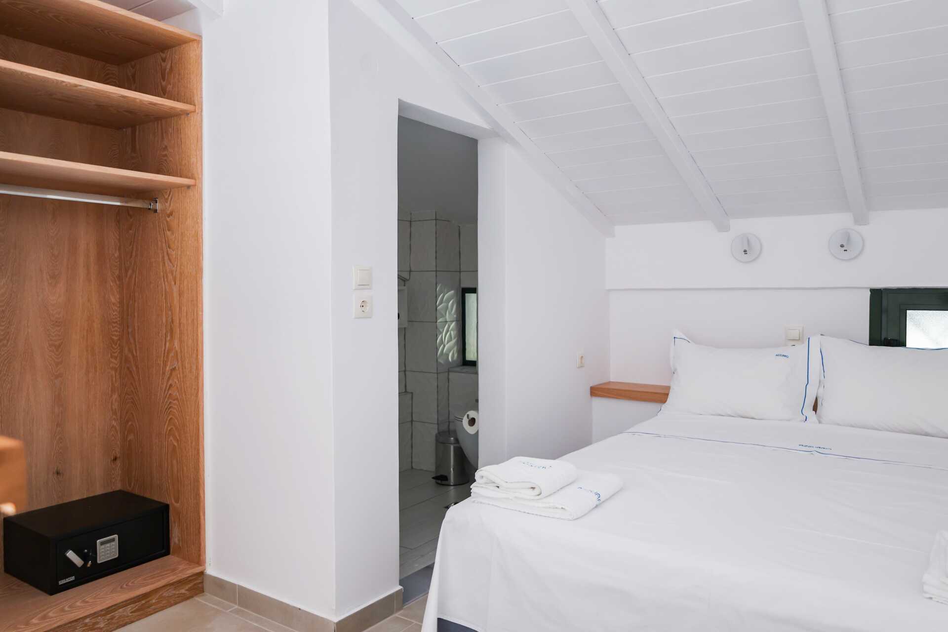 Enrumslägenheter i etage med balkong, vissa med havsutsikt. På entréplanet finns ett kombinerat vardagsrum med ett minikök samt ett badrum. Möjlighet med extrabäddar i två bäddsoffor. En trappa upp finns ett sovloft med en dubbelsäng. Minikök med kokplattor, kylskåp, vattenkokare och enkel köksutrustning. Wifi, luftkonditionering och deponering ingår. Tv med internationella kanaler. Hårtork. Badrum med dusch och wc. Städning 6 ggr/vecka.