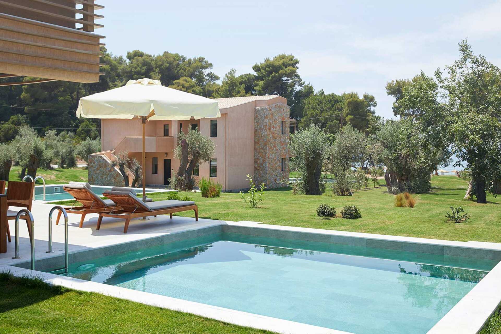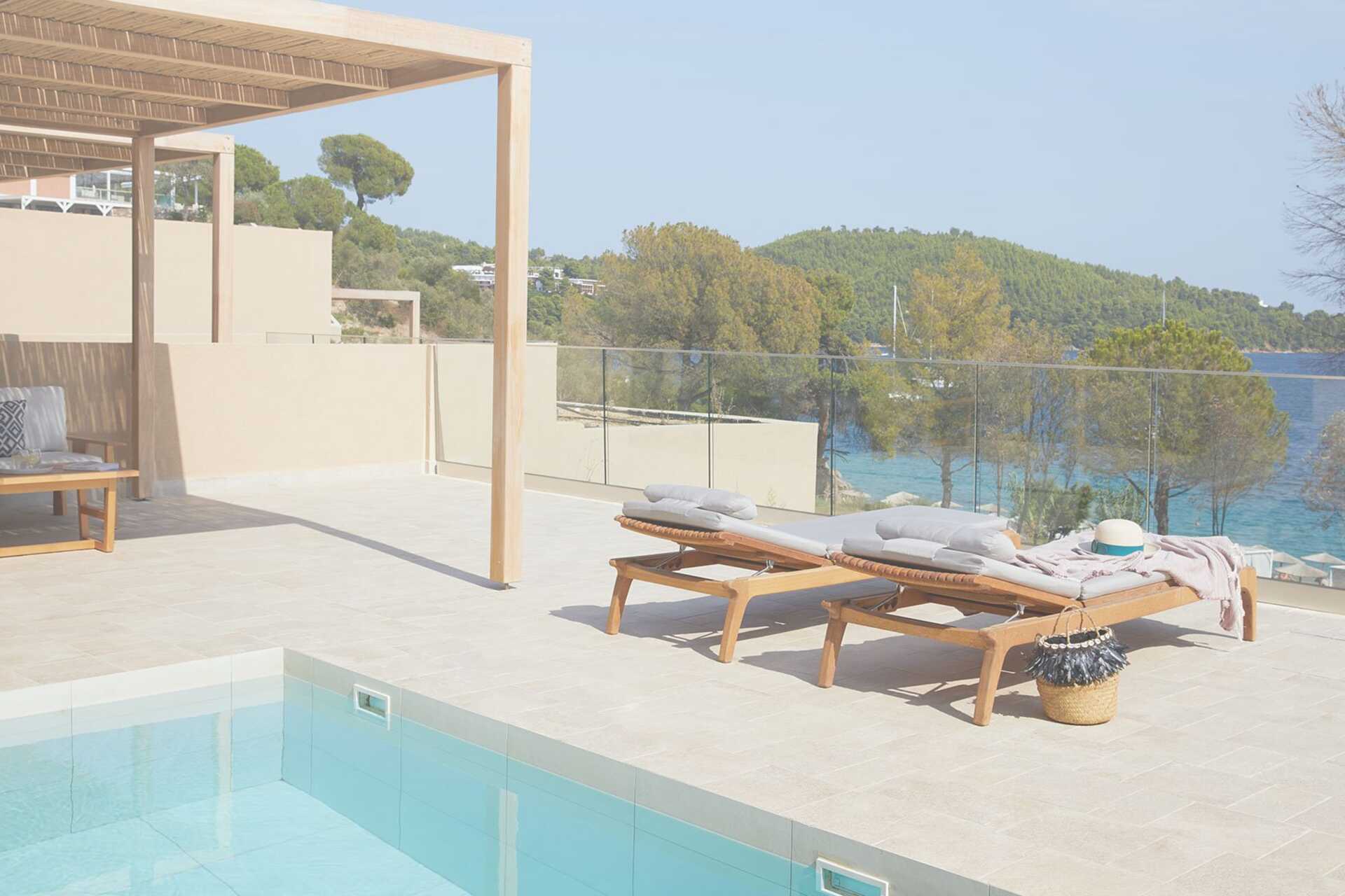 Dubbelrum med markterrass och utgång till en delad pool. På markterrassen finns bord och stolar, solstolar samt en stege ner i poolen. Rummen ligger i Xenia som är hotellets huvudbyggnad. En dubbelsäng. Kuddmeny. Wifi, luftkonditionering och deponering ingår. Kylskåp. Nespressomasin och vattenkokare. Tv med internationella kanaler. Hårtork. Badrum med dusch och wc. Städning 7 ggr/vecka.