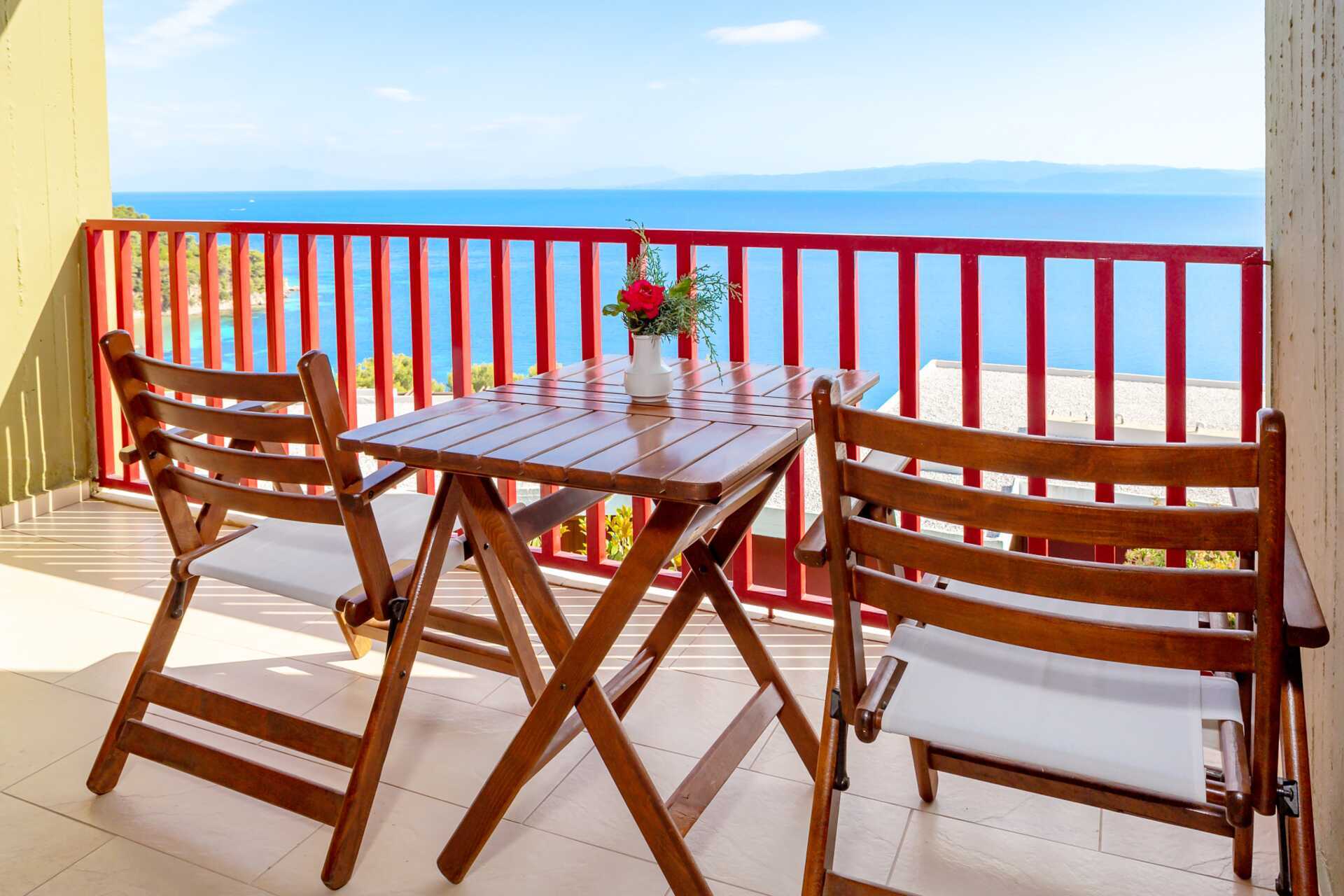 Dubbelrum med balkong och direkt havsutsikt. En dubbelsäng eller två enkelsängar. Möjlighet till extrabädd i hopfällbar säng. Wifi, luftkonditionering och deponering ingår. Kylskåp. Vattenkokare. Tv med internationella kanaler. Hårtork. Badrum med badkar och wc. Städning 7 ggr/vecka.