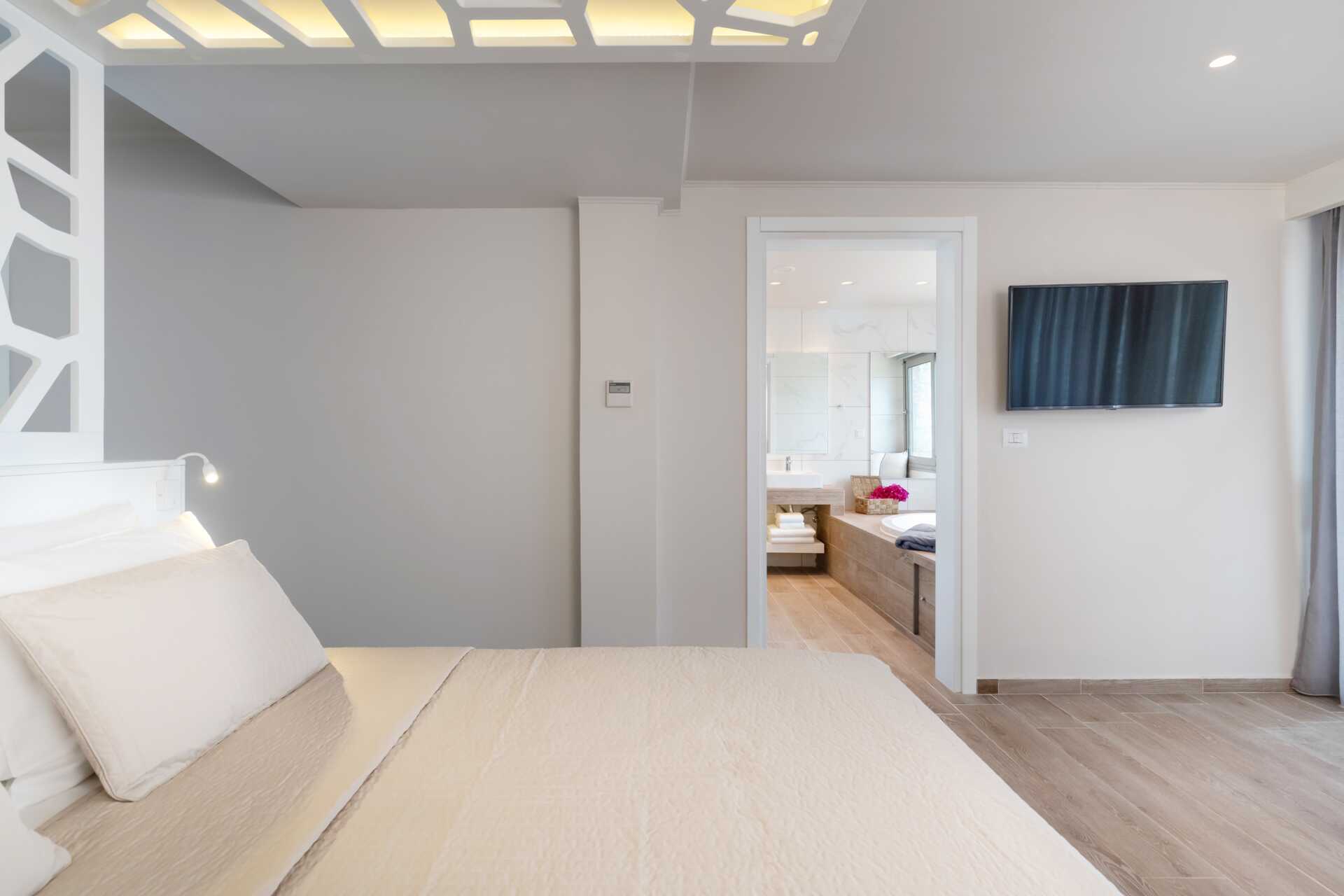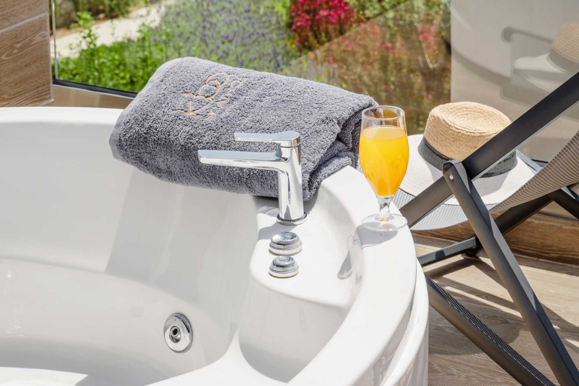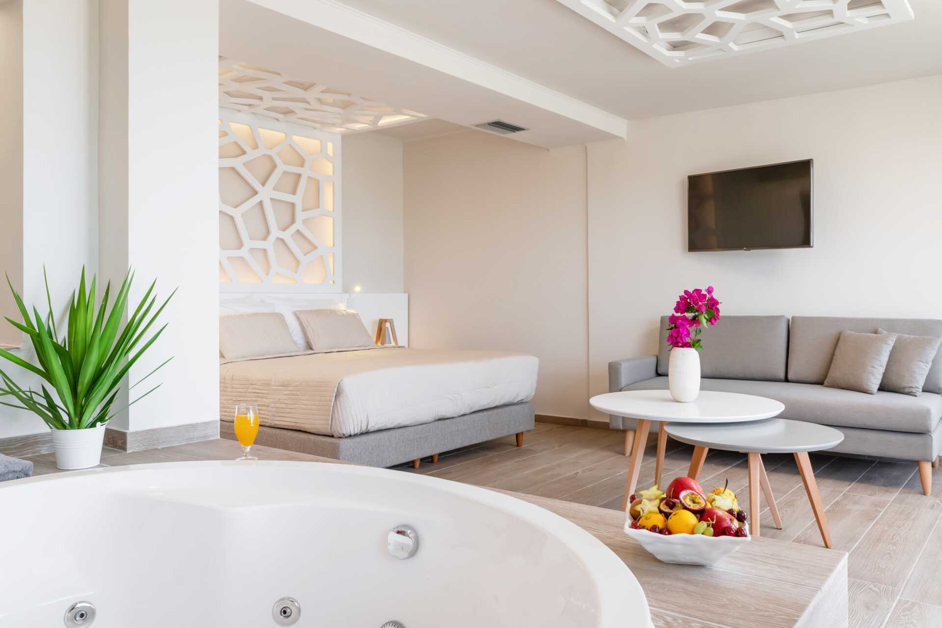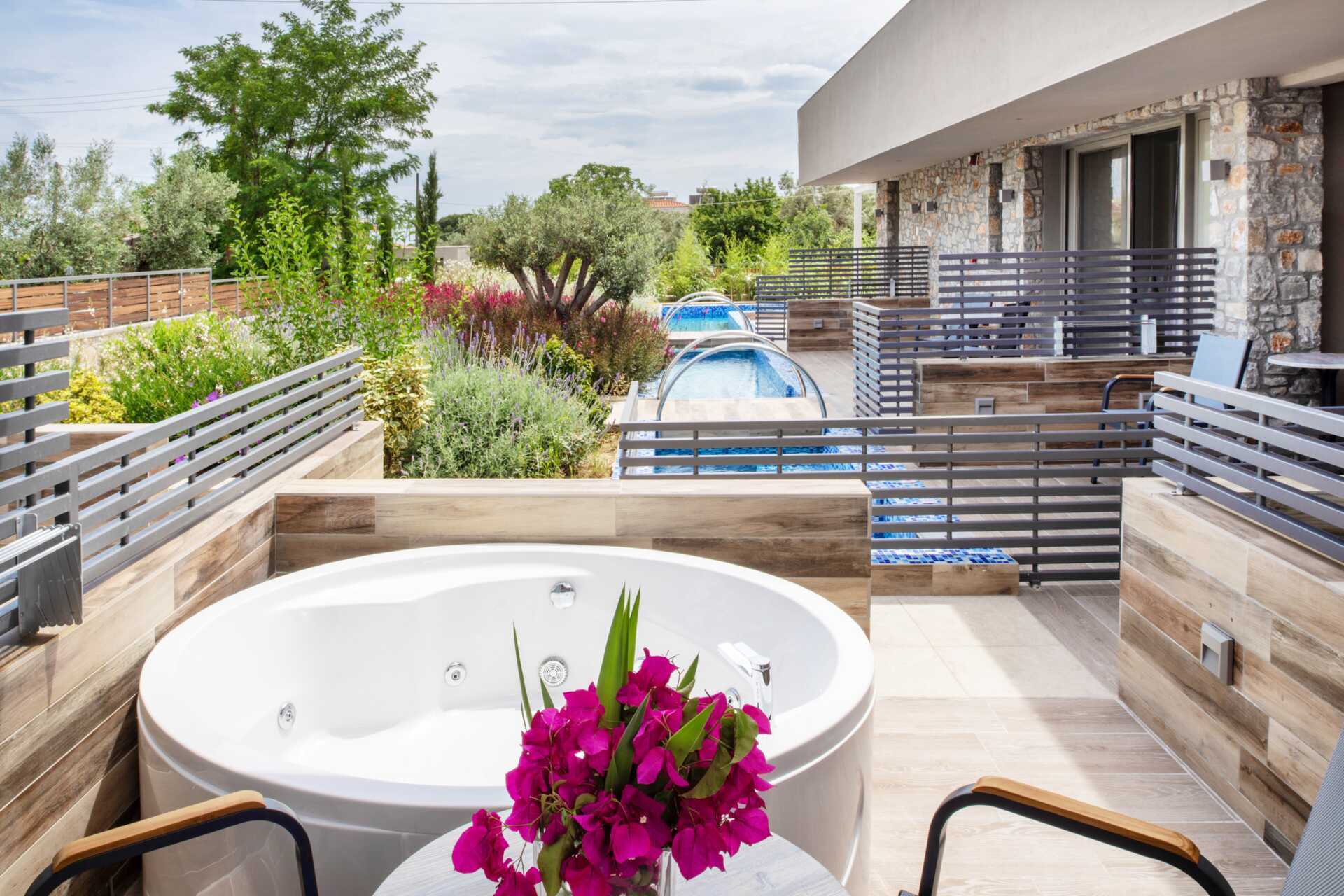 Deluxesvit med balkong och en jacuzzi på balkongen eller inomhus. En dubbelsäng. Wifi, luftkonditionering och deponering ingår. Minibar. Tv med internationella kanaler. Hårtork. Badrockar och tofflor. Badrum med dusch och wc. Städning 7 ggr/vecka. Uteplatsen inte är helt privat, utan det finns viss insyn från grannarna.
