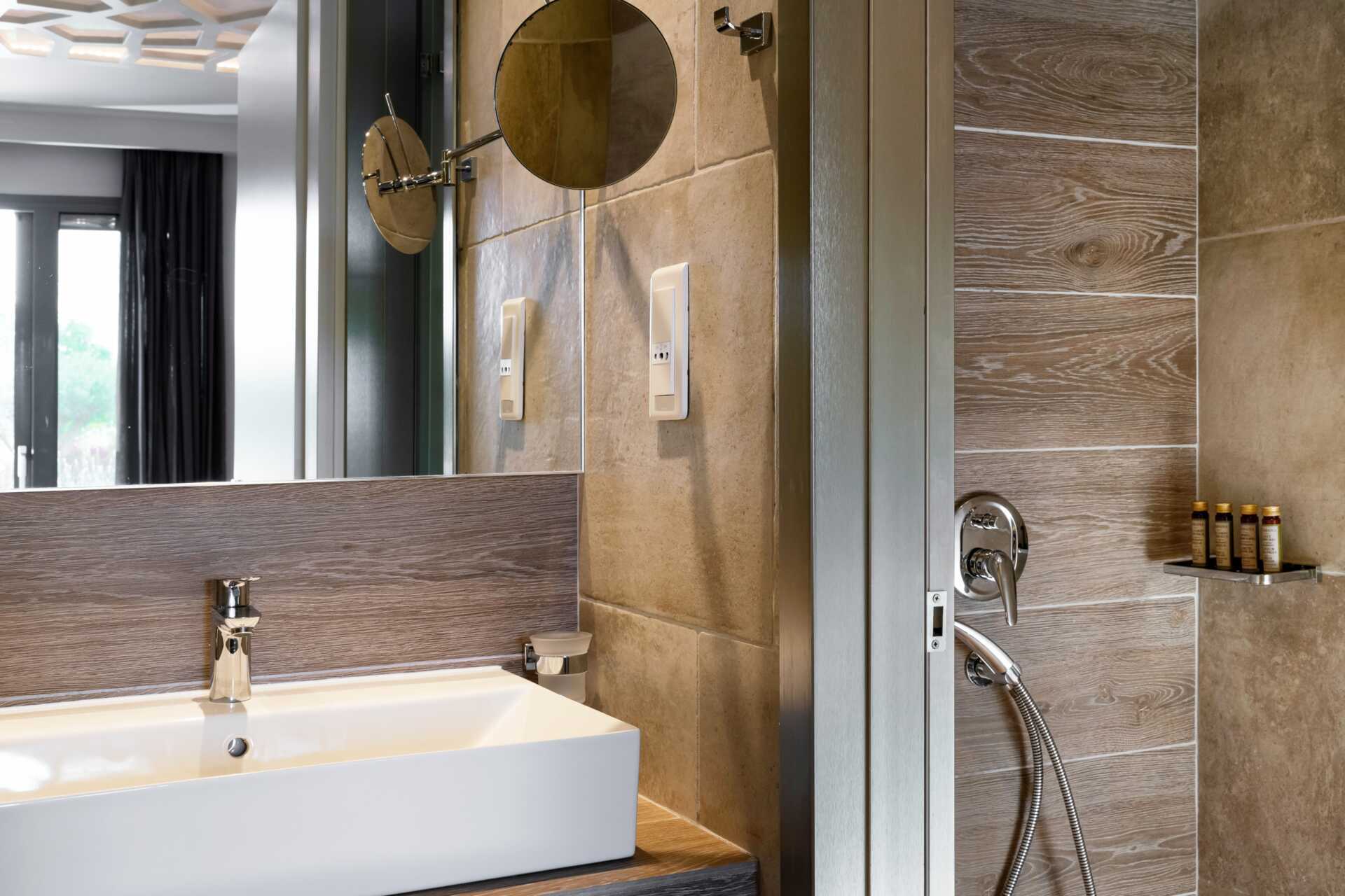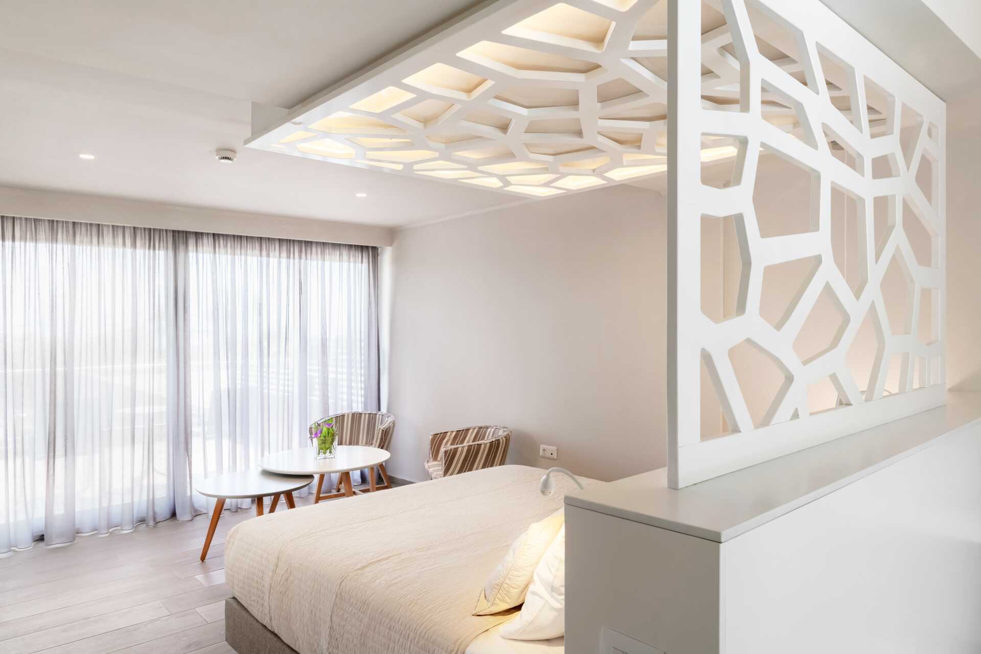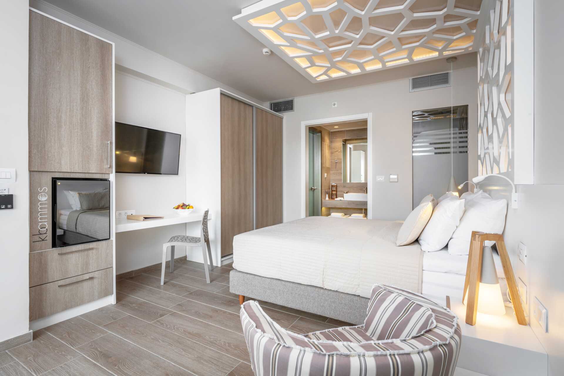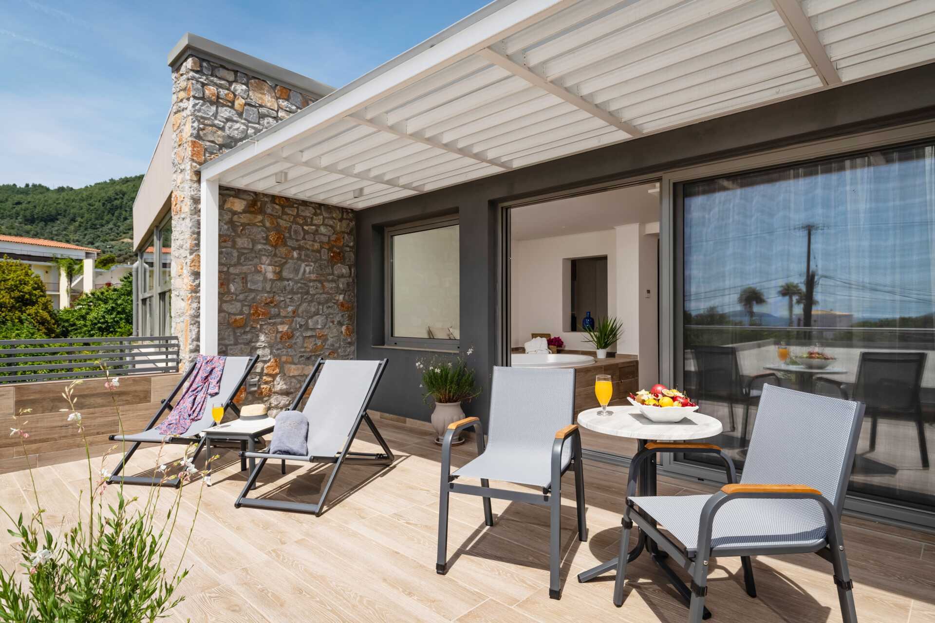 Deluxesvit med balkong och en jacuzzi på balkongen eller inomhus. En dubbelsäng. Wifi, luftkonditionering och deponering ingår. Minibar. Tv med internationella kanaler. Hårtork. Badrockar och tofflor. Badrum med dusch och wc. Städning 7 ggr/vecka. Uteplatsen inte är helt privat, utan det finns viss insyn från grannarna.