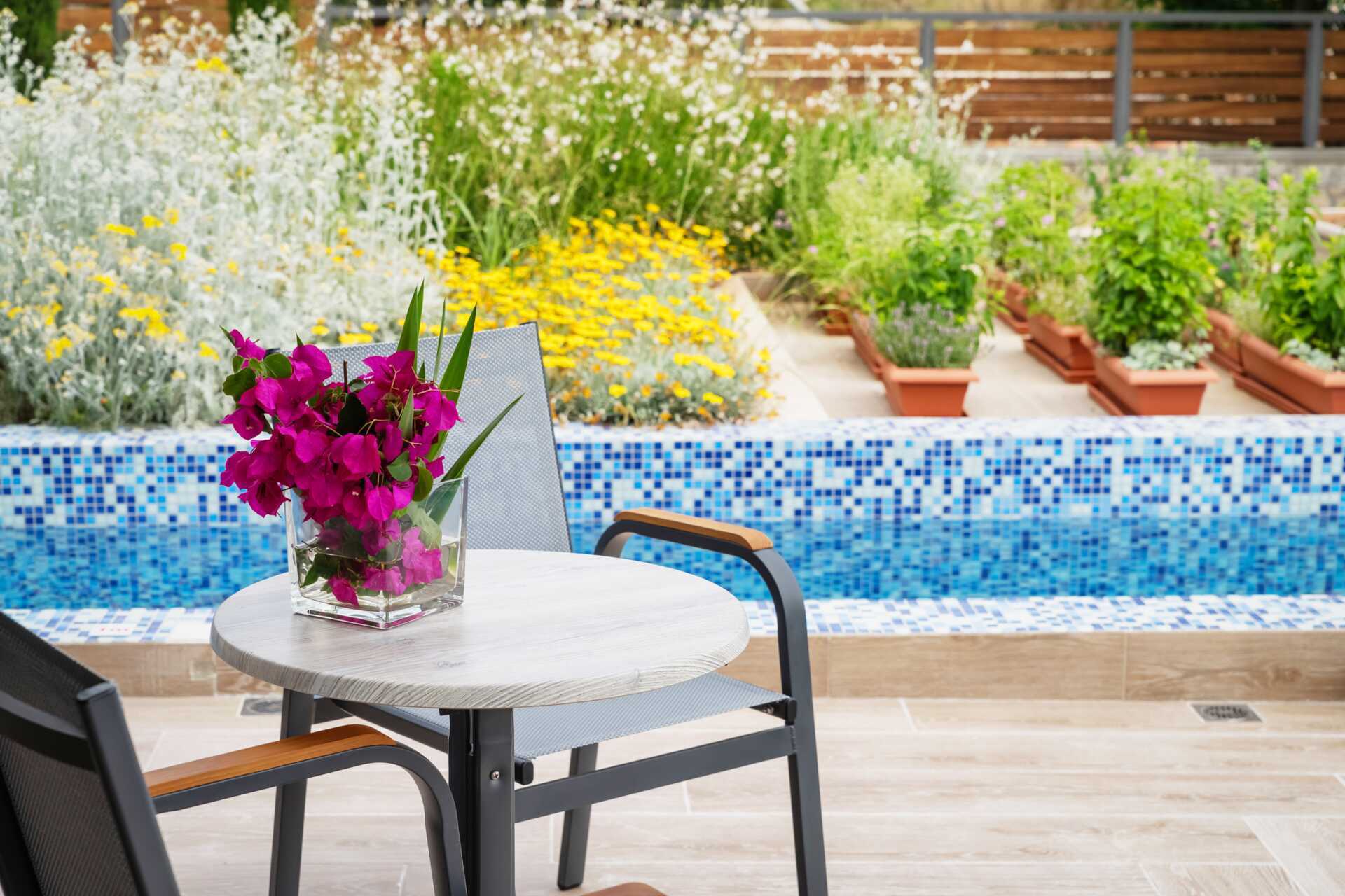 Deluxerum med markterrass och jacuzzi utomhus. En dubbelsäng. Wifi, luftkonditionering och deponering ingår. Minibar. Tv med internationella kanaler. Hårtork. Badrockar och tofflor. Badrum med dusch och wc. Städning 7 ggr/vecka. Uteplatsen inte är helt privat, utan det finns viss insyn från grannarna.