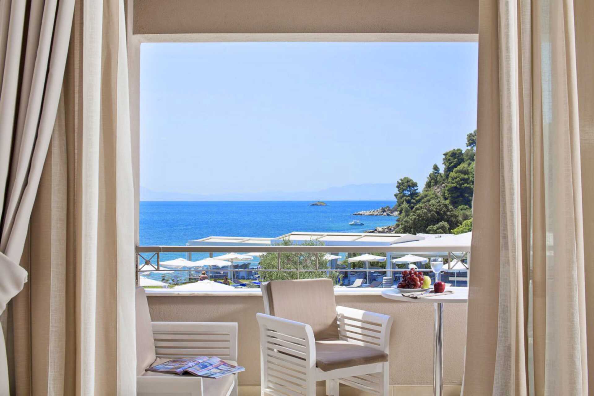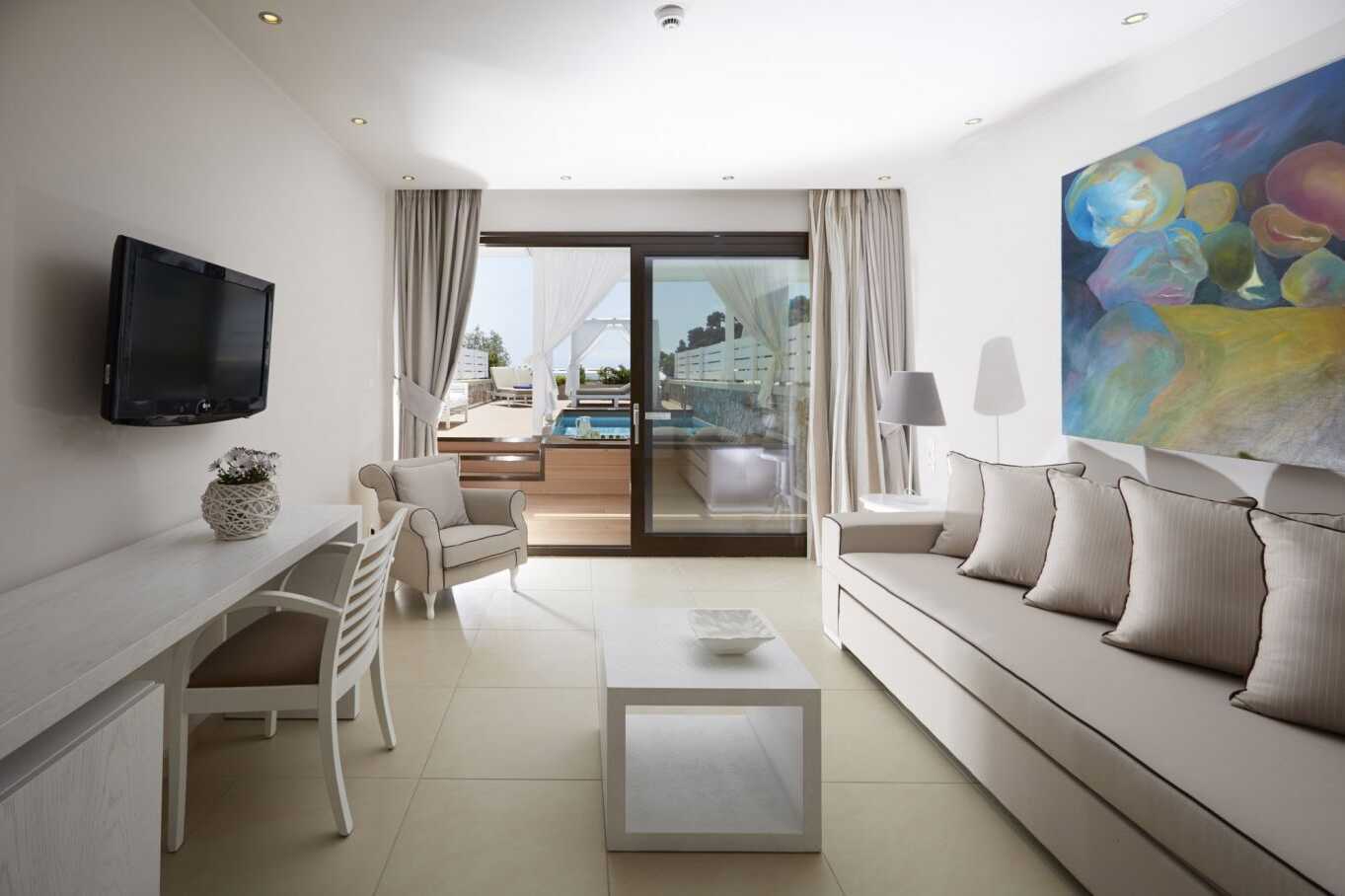 Deluxerum med balkong och havsutsikt. En jacuzzi och solstolar på balkongen. En dubbelsäng. Wifi, luftkonditionering och deponering ingår. Kylskåp. Vattenkokare samt kaffe och te. Tv med internationella kanaler. Badrockar och tofflor. Hårtork. Badrum med dusch och wc. Städning 7 ggr/vecka.