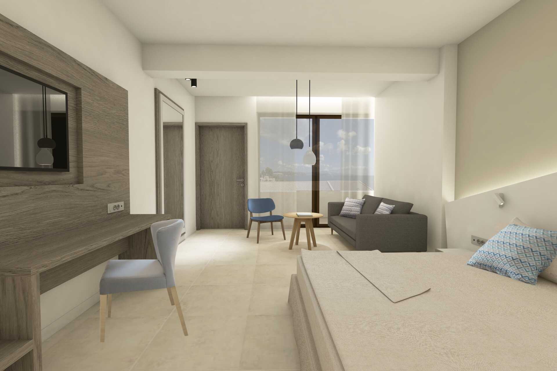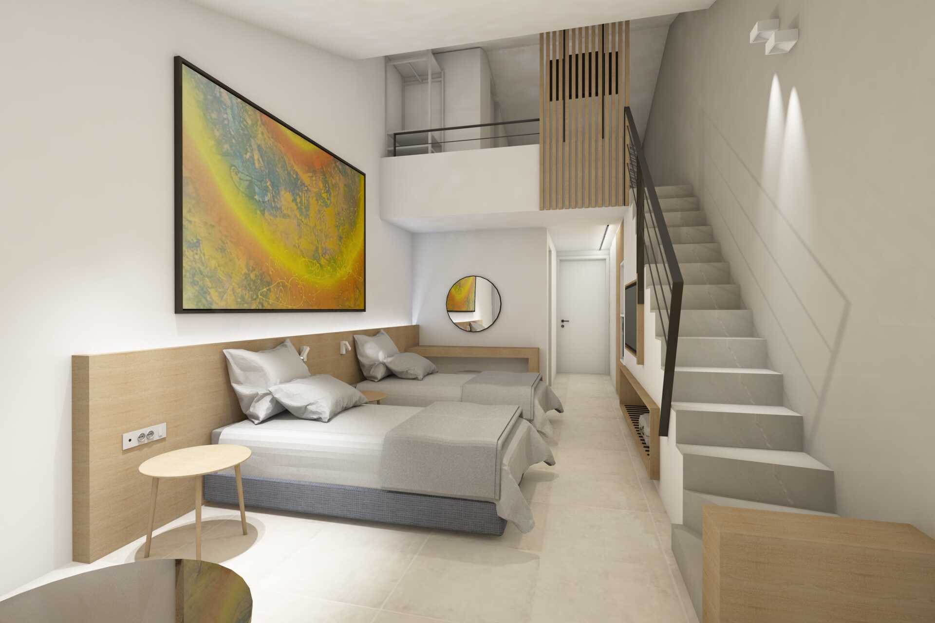 Renoverade dubbelrum i etage med balkong och havsutsikt. På entréplanet finns ett vardagsrum med möjlighet till extrabäddar i bäddsoffa samt ett badrum med dusch och wc. En trappa upp finns en dubbelsäng och ett badrum med dusch och wc. Wifi, luftkonditionering och deponering ingår. Kylskåp och vattenkokare. En tv med internationella kanaler finns på båda våningarna. Hårtork. Tofflor. Städning 7 ggr/vecka. Barn under två år räknas in i maxantalet personer i rummet. Bilderna som visas här är skisser och kommer att uppdateras så fort Apollo får riktiga bilder från hotellet. Skisserna kan skilja sig från verkligheten.