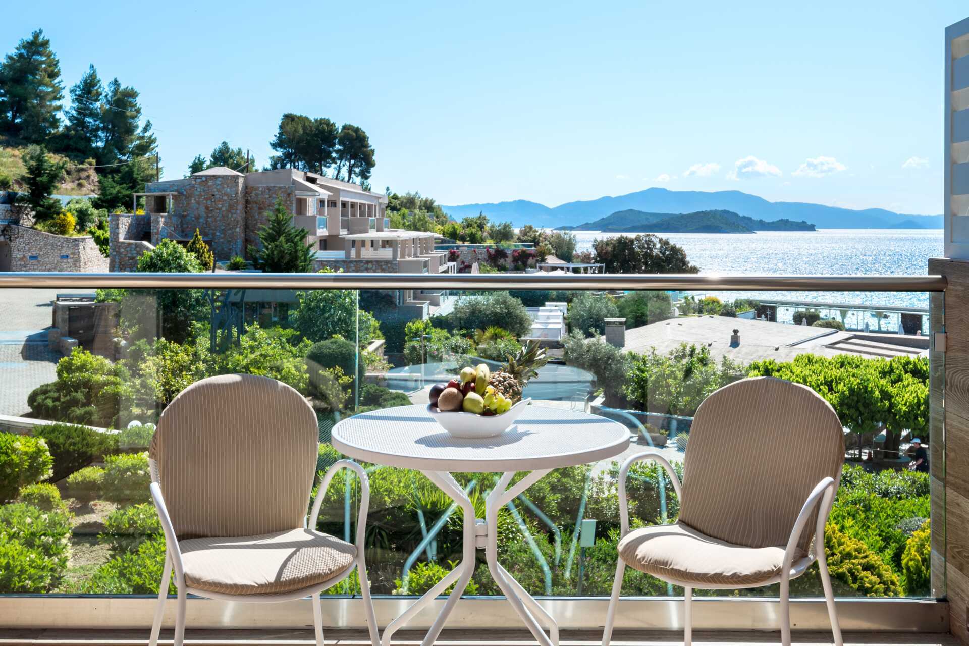 Executiverum med balkong och havsutsikt. En dubbelsäng samt soffa, bord och fåtöljer. Wifi, luftkonditionering och deponering ingår. Kylskåp och vattenkokare. Tv med internationella kanaler. Hårtork. Badrockar och tofflor. Badrum med dusch och wc. Städning 7 ggr/vecka. Barn under två år räknas in i maxantalet personer i rummet.