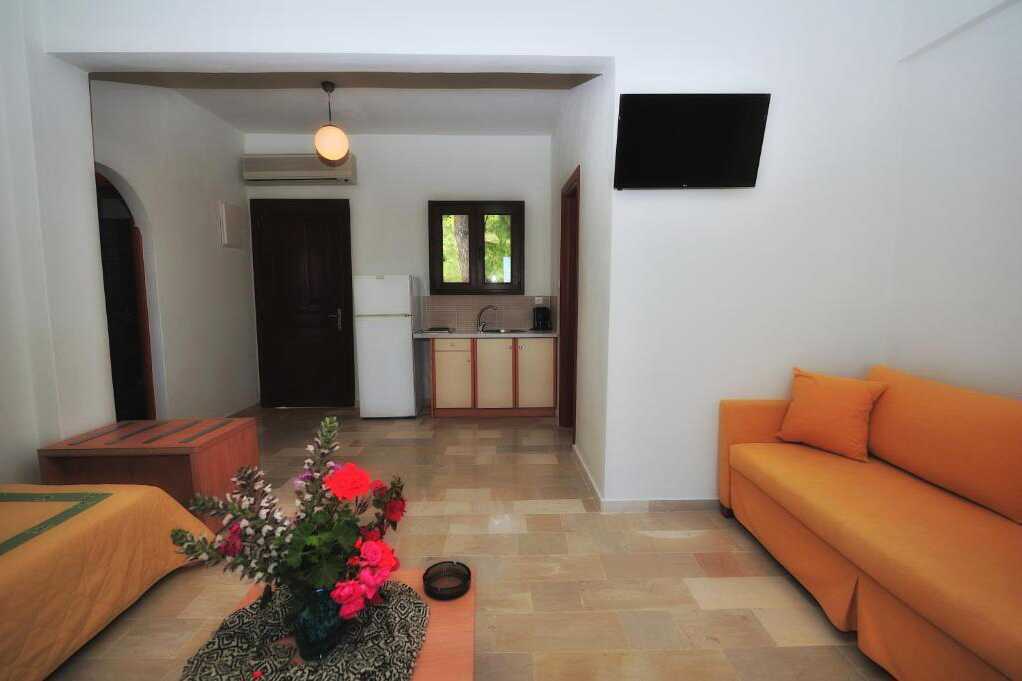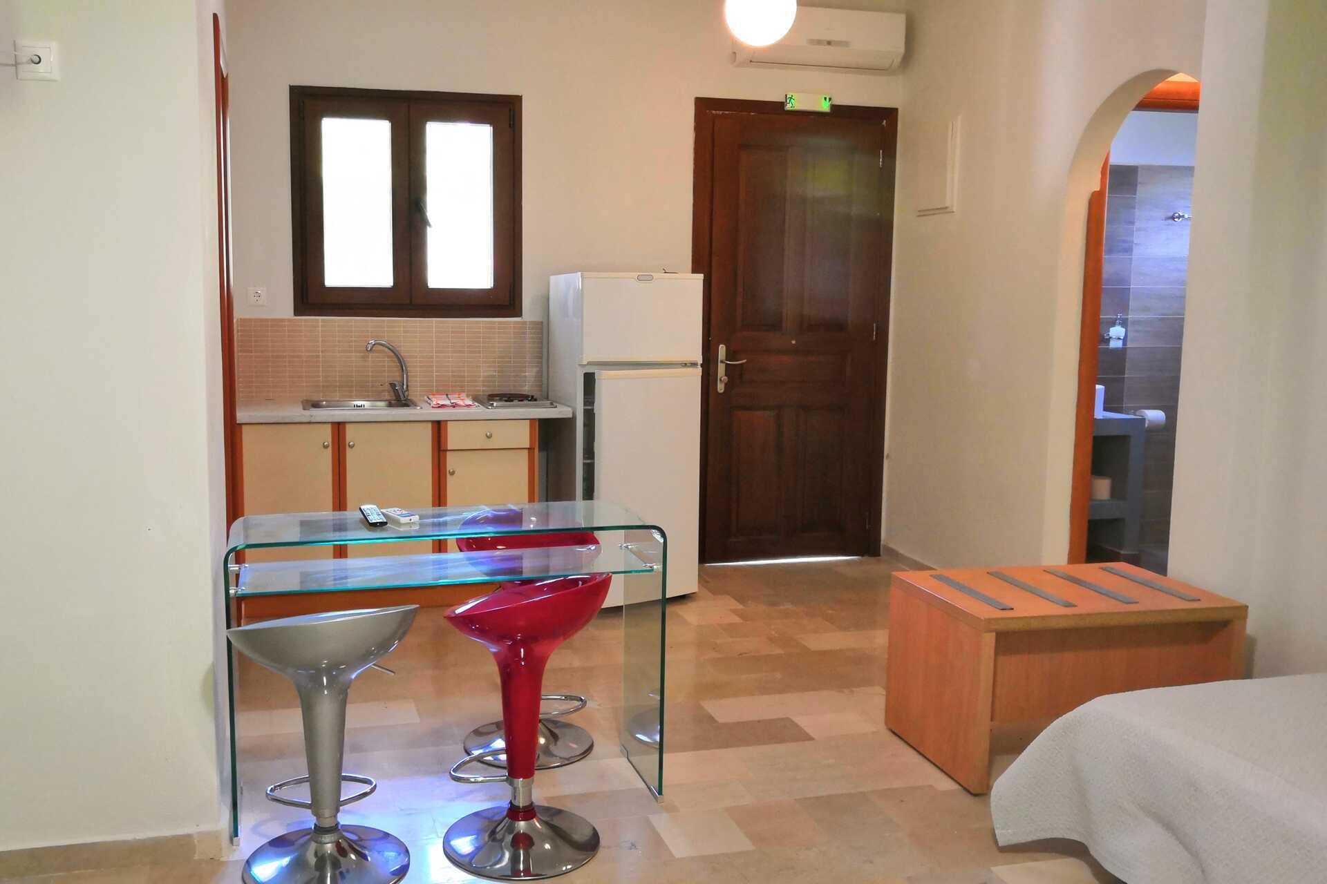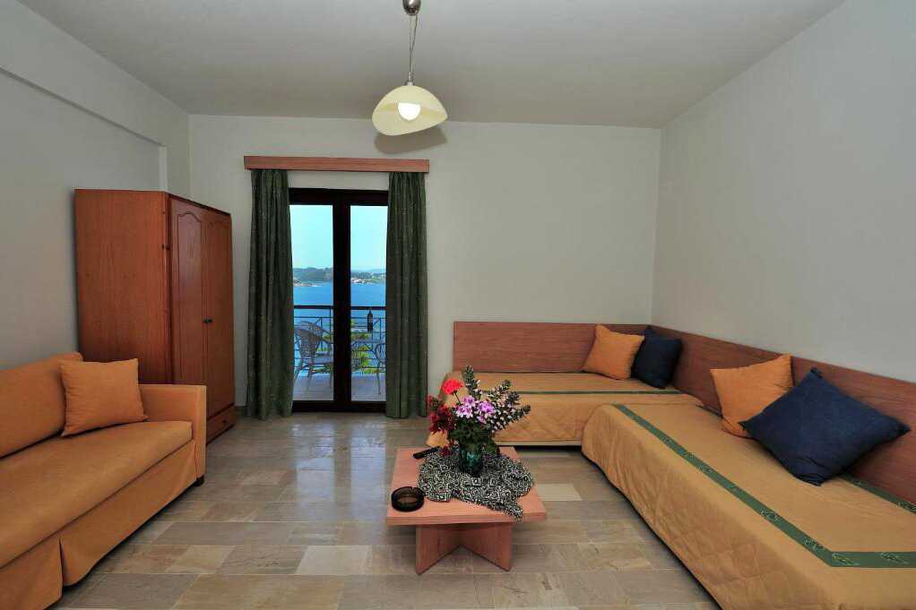 Enrumslägenhet med balkong eller terrass och havsutsikt. Sovrum kombinerat med minikök. En dubbelsäng eller två enkelsängar. Möjlighet till extrabädd i enkelsäng. Minikök med kylskåp, kokplattor, vattenkokare och enkel köksutrustning. Tv med lokala kanaler. Hårtork. Badrum med dusch och wc. Städning 6 ggr/vecka.