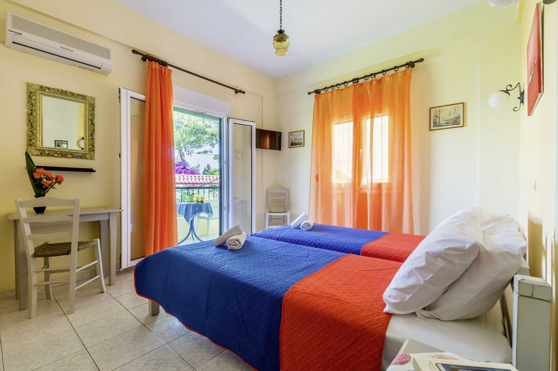 Dubbelrum med balkong. Två enkelsängar. Möjlighet till extrabädd i enkelsäng. Wifi ingår. Luftkonditionering och deponering mot avgift. Kylskåp. Vattenkokare. Tv med lokala kanaler. Hårtork. Badrum med dusch och wc. Städning 7 ggr/vecka.