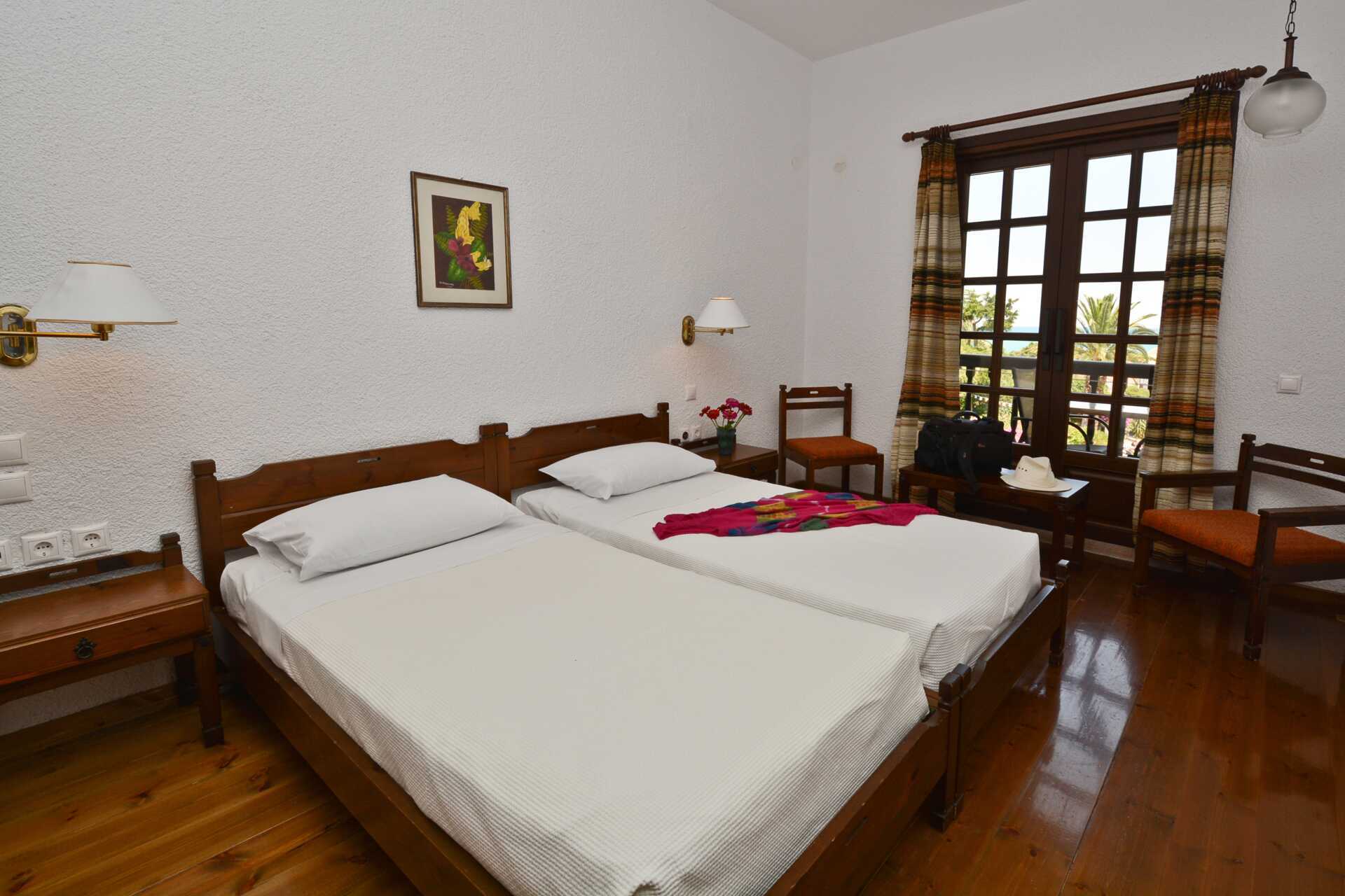 Dubbelrum med balkong eller terrass och havsutsikt. En dubbelsäng eller två enkelsängar. Wifi, luftkonditionering och deponering ingår. Hårtork. Badrum med badkar eller dusch samt wc. Städning 7 ggr/vecka.
