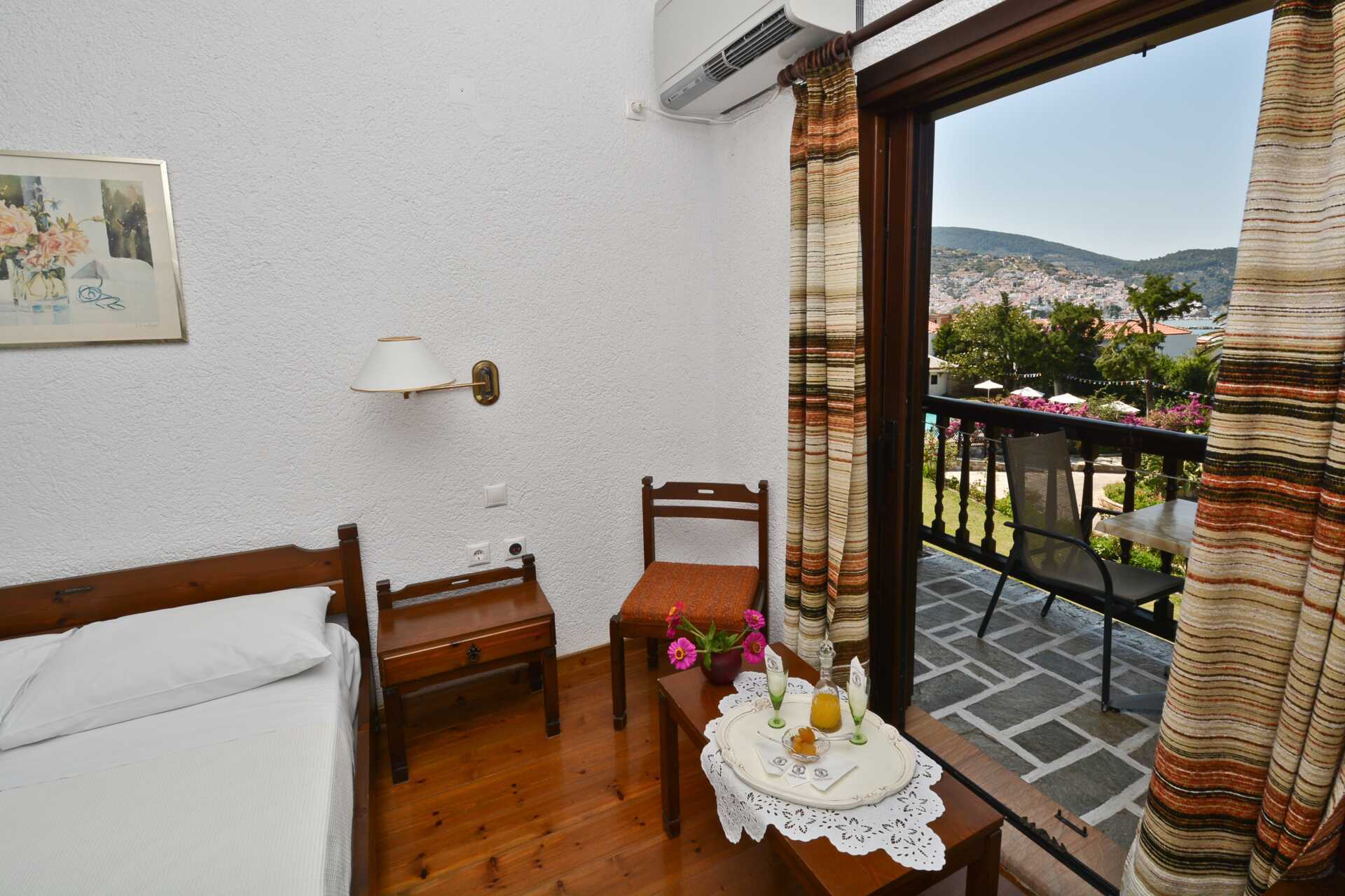 Dubbelrum med balkong eller terrass och trädgårdsutsikt. En dubbelsäng eller två enkelsängar. Wifi, luftkonditionering och deponering ingår. Hårtork. Badrum med badkar eller dusch samt wc. Städning 7 ggr/vecka.