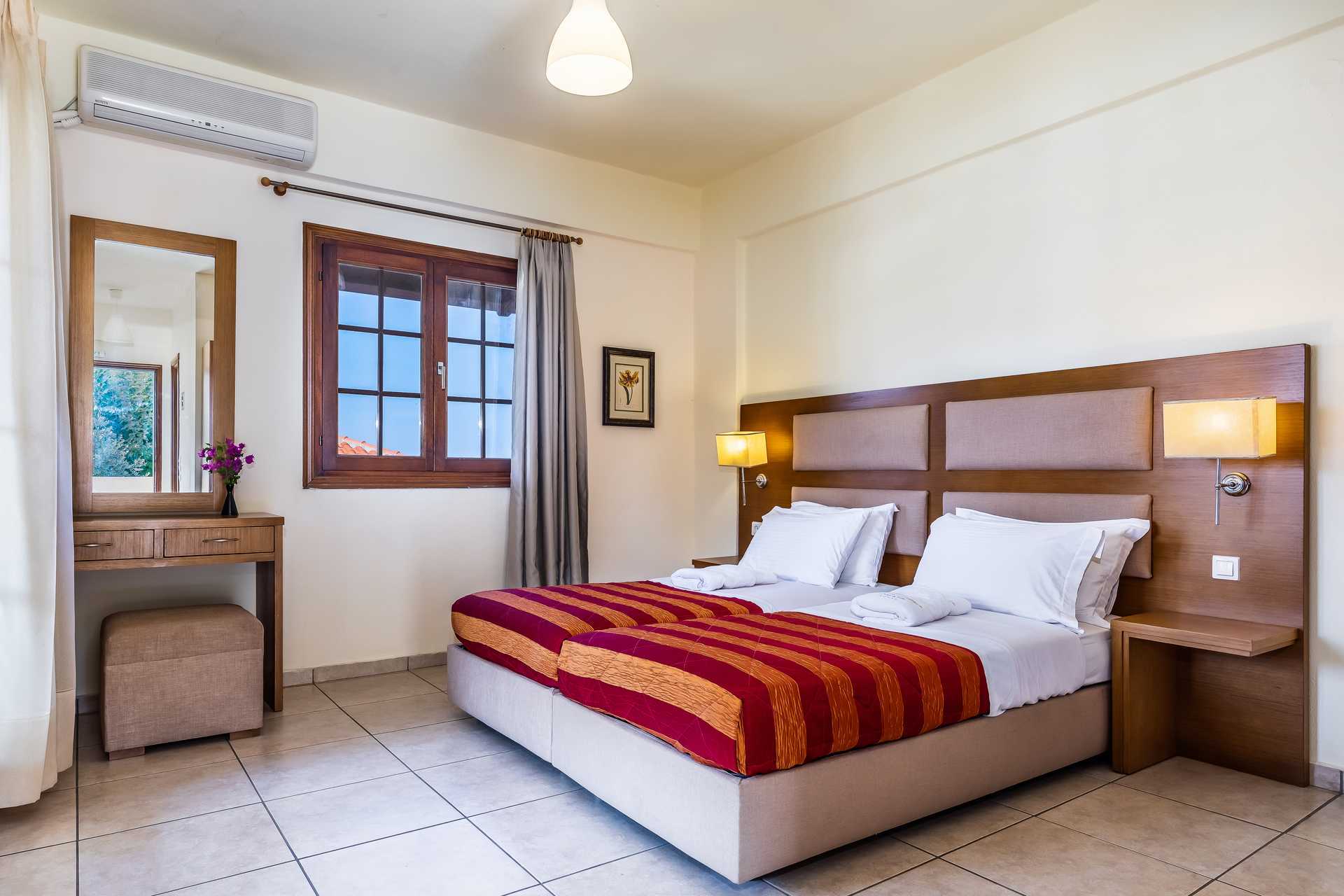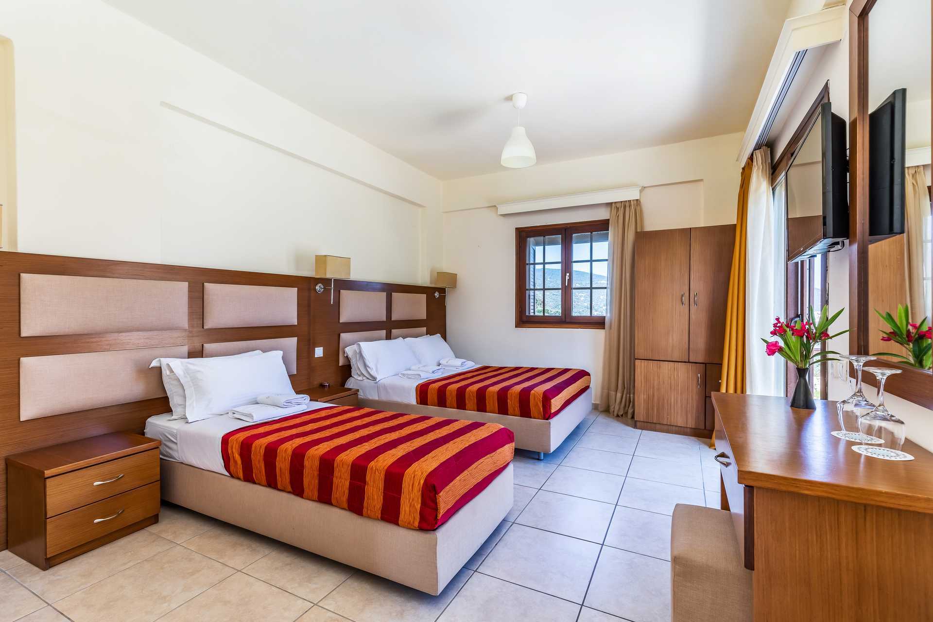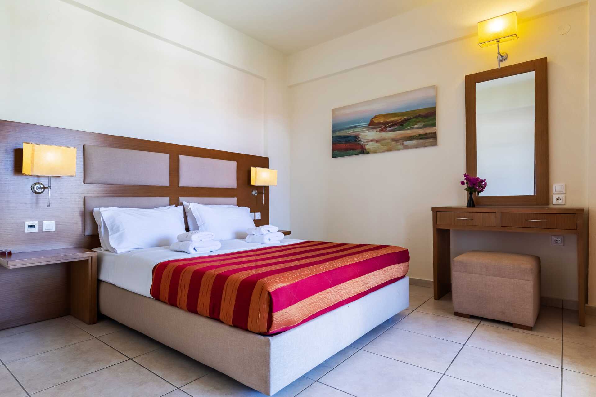Dubbelrum med balkong eller terrass. En dubbelsäng eller två enkelsängar. Möjlighet till extrabädd i hopfällbar säng eller i enkelsäng. Wifi, luftkonditionering och deponering ingår. Kylskåp. Tv med lokala kanaler. Hårtork. Badrum med dusch och wc. Städning 7 ggr/vecka.