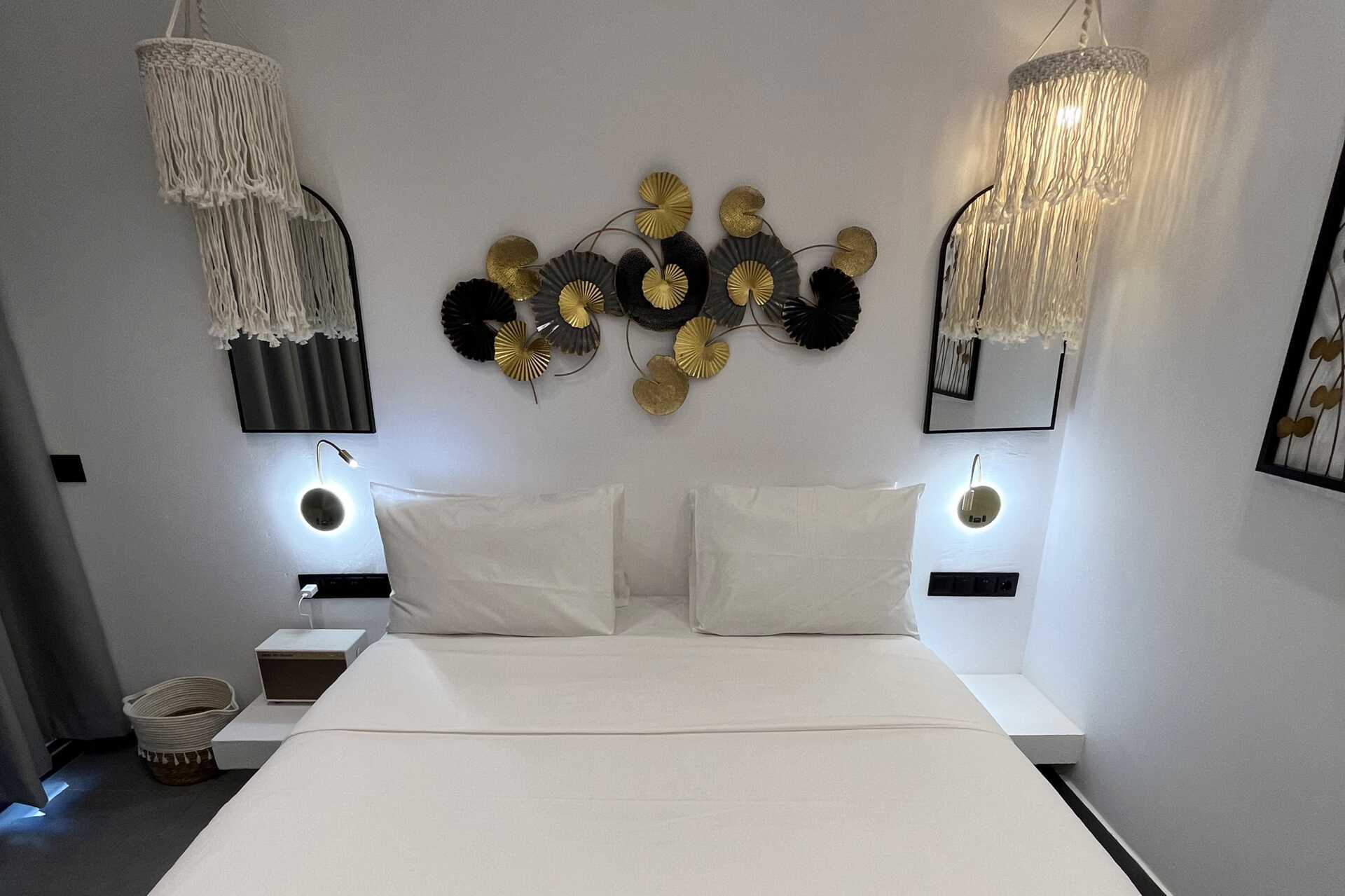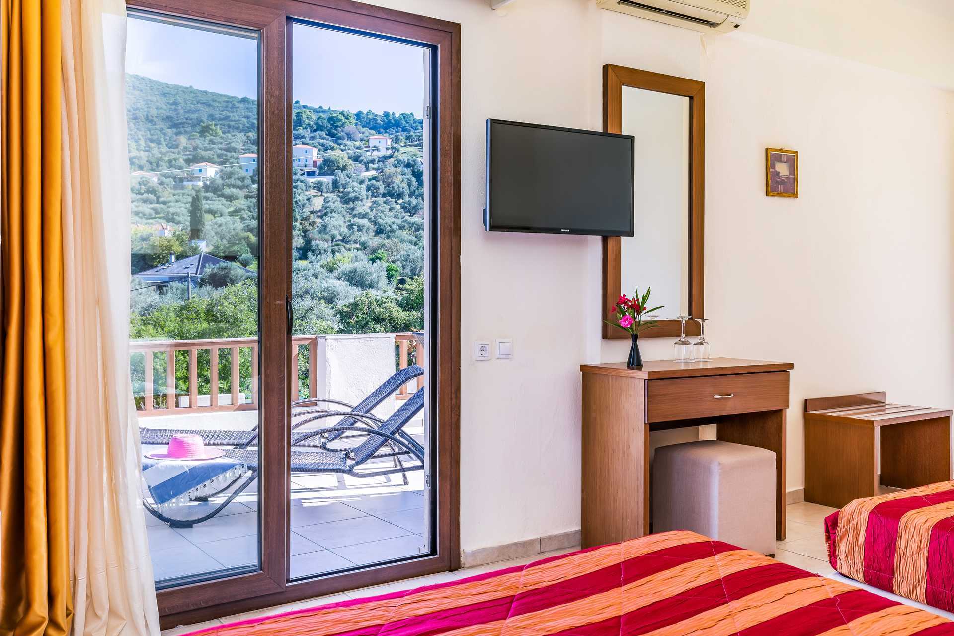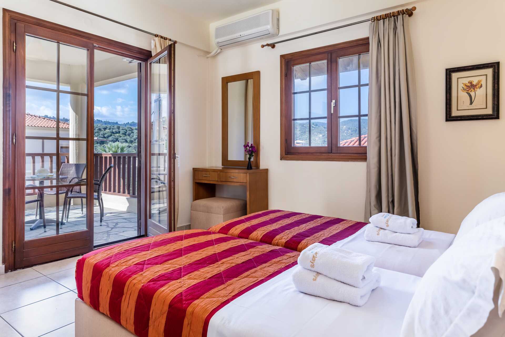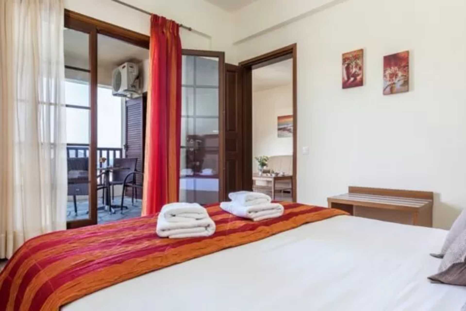 Dubbelrum med balkong eller terrass. En dubbelsäng eller två enkelsängar. Möjlighet till extrabädd i hopfällbar säng eller i enkelsäng. Wifi, luftkonditionering och deponering ingår. Kylskåp. Tv med lokala kanaler. Hårtork. Badrum med dusch och wc. Städning 7 ggr/vecka.