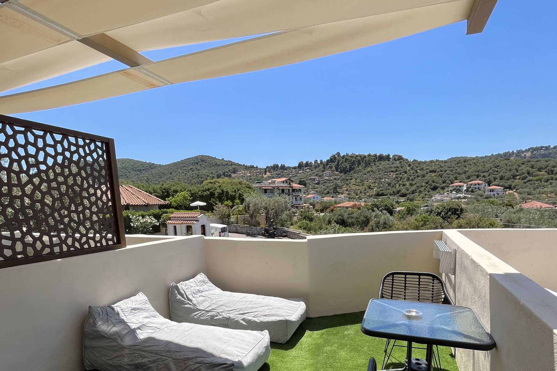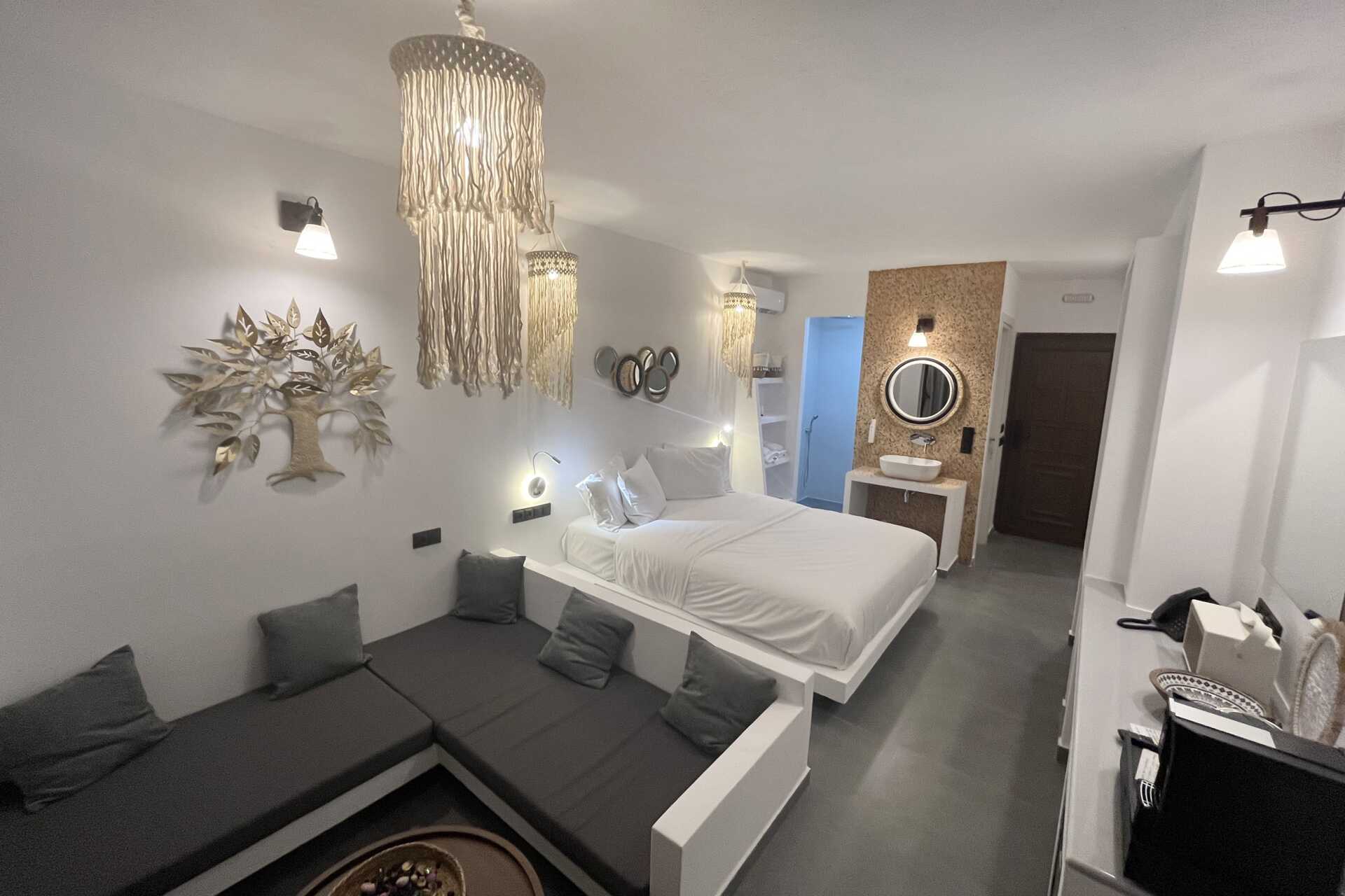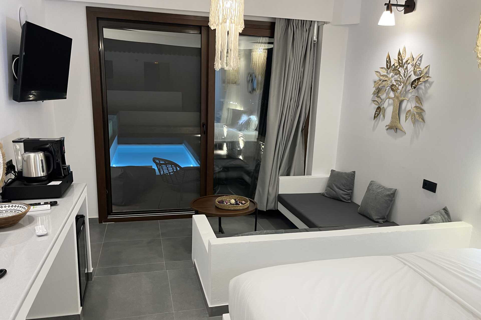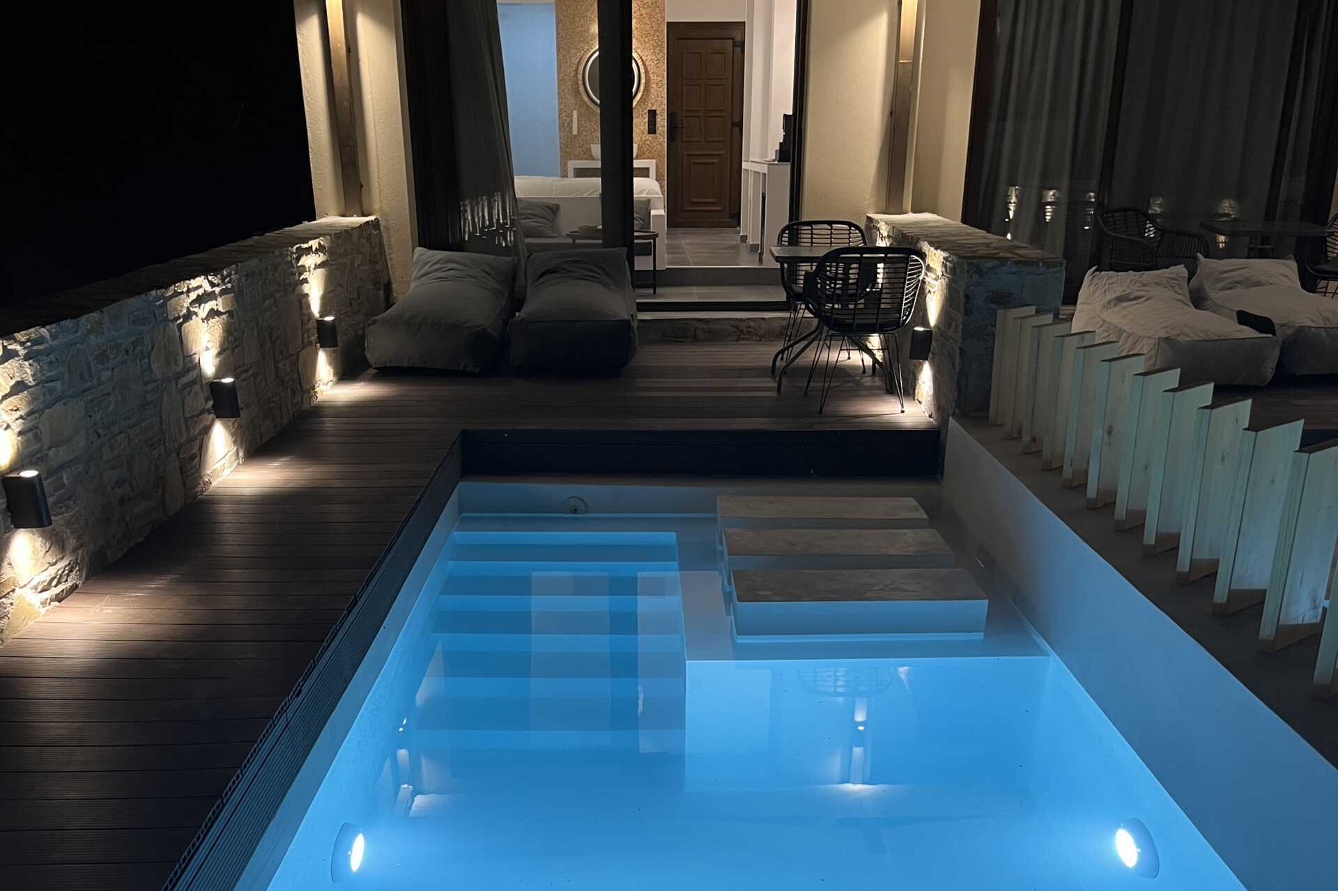 Juniorsvit med privat pool på uteplatsen. På uteplatsen finns en typ större saccosäck. En dubbelsäng. Wifi, luftkonditionering och deponering ingår. Kylskåp. Vattenkokare samt kaffe och te. Tv med lokala kanaler. Bluetooth-högtalare. Hårtork. Badrum med dusch och wc. Städning 7 ggr/vecka.