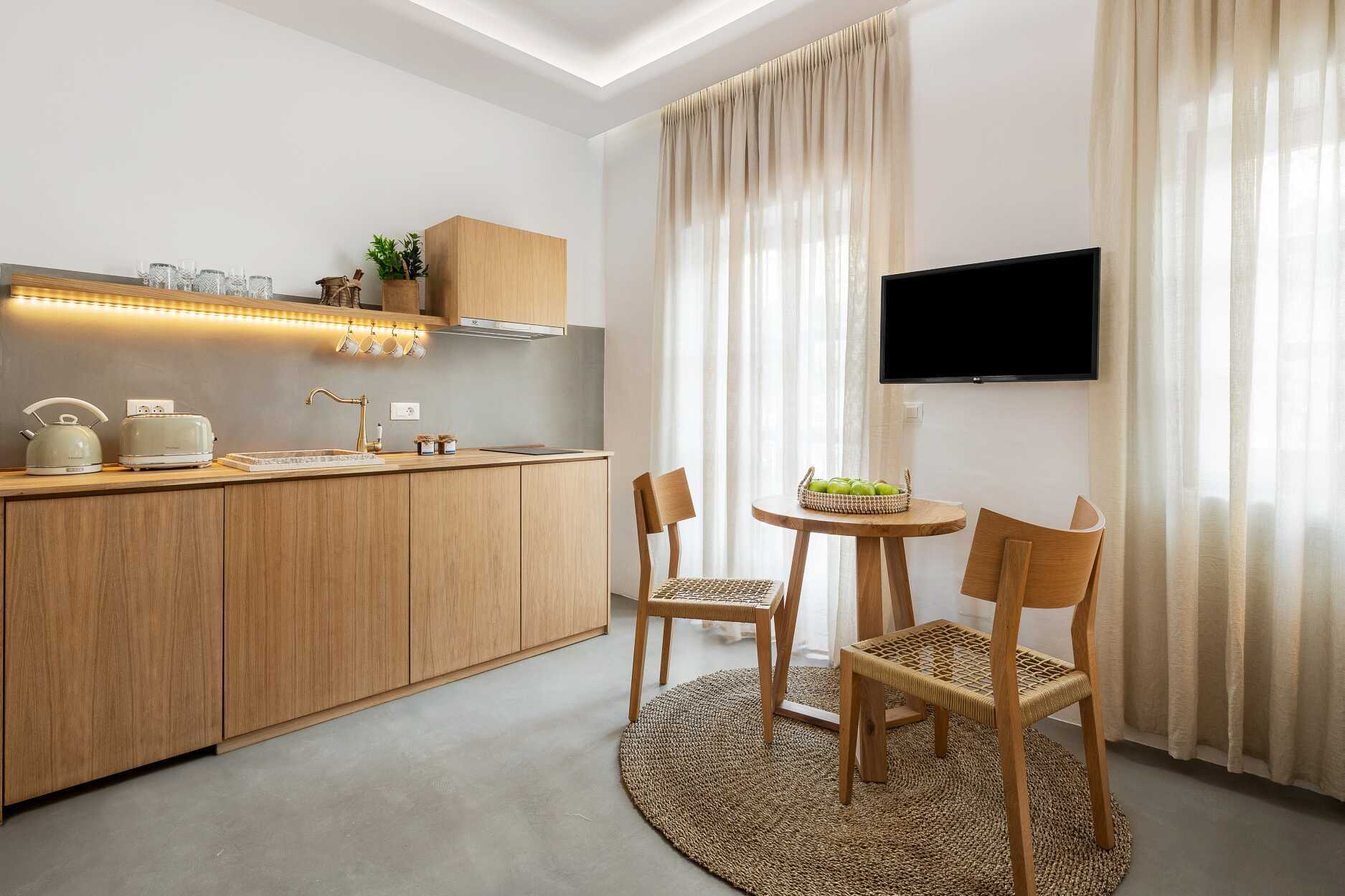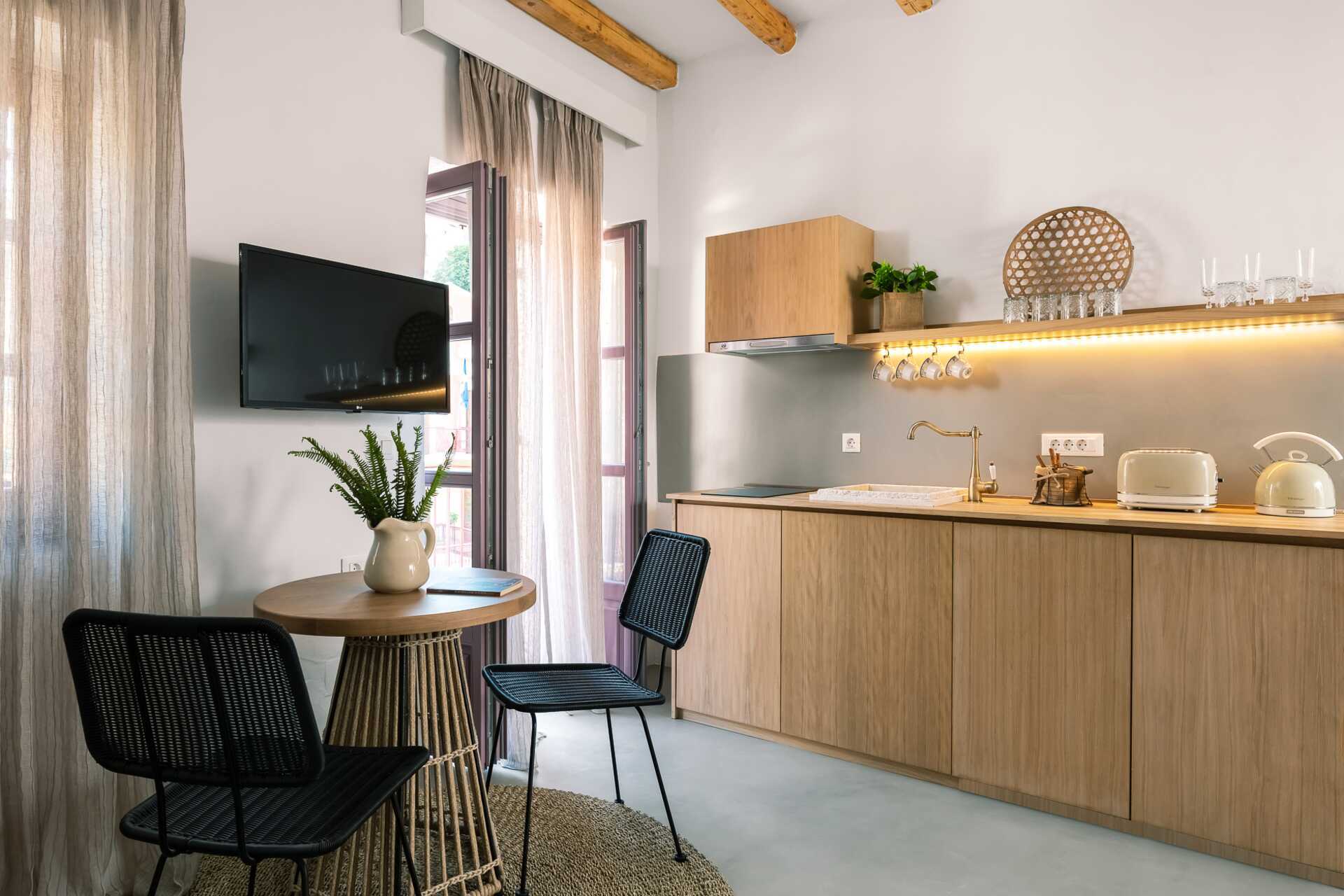 Enrumslägenhet med balkong eller terrass. Sovrum kombinerat med minikök. En dubbelsäng. Möjlighet till extrabäddar i bäddsoffa. Minikök med kokplattor, kylskåp, vattenkokare, brödrost och enkel köksutrustning. Wifi, luftkonditionering och deponering ingår. Tv med internationellla kanaler. Badrockar och tofflor. Hårtork. Badrum med dusch och wc. Städning 6 ggr/vecka.
