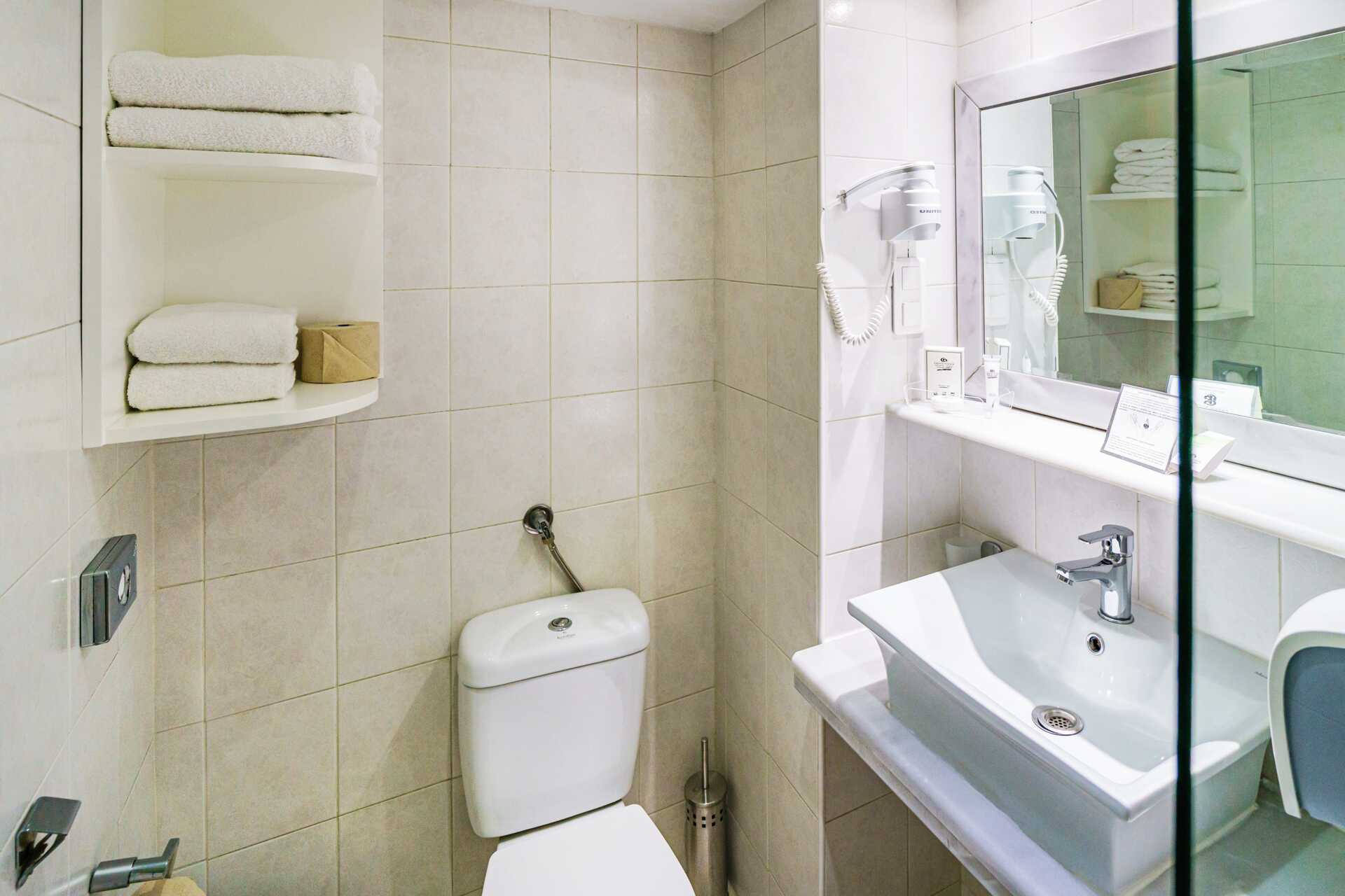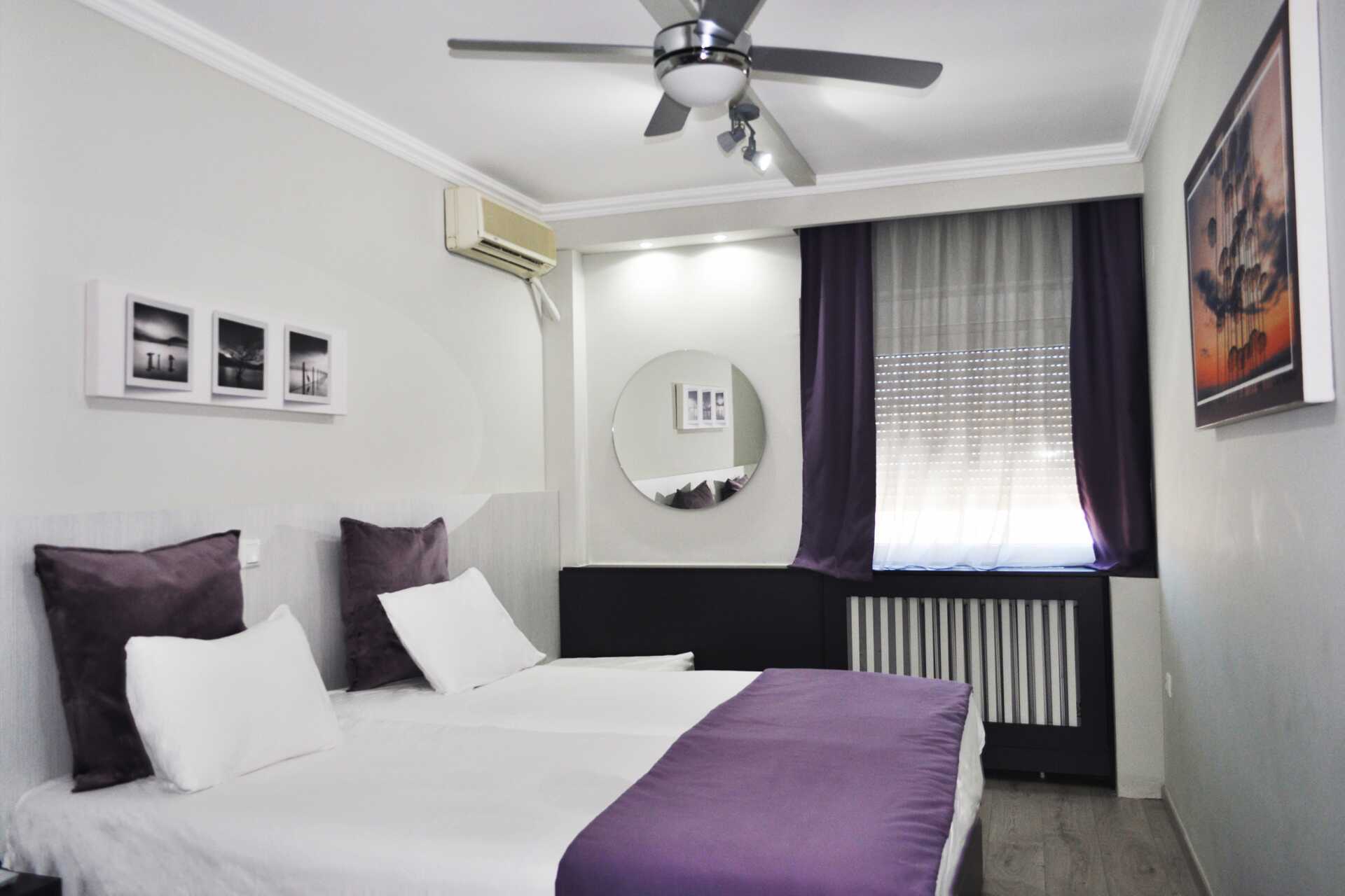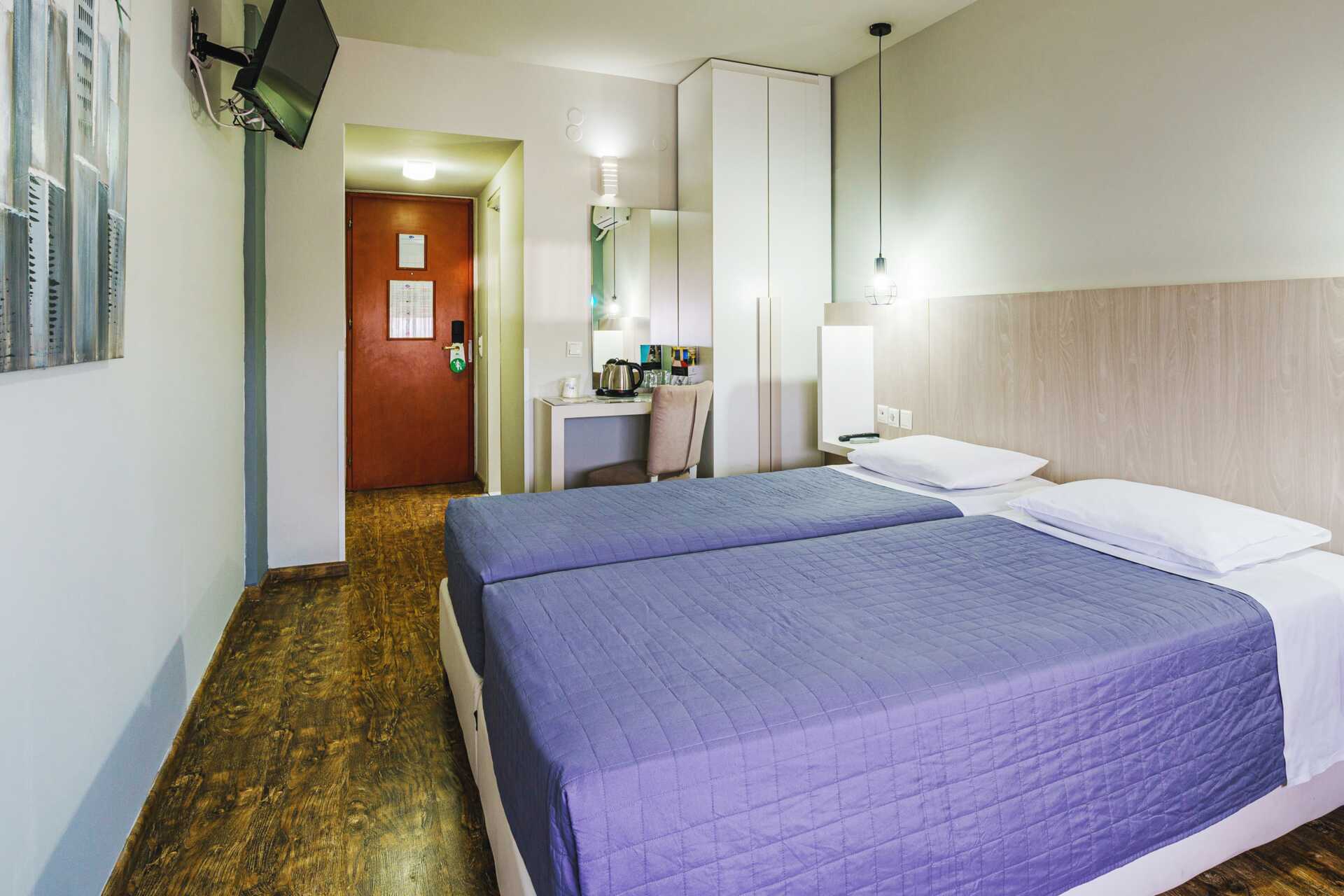 Dubbelrum, utan uteplats. En dubbelsäng eller två enkelsängar. Möjlighet till extrabädd i bäddsoffa. Wifi, luftkonditionering och deponering ingår. Kylskåp. Vattenkokare samt kaffe och te. Tv med internationella kanaler. Tofflor. Hårtork. Badrum med badkar eller dusch samt wc. Städning 6 ggr/vecka.