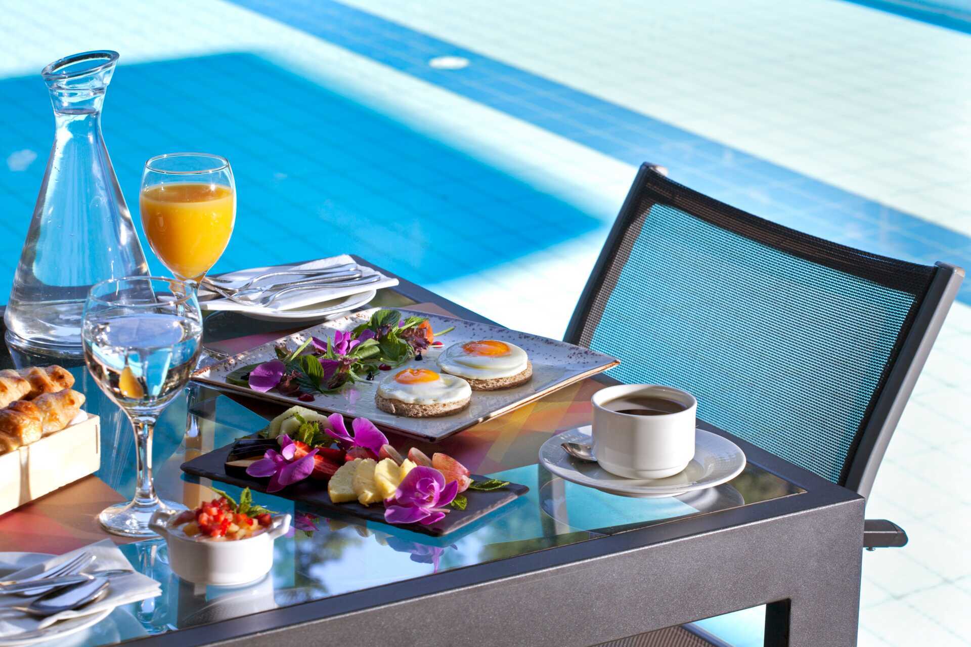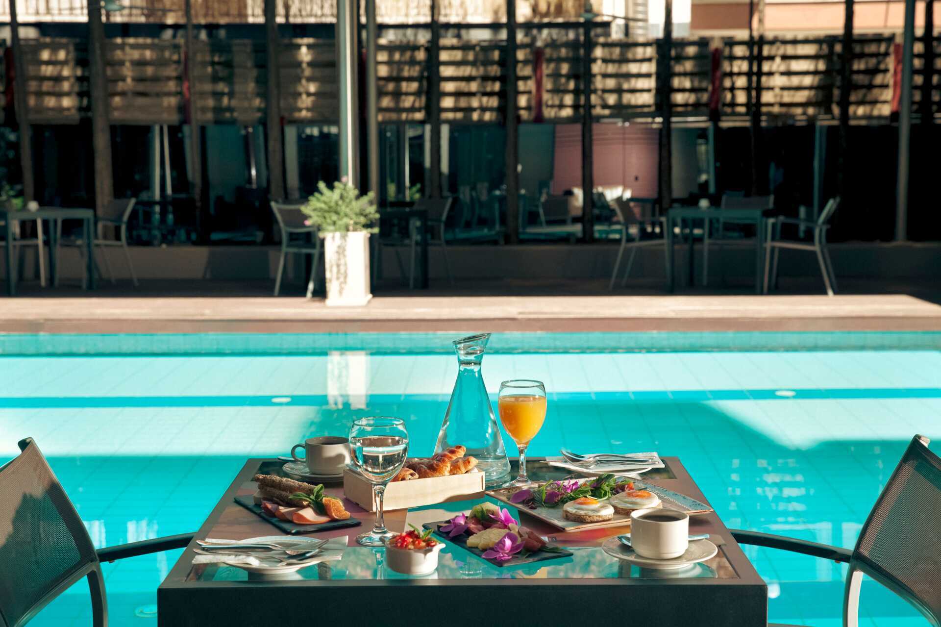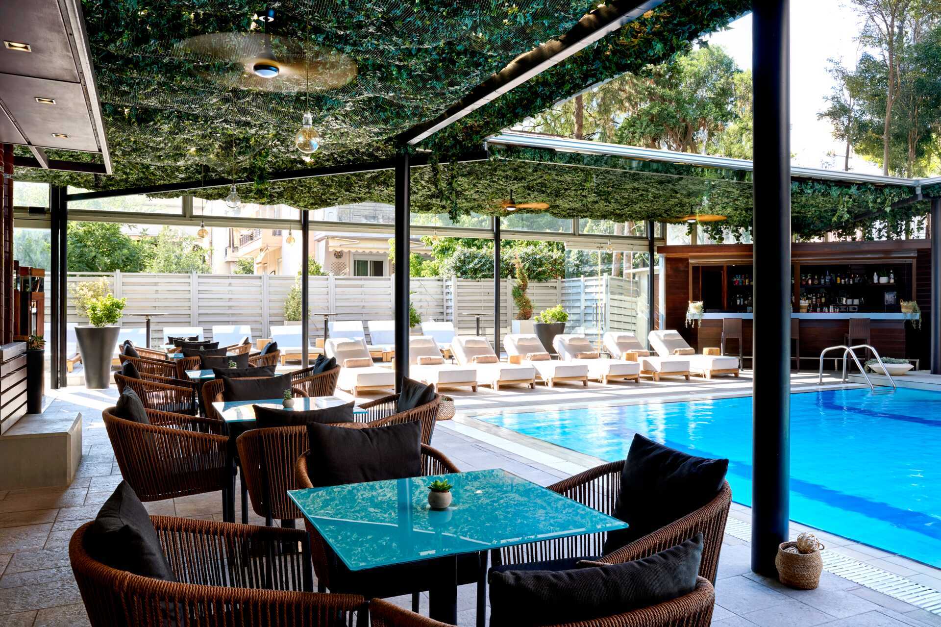 På hotellet väntar ett inbjudande poolområde med solstolar, parasoller och en poolbar som serverar lättare snacks och svalkande förfriskningar.