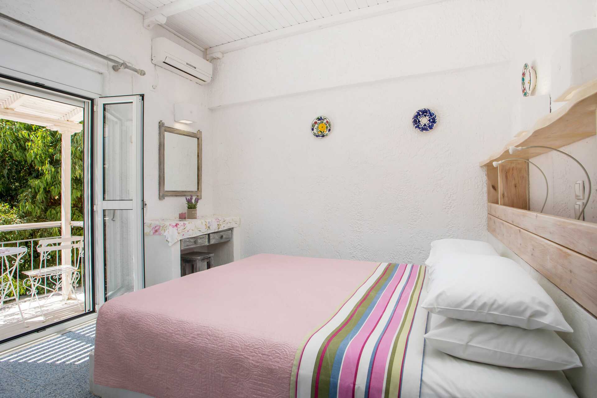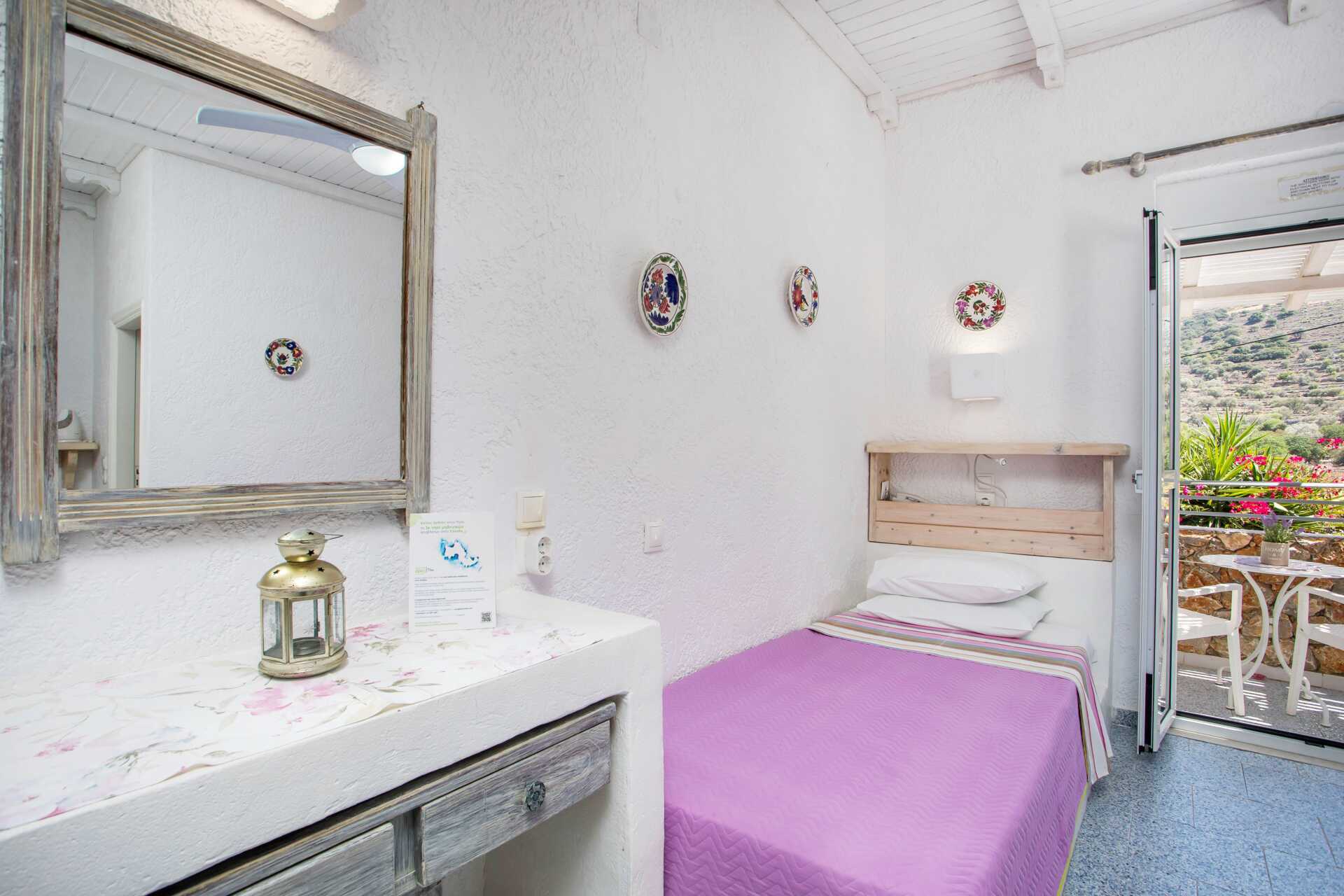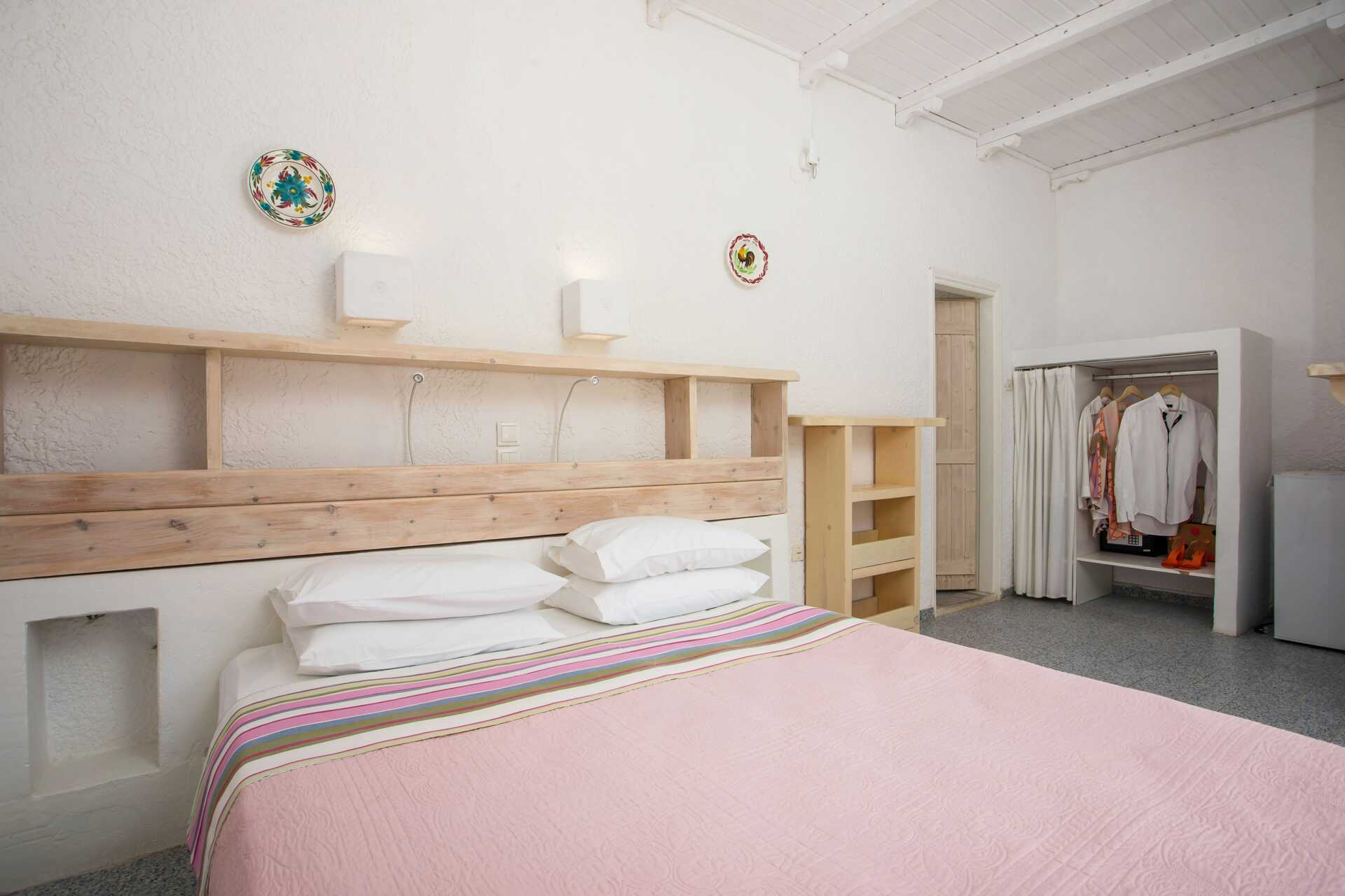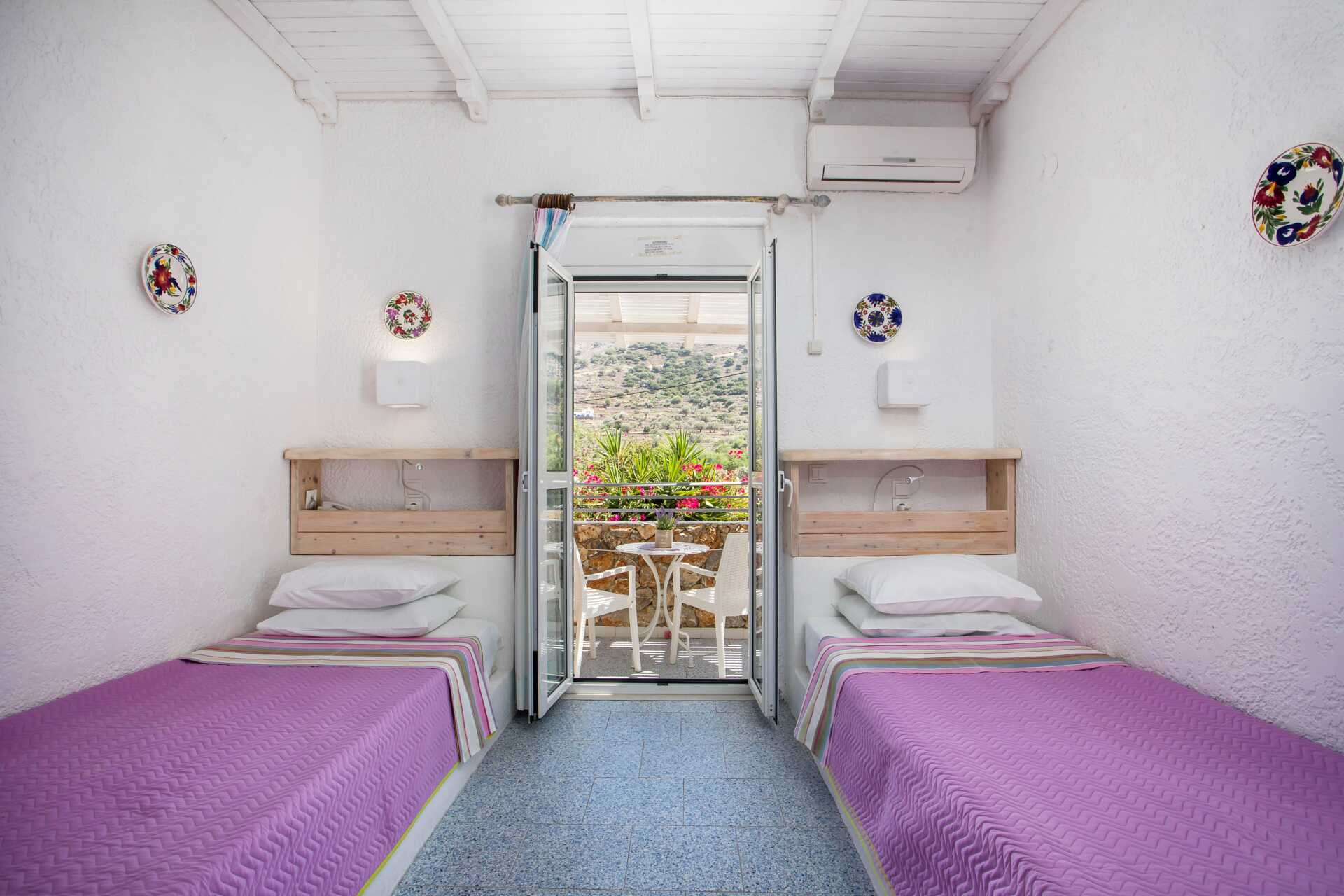 Dubbelrum med balkong eller terrass. En dubbelsäng eller två enkelsängar. Kylskåp. Vattenkokare. Wifi och deponering ingår. Luftkonditionering mot avgift. Badrum med dusch och wc. Städning 7 ggr/vecka.