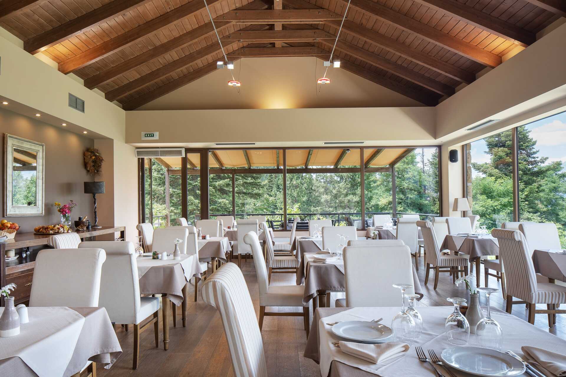 I restaurangen serveras från lunchtid till sent goda rätter där många av ingredienserna har hämtats från lokala producenter, till exempel köttet och fetaosten. I hotellets loungecafé kan du bara sitta ner och ta en kopp kaffe med något sött till, koppla med en bok, lyssna på en podd och se de majestätiska bergen utanför. Hotellets frukost är en certifierad Greek Breakfast och bjuder på dofter och smaker från ekologiska och närodlade produkter och lokala delikatesser.